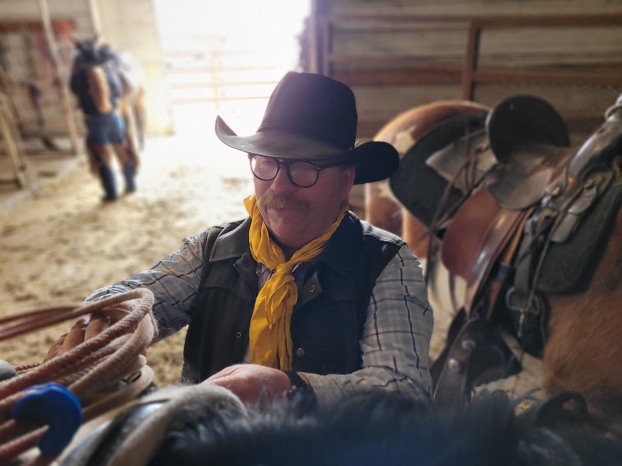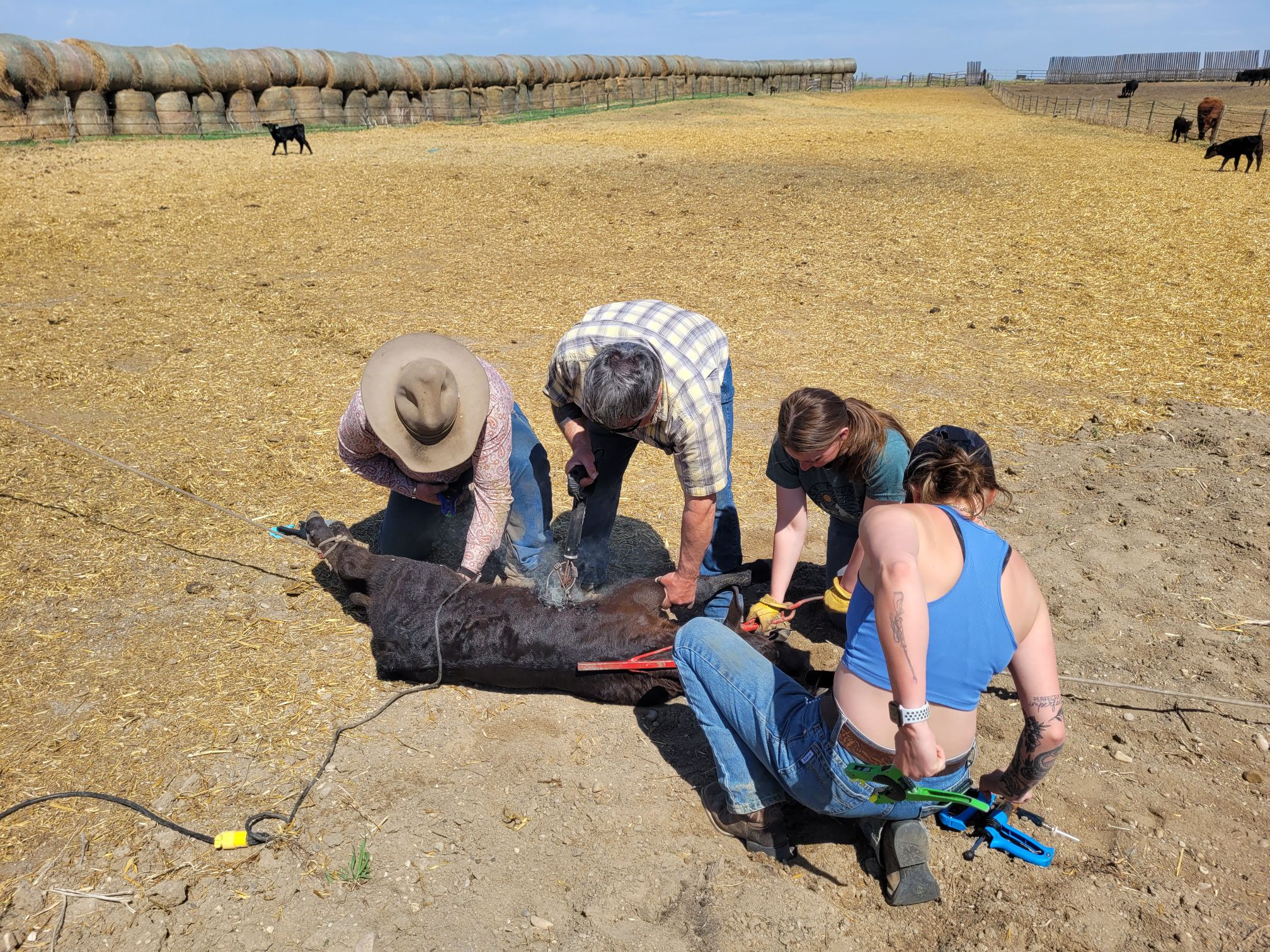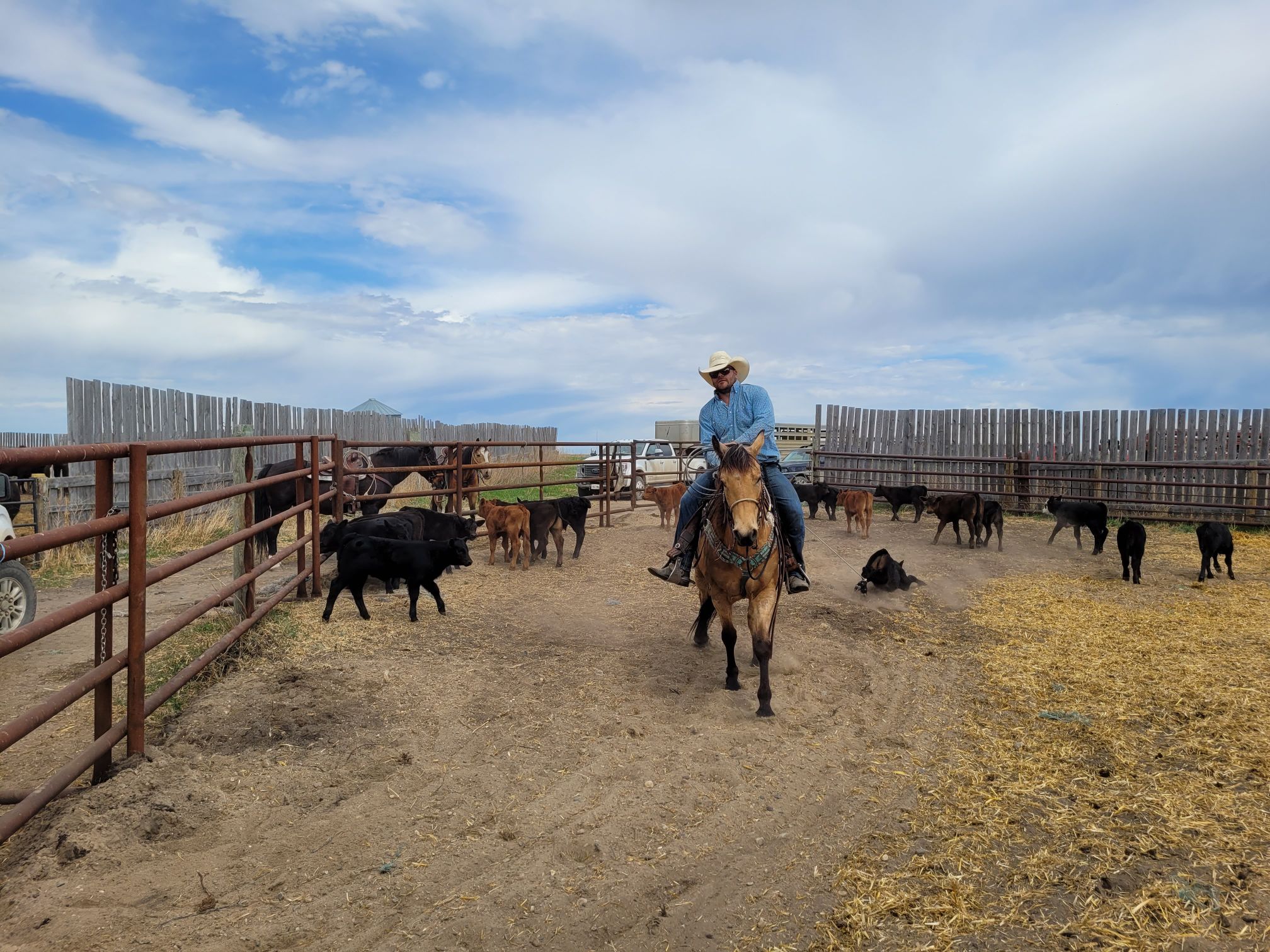 Cowboy David joined the crew on Saturday. They had a tricky job with some extra challenging conditions, including our dog Knightwing acting badly, but these four prevailed and got the job done.