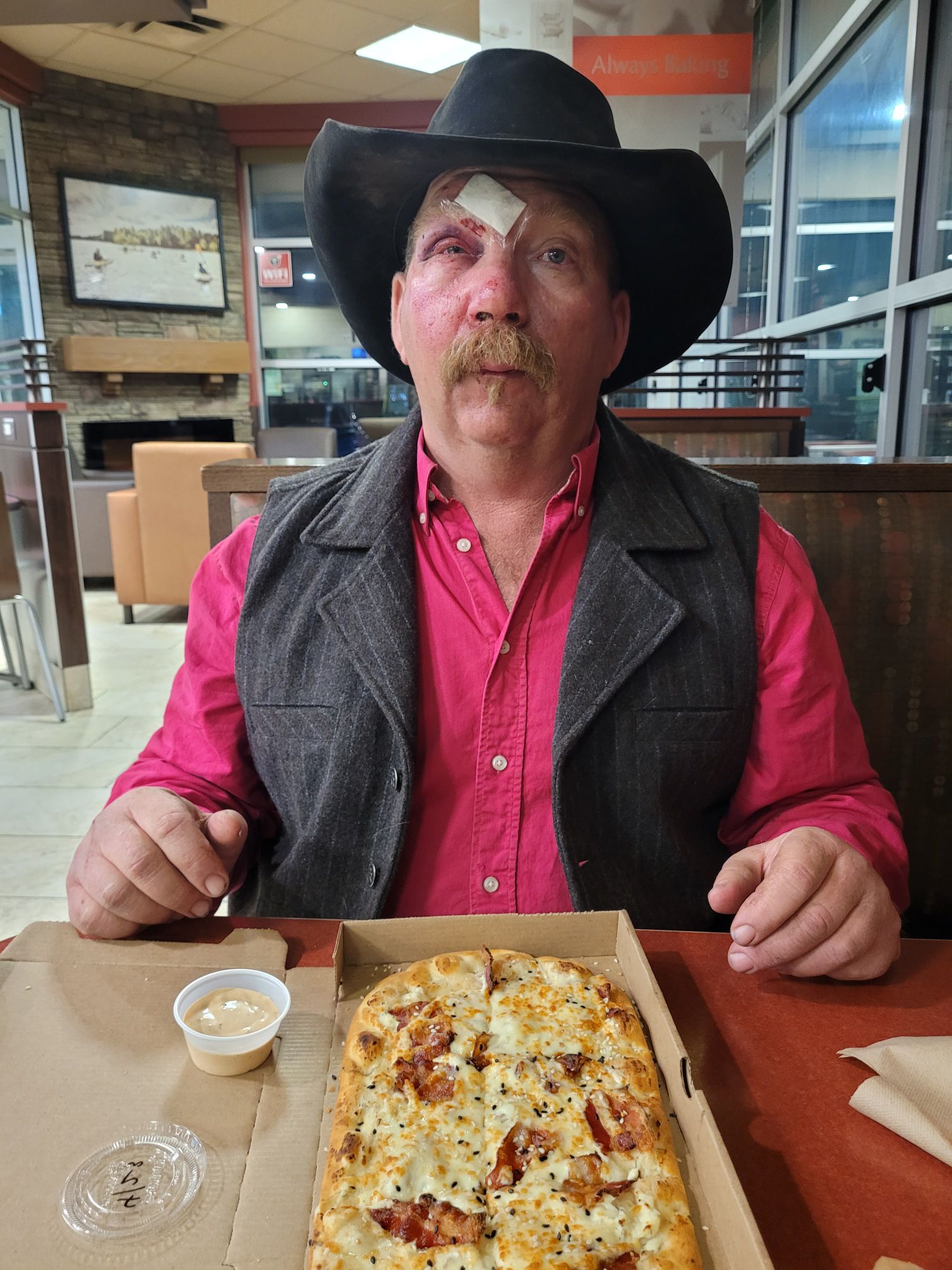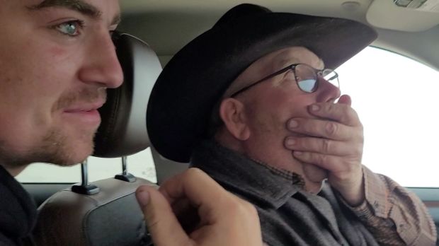 Around supper time, while moving pairs one of our grumpy cows charged and hit Russell’s horse and she hit it hard. This made Sundance buck and despite Russell’s best effort, staying on his horse so long and traveling such a distance that the grumpy cow was no longer a threat when Russ hit the ground, well, he hit the ground, and his glasses broke his fall, and broke, and cut him and the impact fractured his eye socket. Before the following picture was taken at 10:40 at night we had been to the Oxbow ER, Dr. Botha had stitched Russ up and ordered an immediate CT scan at Estevan to ensure there was no blain breed. He had also hooked us up with a specialist in Regina to assess vision issues. We had brought a farm truck to Oxbow, thinking we were only going for stitches, but when it became apparent we needed to go on, with my Bronco in the shop getting struts replaced, and not confident at all that the old farm truck would get us all the way to Regina I borrowed a vehicle from my friend Sandy in Oxbow. What a gift to have generous and supportive friends. We got the CT scan done and were in Regina by 1:30am.