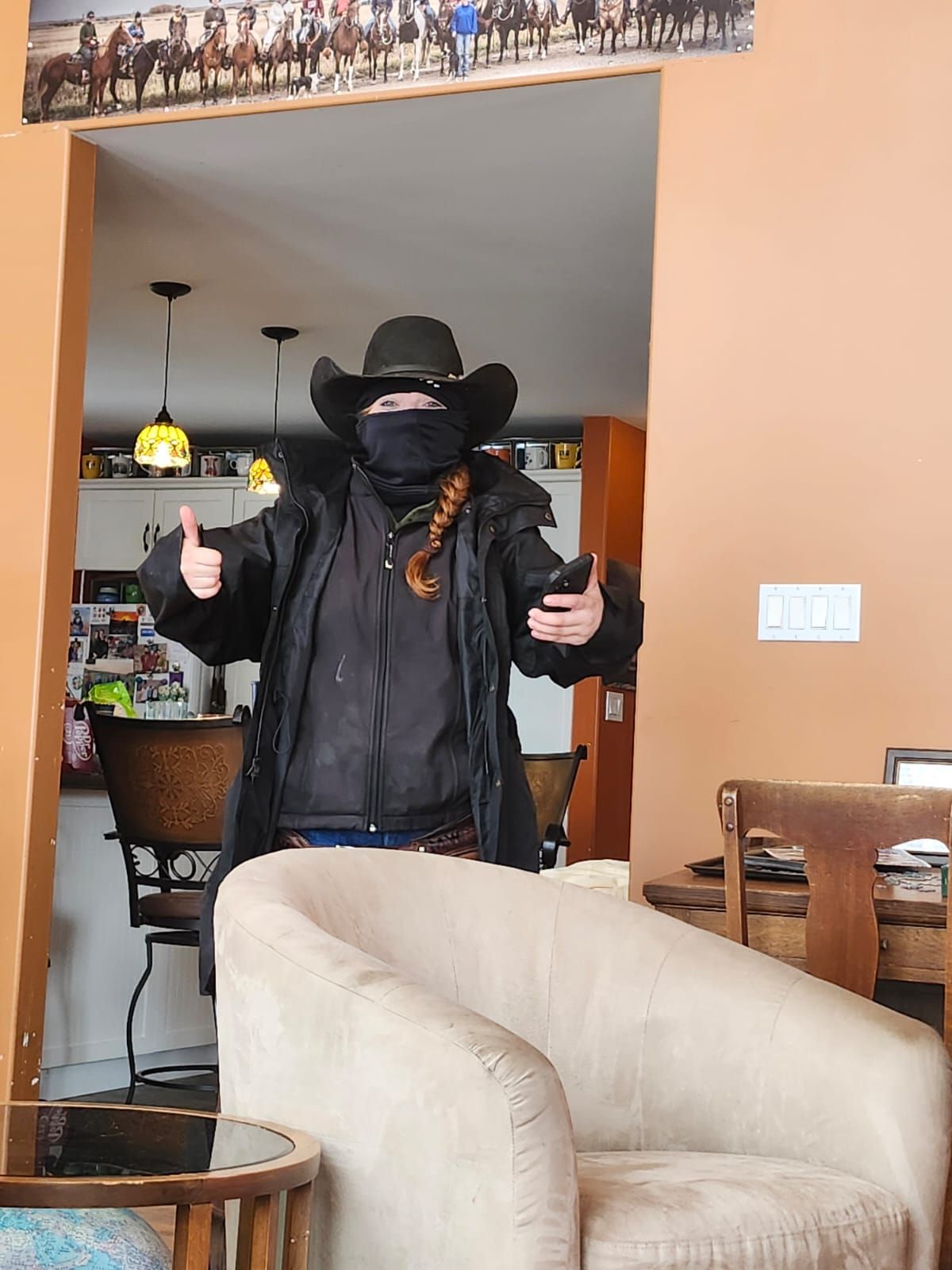 Meanwhile, back at the ranch, our kids, Clare and Ron were the crew handling calving and the weather had turned snowy overnight. Here is Gina dressed for the conditions.