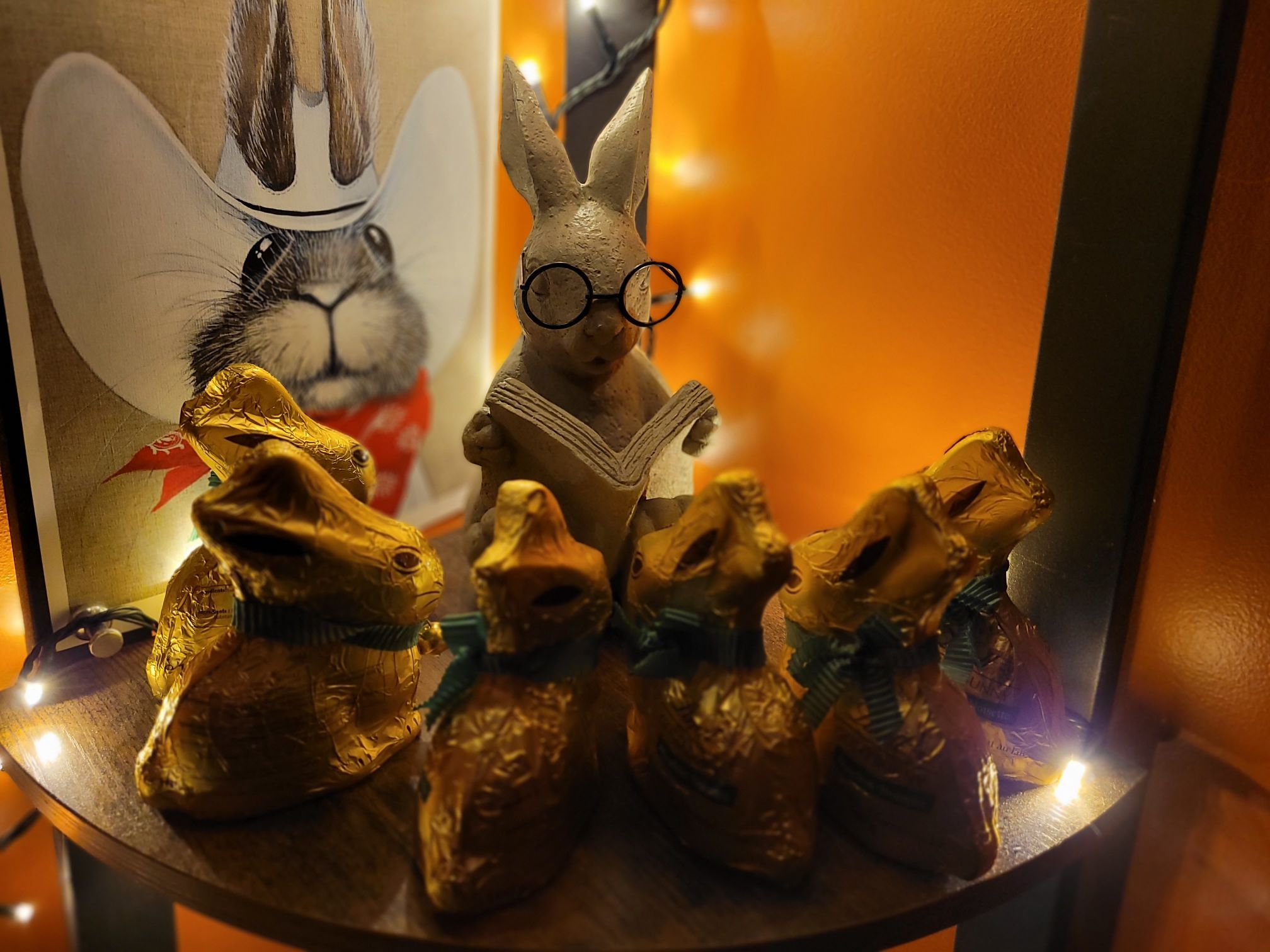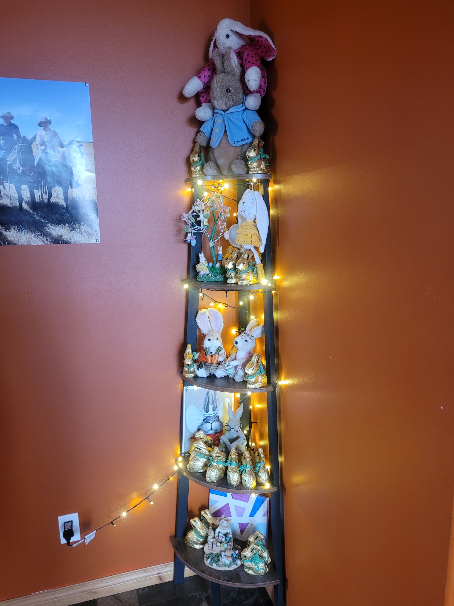 There is a little story about why we recently started collecting bunnies. It led to a seasonal “bunny tree” in our hallway. When Russ got a minute he nestled all his treasured Lindt chocolate bunnies among the others. It is very cute.