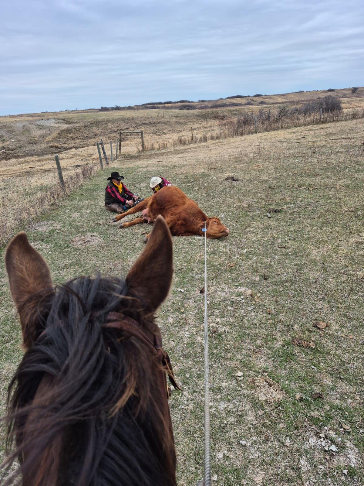 It was strange when my phone rang at 8:45 and it was Patrick, one of the cowboys on the trail. My heart was in my mouth as I answered and true to my worries his voice was shaky. Russ was ok but was doing all he could in the first moments of a crisis with Coffee dog, holding his hand like a cinch on Coffee’s upper leg to slow bleeding caused by a deep cut. I needed to come. I dropped everything, changed into work pants, a jacket that could easily be laundered, I grabbed my rag bin and hit the road. Russ used a scarf of Sharon’s to create a tourniquet, loaded Coffee in the truck, Sharon and Hannah left the crew and headed my way. Enroute to meet them my job was to find a vet. We are so incredibly lucky to live in an area with several vets. I can’t state enough how huge a reality this is. I was so incredibly thankful when I found that one was available. Sharon, Hannah and I met part way just as vet details were getting finalized. I told Dr. Sid I could be there in 20 minutes, thinking after that was not true, I had more than a 20 minute journey ahead of me. It turns out I made it in 18 and beat him there. I stayed with Coffee until her general anaesthetic took effect and then sat in the waiting room. A second vet had been brought in and I was not needed, I didn’t realize a second vet was near and had imagined myself helping with the procedure. I like to think that I can do what is needed when necessary but I was quite relieved to have time to sit, breathe and message. It turns out that the profuse bleeding was caused by a cut artery. Noone knows what happened to Coffee, the first sign of trouble was that she was chasing cows with blood spurting out of her leg. What makes the most sense to Russ is that she cut herself on an exposed culvert. Murtada the vet observed that Coffee is brave and Sharon later reflected, she is resilient, she needed everything she had in these moments. I would be lying if I said experiences like this don’t affect me. At face value its just darn hard, but its triggering, hurt people and animals are all too common an occurrence in my world and there is some interior management required. As I sat in the waiting room I challenged myself to be totally honest. What I was facing down in those moments is how incredibly vulnerable I/we were. Russell, Dr. Sid and Murtada saved Coffee’s life, they are all that stood between a level of emotional devastation that I do not want to think about and a day that could end up feeling almost normal. I named that to Dr. Sid as we were saying goodbye. I needed to. To meet someone in their utter vulnerability and give of yourself is very holy ground. I stood on that ground with profound gratefulness on Saturday morning.