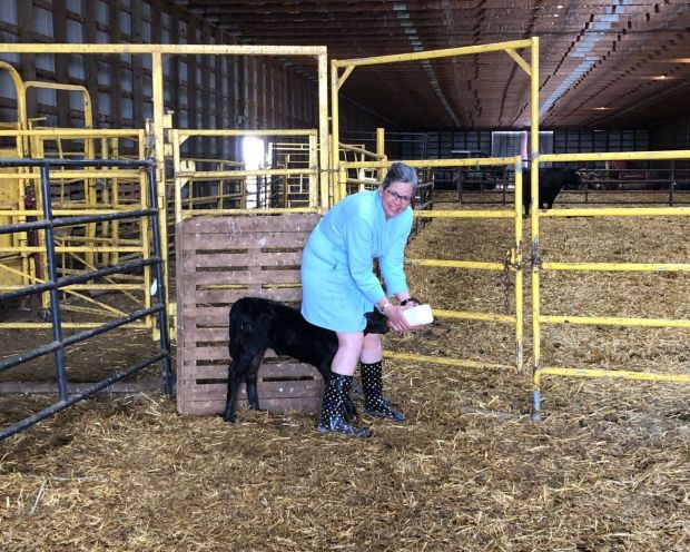 The calf I was feeding was in the trailer which allowed me to see some of the crew at work that day. Cousin Jenn was part of the crew.