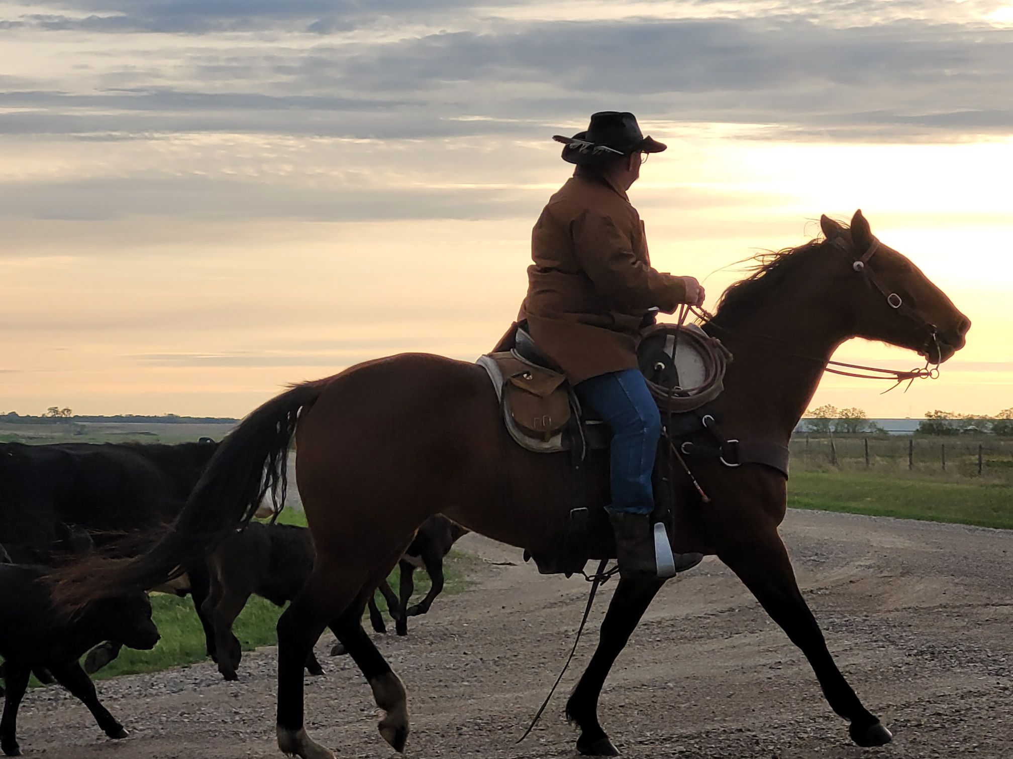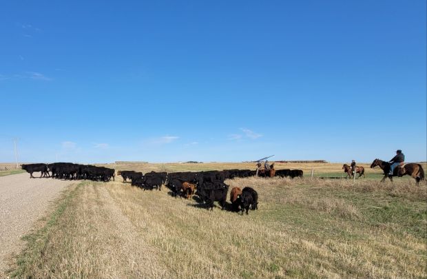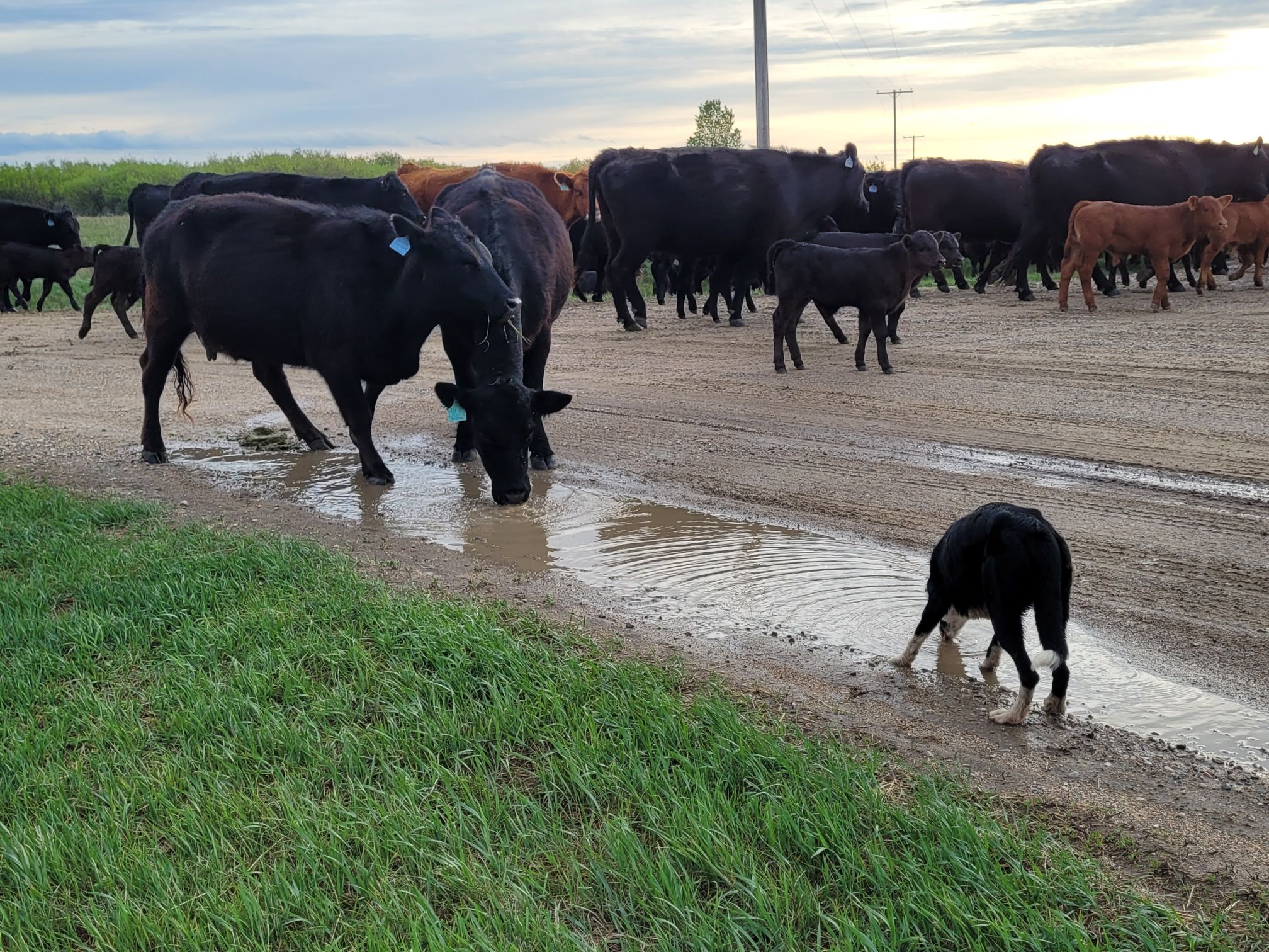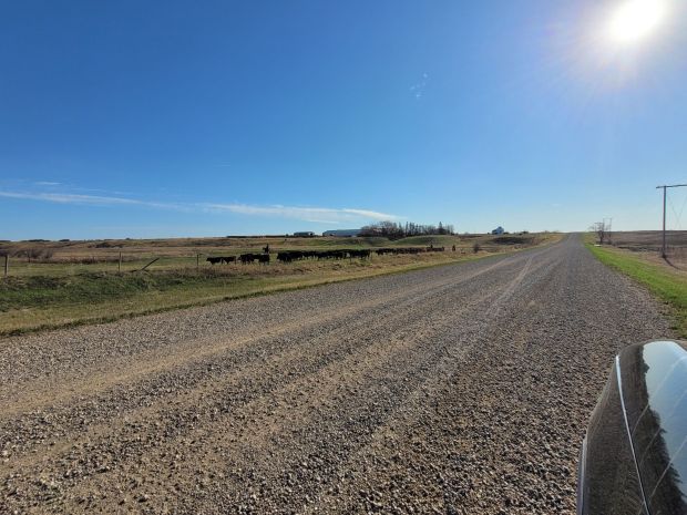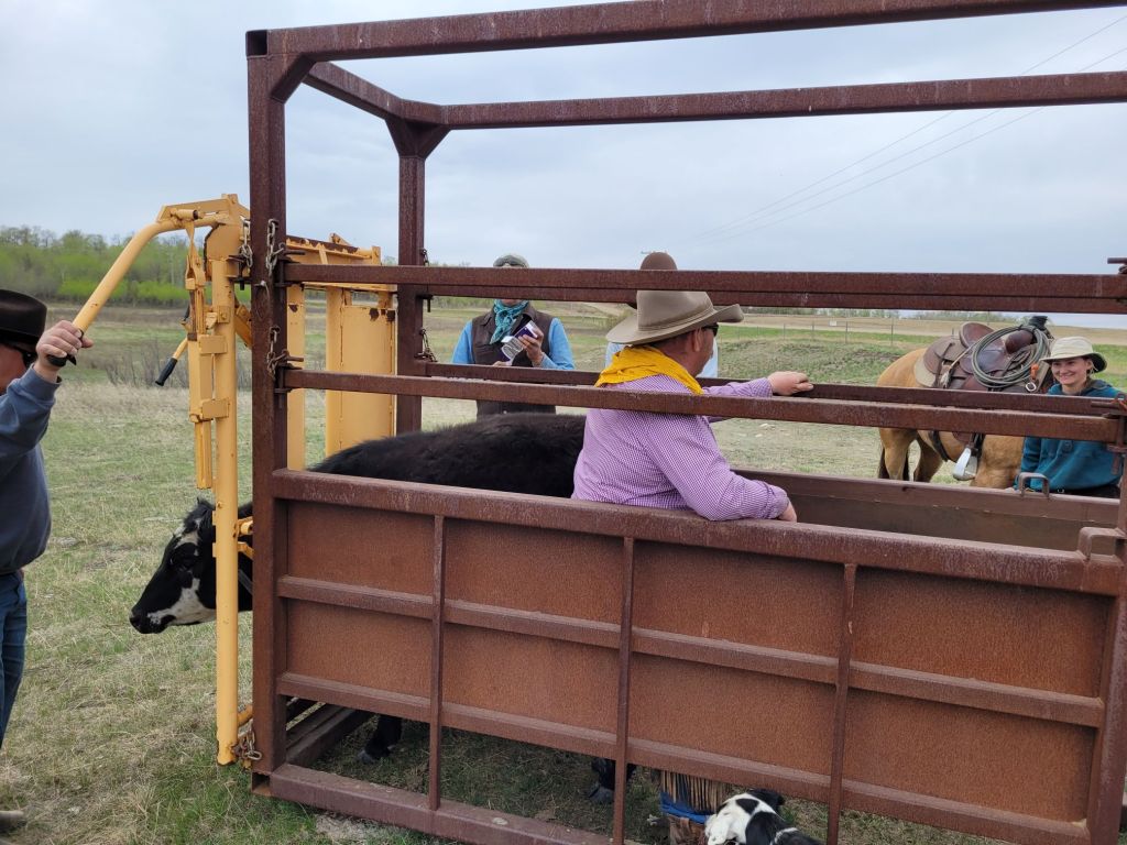 A beautiful evening sky with the cows just about in the gate. During the chase we discovered one of our calves had gone blind and was malnourished. These are hard moments. We are really lucky to have found that our cousins Jenn and Marty have the patience and interest to nurture calves like this one. For many years now we have called them when we have a calf that needs extra time that we just don’t have on an ongoing basis. They have so many success stories. Marty came from their acreage near Estevan to pick this calf up the day after we found it.