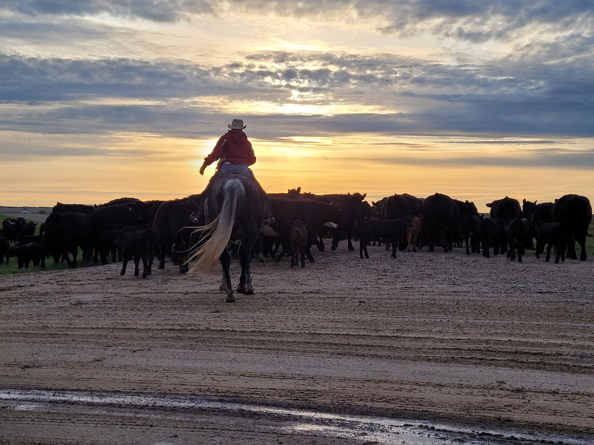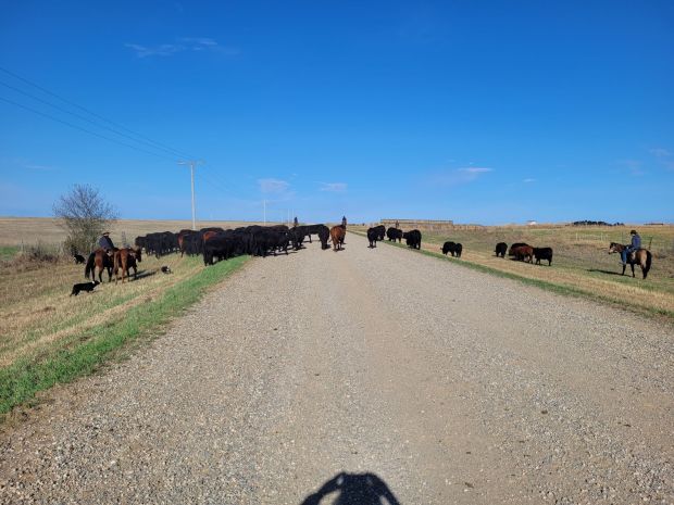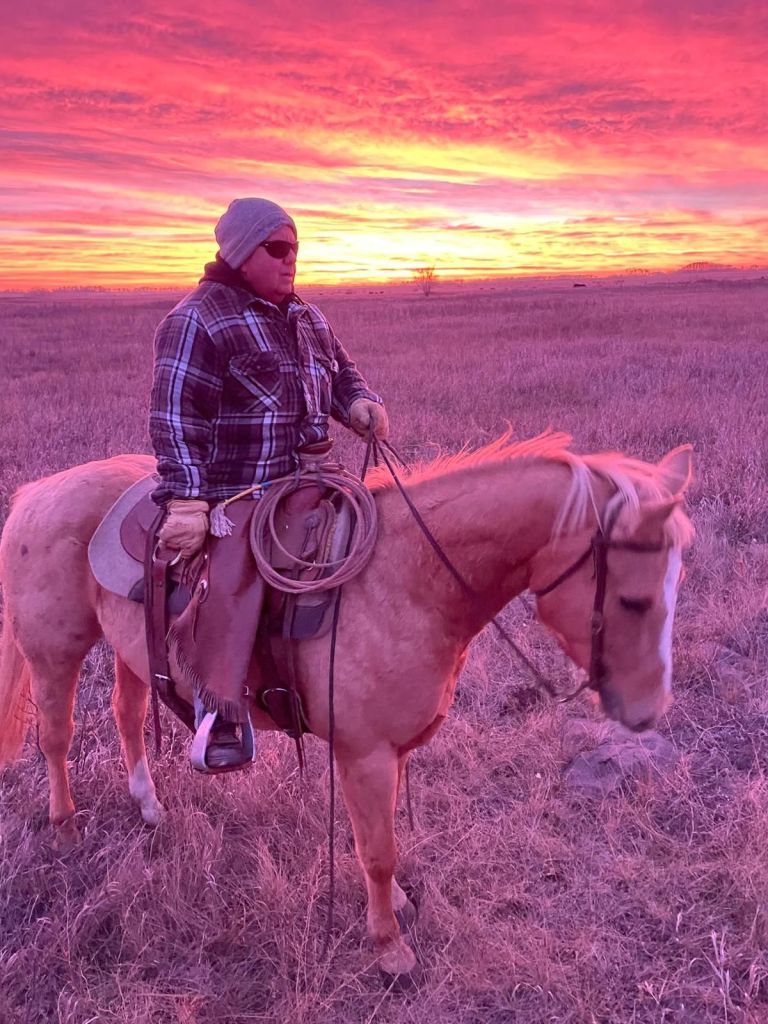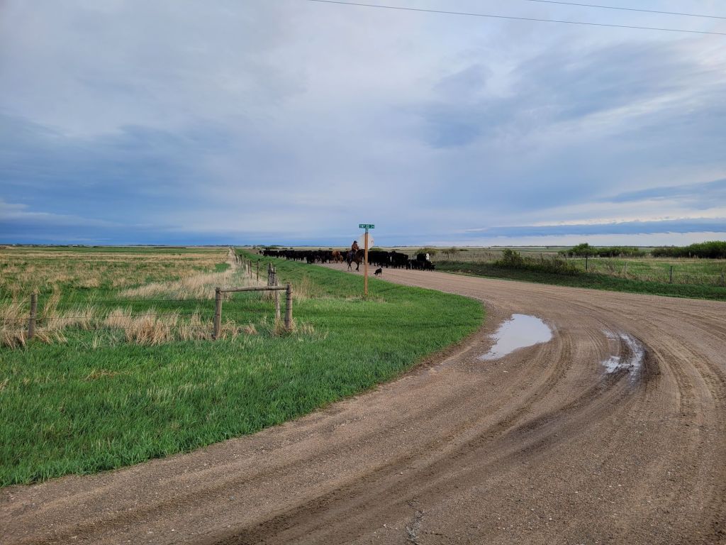 It’s now Saturday evening as I write, this cattle move happened last night, a herd of cows and calves came home for branding tomorrow. It was a crazy move, cows were moving fast, things went wrong, things went right, it was all hands on deck and Clare was worth her weight in gold. I took this picture from my spot where I was perched to turn the cows west towards home.