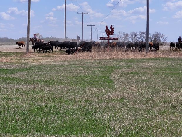 This is the herd moving onto the field where I was set up for lunch. This corner is pretty iconic in our area due to this sign. It has become a marker for all who travel near it. Its a red rooster and the words says “Red Rooster Barn”, I think most of us call it “The Red Rooster Road.” A few years ago we got the chance to buy this quarter, it makes for a good stop point on a day like this.