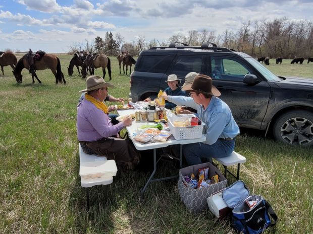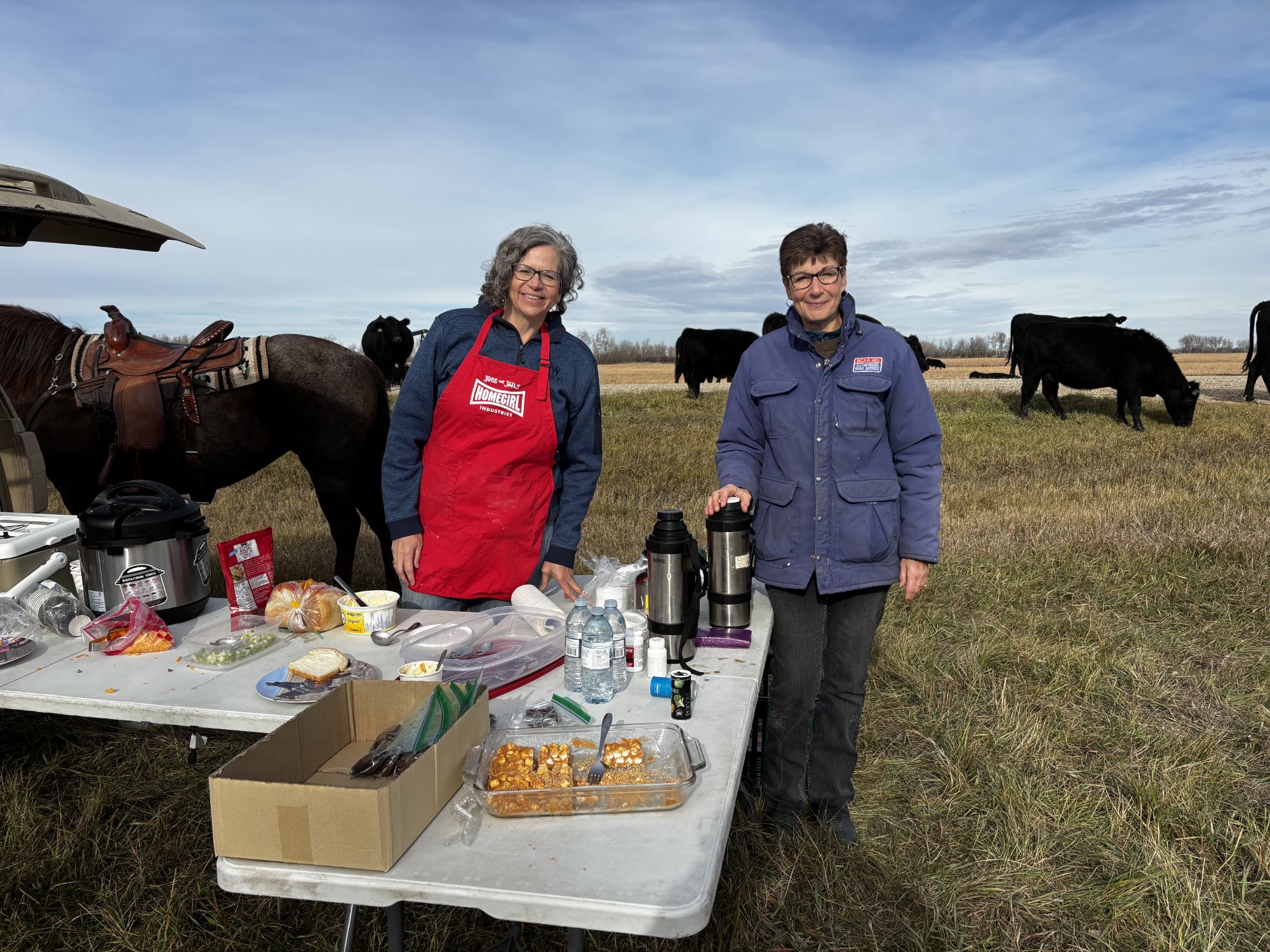 Meanwhile back at the ranch…….Vicki was following recipes and making things happen. She made me laugh when she spoke of her texting with her husband to check in, confessing her lack of felt direction he advised, “stir the soup.” The crew was running a little bit early as it turned out so when Coffee and I returned to the ranch and I got her settled I had to switch gears, it was tough but with Vicki’s help we arrived at the lunch spot only 10 minutes late. This spot has a dugout and grass for the cows so it is a priority to meet there versus wherever the crew happens to be when lunch is finally ready. My time with Coffee meant I didn’t get fresh biscuits made to go with the soups we were offering, knowing this I stopped at the store and got Melita Bakery bread and it was just fine, some thought it homemade. Lesson learned!