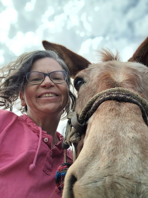 Russ decided to bring Jane our mule on the trail. Her sole job was to follow the herd and tote water bottles. Jane seemed to have mixed feelings about this. Clare did alot of work to keep her going with the herd. It meant alot to Russ. They have a long history together, this marks the 30th year that Russ has put a saddle on Jane. I was riding Jane the day that Russ gave me my first riding lesson in 1999, a day that ended up with him giving me some TLC after I didn’t ride so well when Jane spotted what she thought was a wolf charging out of some bushes, it was actually a big white husky dog but I found the ground pretty fast. Anyways…….as I was holding onto Jane during the moments everyone was getting back in the saddle she and I talked about the good ol days and she suggested we take a selfie.