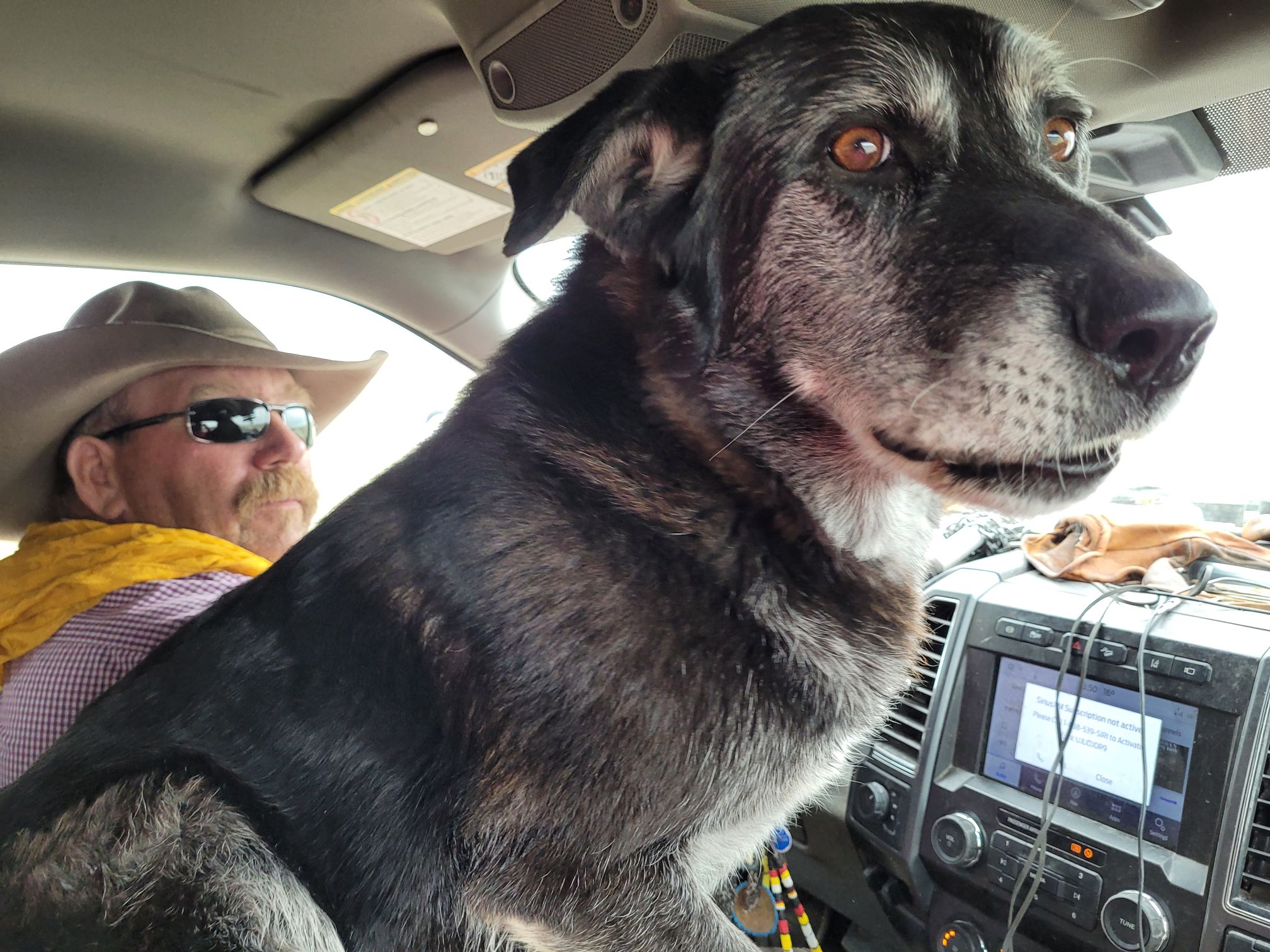 40 seconds before this photo was taken Knightwing was on the floor in the backseat of the truck with her head down. All of a sudden the truck erupted with dog noise. A coyote had been detected. It was a big healthy one. Knightwing was certain she needed to exit through Russell’s window, the two of them blocking each other’s view brought the truck to a stop. Knightwing had work to do, she thought. It was a bit of chaos. By this photo moment things had calmed considerably but I was sharing my seat.