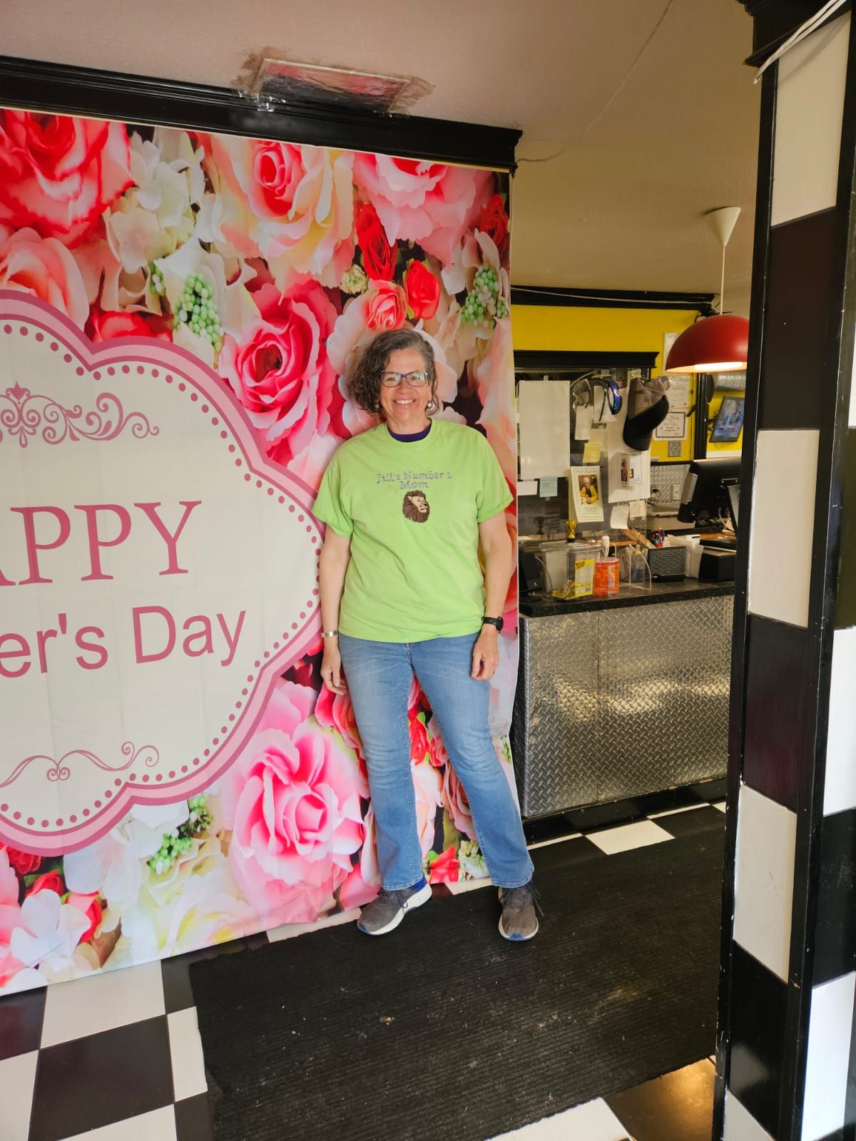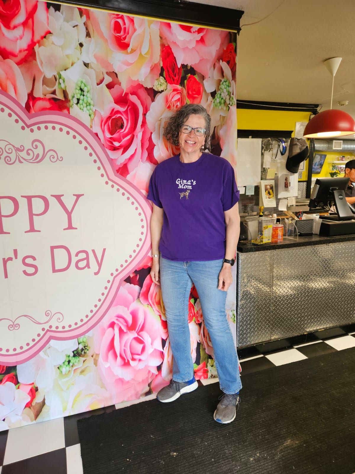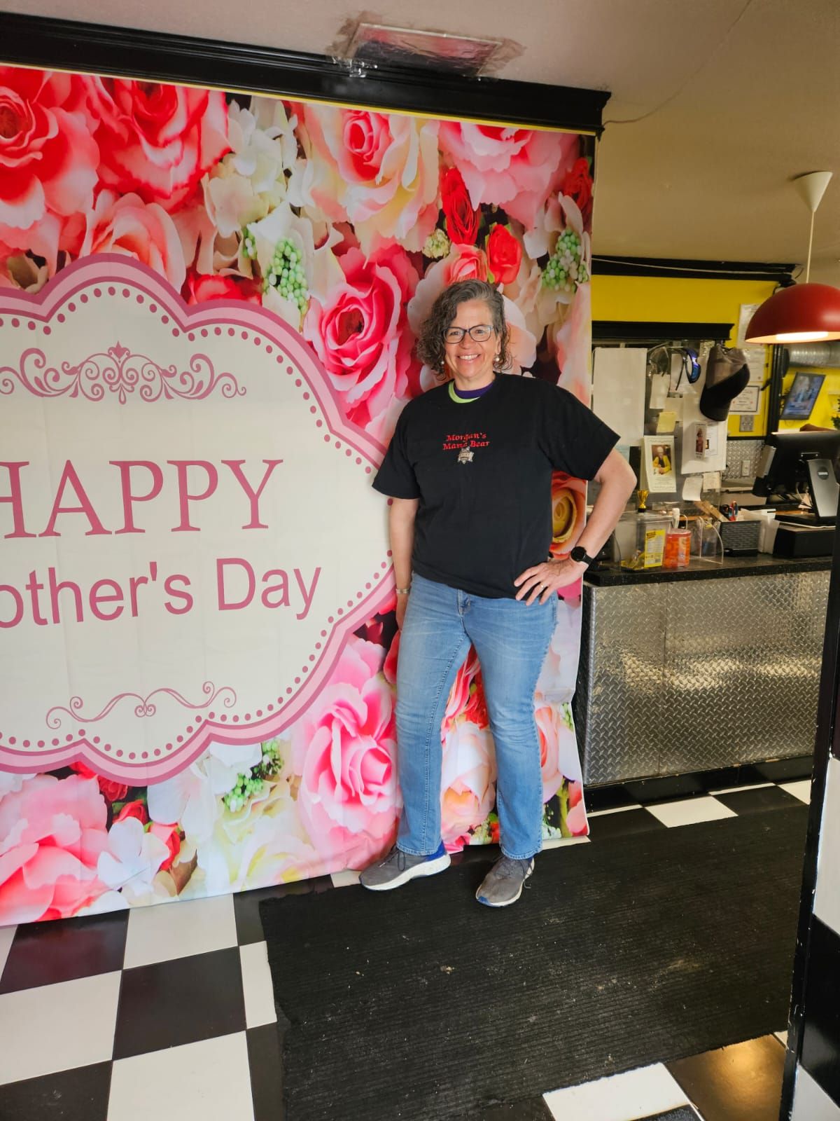 We had decided to celebrate Mother’s Day by going out for lunch with Grandma Shirley on Wednesday. We figured we could really relax only after getting the newly branded calves and their Mamas to their pastures and that meant Wednesday was the day. When I was deciding what to wear I spotted some old t shirts in my closet. They were given to me for Christmas about 15 years ago. The black one says “Morgan’s Mama Bear” with a picture of a sherriff’s badge on it. The green one says “Jill’s Number 1 Mom” with a picture of a lion and Gina’s says “Gina’s Mom” with a picture of a dog. I decided to wear all three in layers and put a sweatshirt over top and then slowly remove layers as lunch progressed. But it didn’t quite go that way. Russ insisted on a photoshoot by the banner at the Flying M. It was fun.