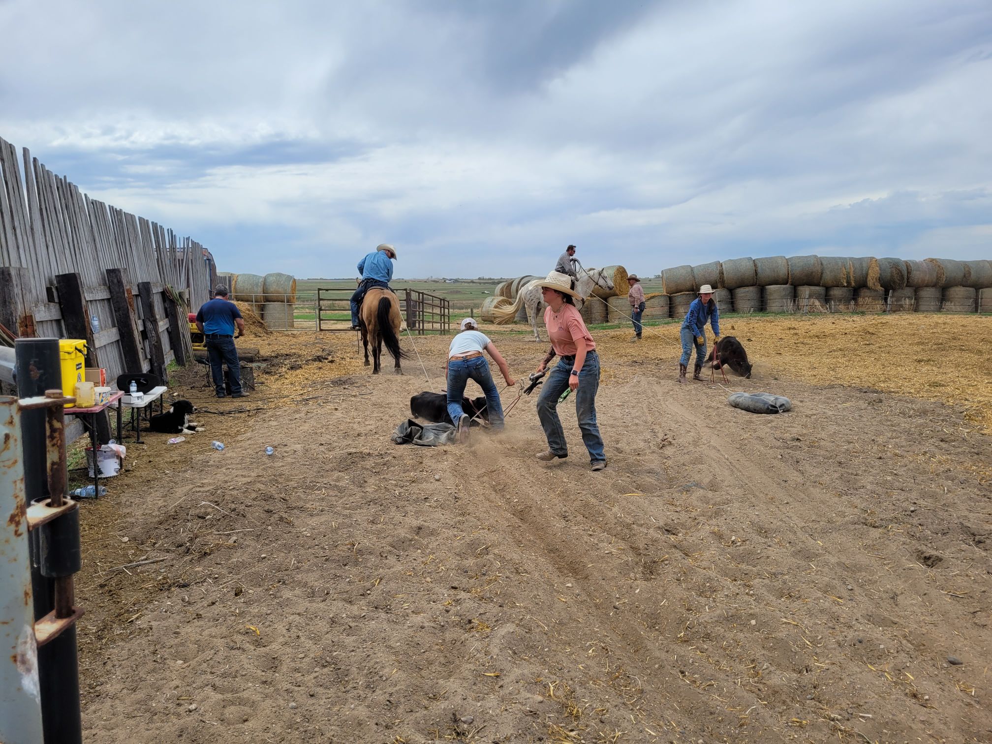 In this picture we have two stations going, Kenzie and Clare are applying the deadman restraints, Trevor and Tyce on horseback are keeping ropes tight as the calves get handled, Laurie is cleaning the iron and Cassia is enroute to the supply table to refill taggers. With three ropers the ground crew was kept very busy.