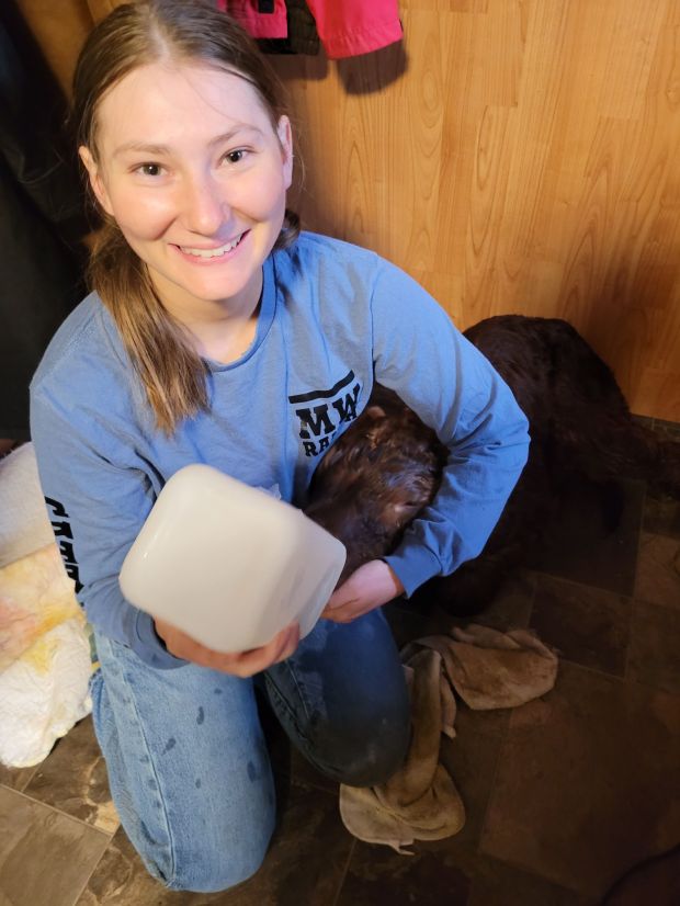 This next picture looks harsh but restraining the animal allows safety for all. While Morgan secured the rope Russ and Clare pulled a calf. Everyone was fine in the end. This is our 2nd calf heifer Hoyt Axton. Clare is starting vet tech training in the fall, she did a clearing of the airways and some massage to get this calf established. Good to have her on hand!