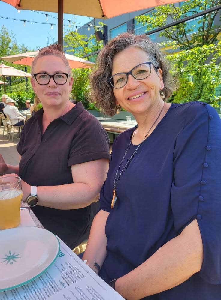 The gift of the day was time among my people, the people I have spent special days with for my entire life. They know me in a unique way and of course are a concrete connection to my Mom and Dad. In this next photo my cousin Jodi sits beside me at an outdoor patio where we had supper altogether and could include Belle. We were lucky Jan and Ray’s schedule was clear after school.