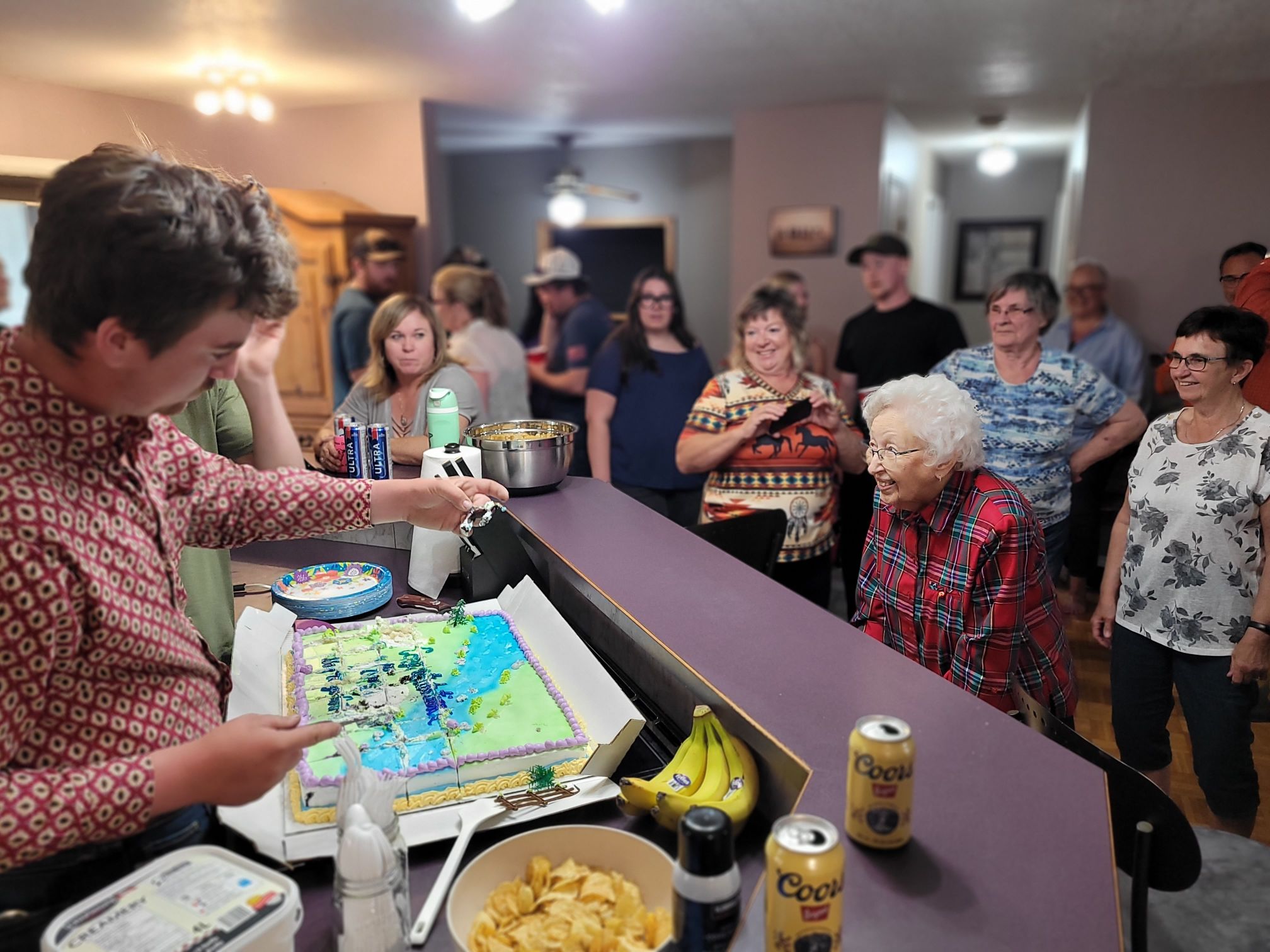 We had this cake made at the Oxbow Co-op. It was delicious!We have many shared friends with Griff and his circle, the party made sense, but we also were able to invite folks like Bonnie and Roy. They have been a part of Morgan’s life always, and have helped fill the holes left by our losses.Morg and Griff cut the cake, Grandma Shirley absolutely loved watching them tackle this. “No two pieces were the same size!” she said. We agreed that was good, for varying appetites.Old friends seeing one another was a splendid part of the night.