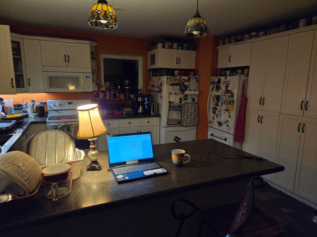 My writing spot today, clean dishes on side.