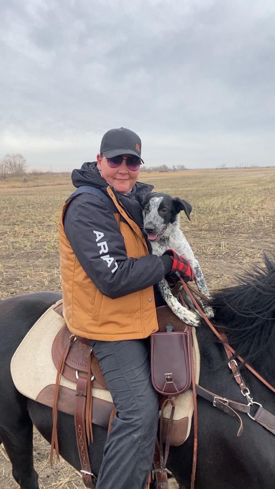 On the trail…..A new and unexpected crew member. We got a new cow dog this year after losing Bingo and Knightwing in the spring and summer. We were not expecting to have Zip on the trail until next year but sensing her good instincts and ability to listen Russ tried her out on a shorter job earlier this week. She did wonderfully. I was so proud when I heard this I wanted to do a whole blog post just about her! A dog on the trail who is younger than most of the calves! (Zip was born May 14th) Based on this success she was brought along on Saturday. In Coffee’s absence, and with Paisley on vet ordered retirement from chasing cows (Paisley belongs to our friend Jen), we only had Maddie and Zip on the trail. She was needed. While not perfect she did super well. She took some rest periods, but not in the truck with Sharon, she rode with Jen and with Becca in their saddles. I love thinking about the view she had, as opposed to her regular perspective where its a lot of angles of ankles.