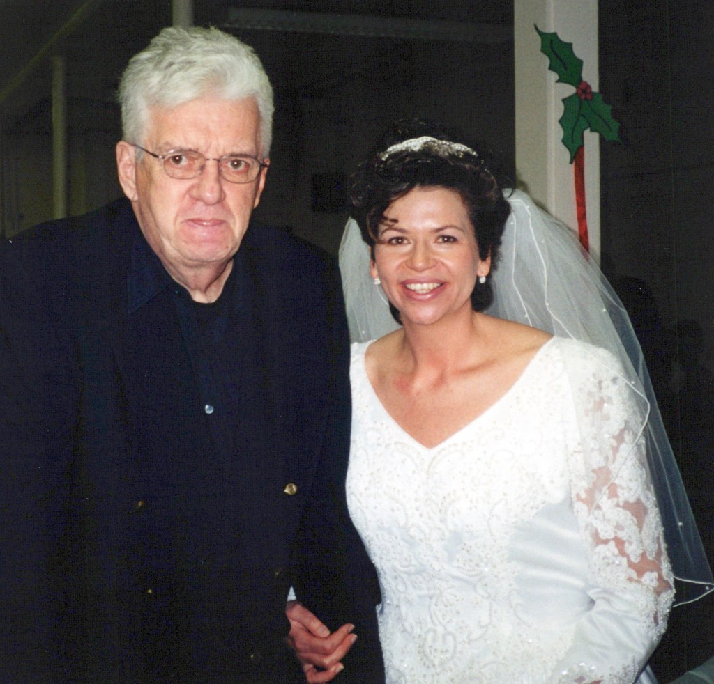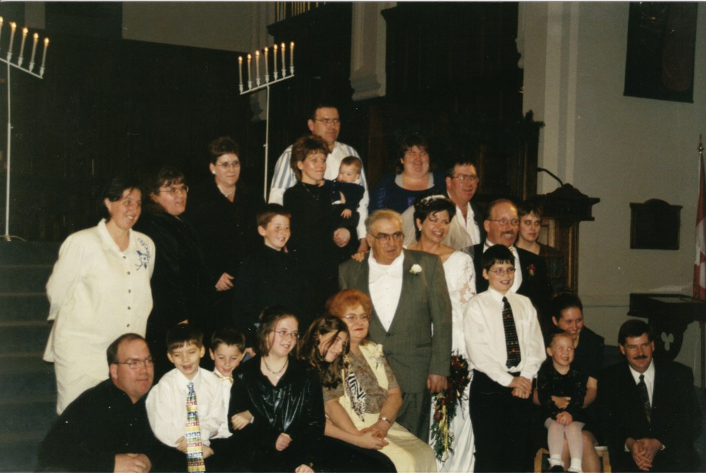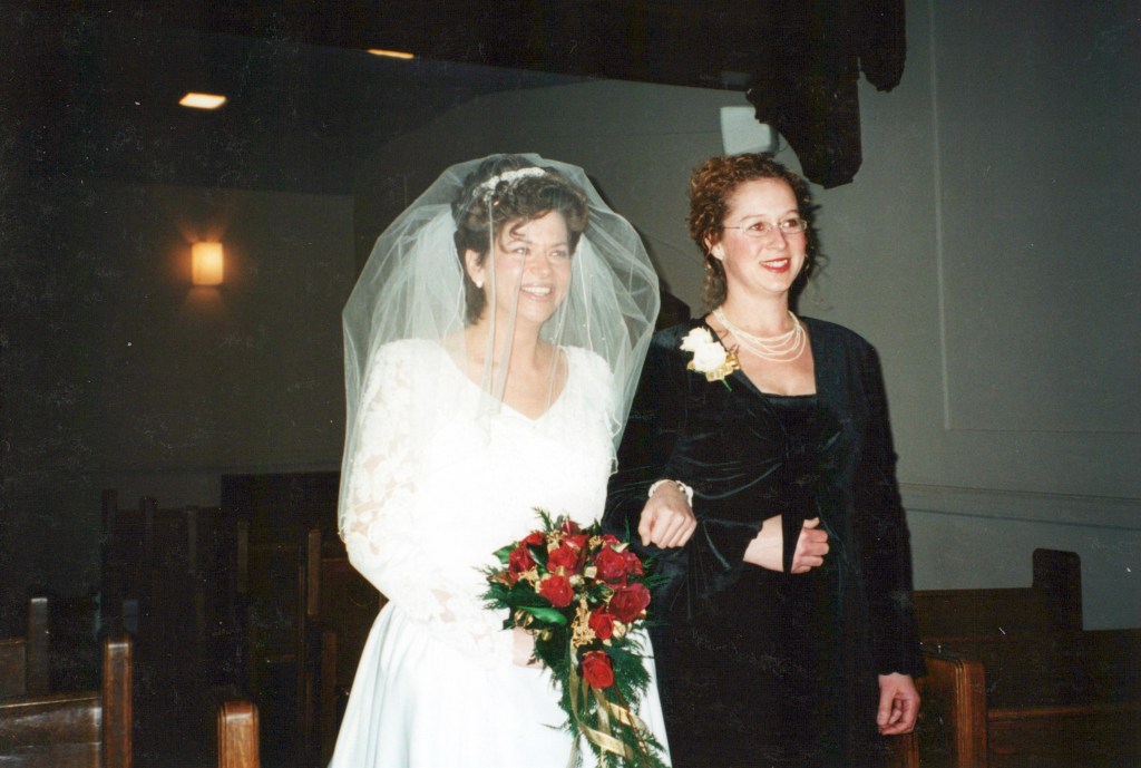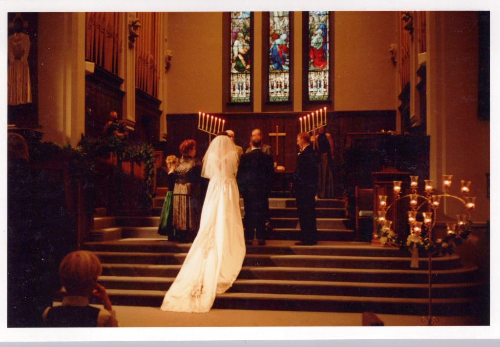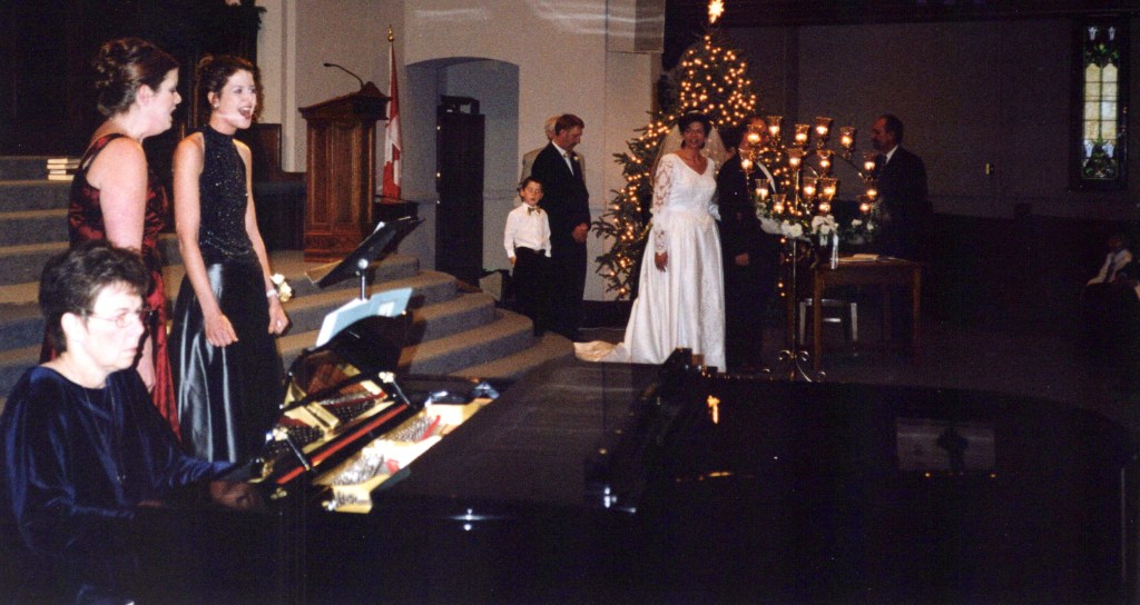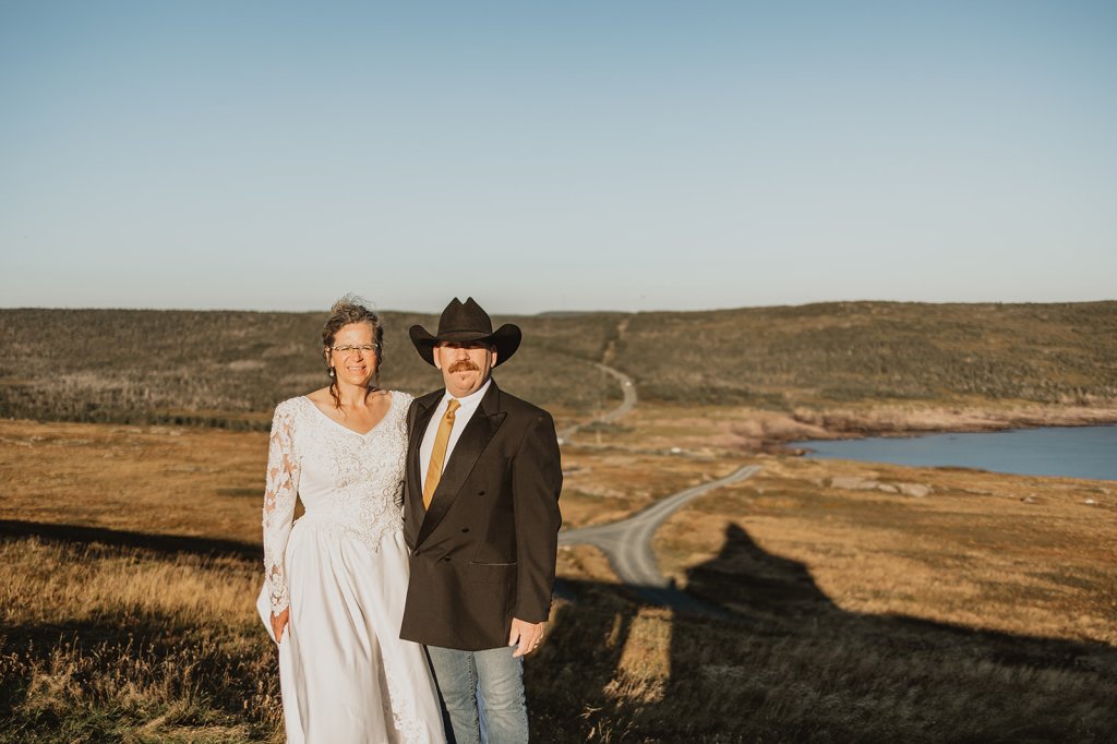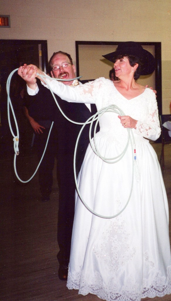My sister Linda escorted me down the aisle as the wedding began. My Dad was not able to, dementia was affecting him. We were married in the church I grew up in, Knox United in Saskatoon. My sisters Janet and Margie are seen singing on the left side of this picture. Our family friend Pat Deibert accompanied them singing “The Prayer”, a haunting song that begins with these words, “I pray you’ll be our eyes, and watch us where we go, and help us to be wise, in times when we don’t know.” It seemed very fitting. Pat is playing a piano purchased with a donation from my brothers estate after he passed away. It has a plaque with his name on it. This is special for me to think about. Russ and I had been signing the register at this point.My Dad and I.Russell’s family following the wedding.A panorama shot of the reception. It was held in the hall at St. Martin’s United church in Saskatoon where I did some of my training and joined the congregation.We had a roping dummy and Invited our guests to give it a try. In this moment Russ is trying to teach me.On the 20th anniversary of our engagement, on August 6th, 2020 we had a vow renewal service in our yard with our minister Susan Reed leading us. In September 2021, we traveled to Newfoundland as a 20th anniversary trip. We hired a photographer to meet us at Cape Spear which is the most eastern point of North America. We filled a whole suitcase with our wedding clothes. This was pretty corny! However we got this picture! I have always been taken by it. With the road to Cape Spear in its background the truth of this picture is that we stand with our whole world stretched out behind us. What is rather amazing is that soon after this our ranch life would expand to include many people from Switzerland and Germany and also Norway. Our ranch family would soon include folks from Nova Scotia. It feels like these moments, teetering on the edge of North America are actually part of some magnetic pull that starting bringing people meant to join us, into our world.
