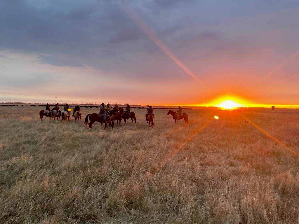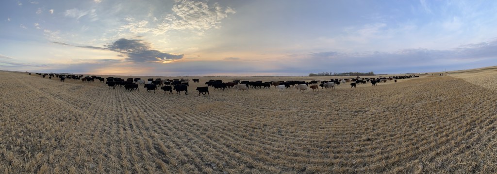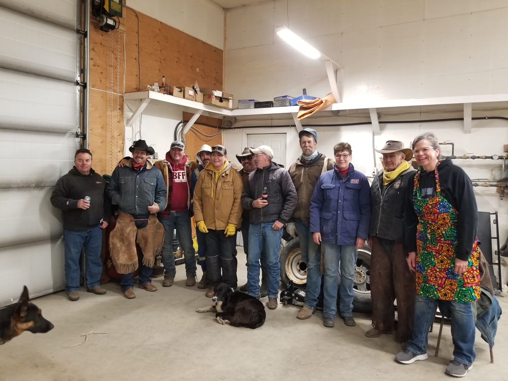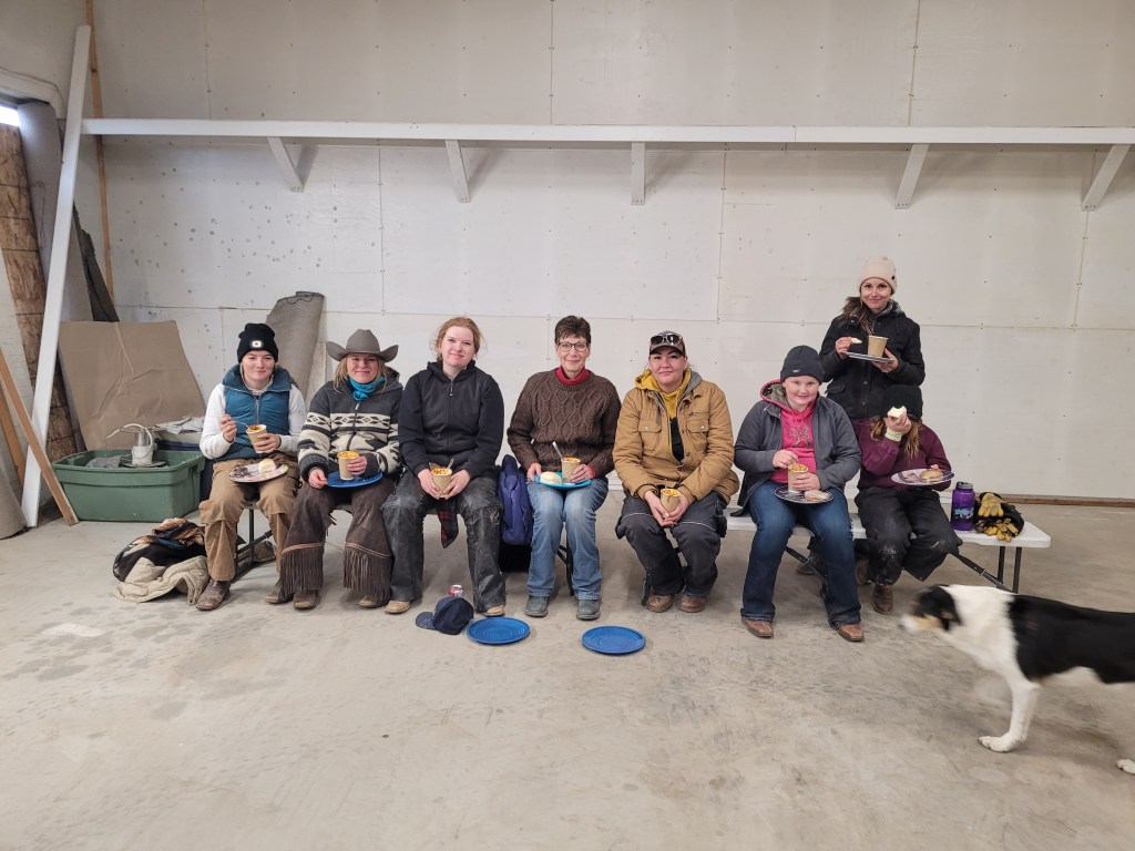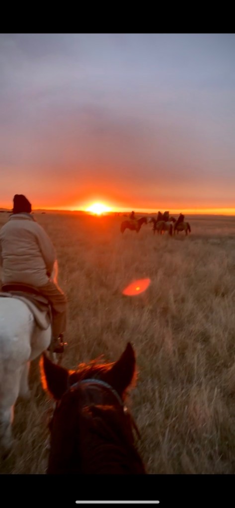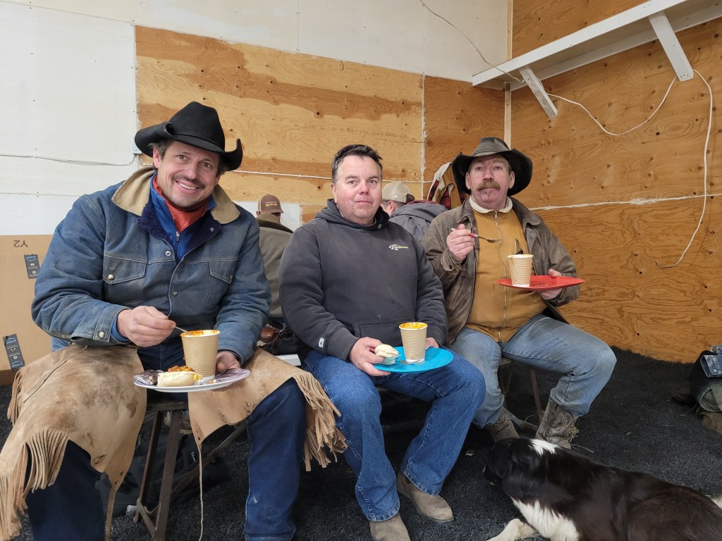 It was a cloudy day but started with a warm glow of a beautiful sunrise. Jen took this selfie.The crew left the yard at 6:05am which meant they were in the saddle already by the time the sun cracked the horizon. Jen caught this moment, sunrise glowing on Cinder’s head.Gina sent me this picture early this morning.The cows are in the distance, the crew is gathering, Jen grabbed this moment of mustering.Tenley’s perspective during the mustering. Russ says at this moment Gina had advanced ahead to the herd. Her job was to sing to the cows, wake the cows up and tell the calves to get ready for their day and have a bit of a suck.Meanwhile, back at the ranch, I started a 6x batch of chili. This veg base got split into 3 crockpots and then beans, onions and cooked ground beef added. A little ways along the trail, they were able to cut cross country and Patrick caught this cool panoramic shot.Russell took this 20 second video early on. It gives a sense of the cows and a bit of Russell’s levity.Sharon had this view which grabs alot of action.When riders are new to the trail it is hard to do the whole distance. Sharon got a chance to visit with our newest rider, Brooklyn, when it was her turn for a truck break.With the crew done early we ready had to hustle at the house. Jill was my saving grace.Packing lists and sturdy baskets are essential.While Jill and I got lunch set up in McNeils shop some pictures got taken. This one features alot of our teen riders and a couple who are just a bit older than that.I got summoned from the food table for “the old guys” picture.Some of our lunch time customers. On the left side of this picture is Griffin Currie. Part way through the morning I got a text from Tenley simply saying “I nominate Griffin for cowboy of the day.” Later she told me, Griffin was the guy who headed into a swamp to make sure cows trying to get a drink got out without having trouble. I was told he had to be decisive, effective and patient and he was all that. Tenley said she and her horse could not have done it. Gina said she was warned away from it, a possibility of sinking being real. Griffin just did it.Jen grabbed this pic of my dog customers. Gary was thrilled by the dessert options. Due to some generous cooks four different kitchens were represented and Gary sampled them with delight. Back at the house after lunch I sat down with coffee and a puffed wheat cake, made by Olivia, who at the age of 10 appears to have mastered a fine puffed wheat cake, many of us know, this is not easy to do.