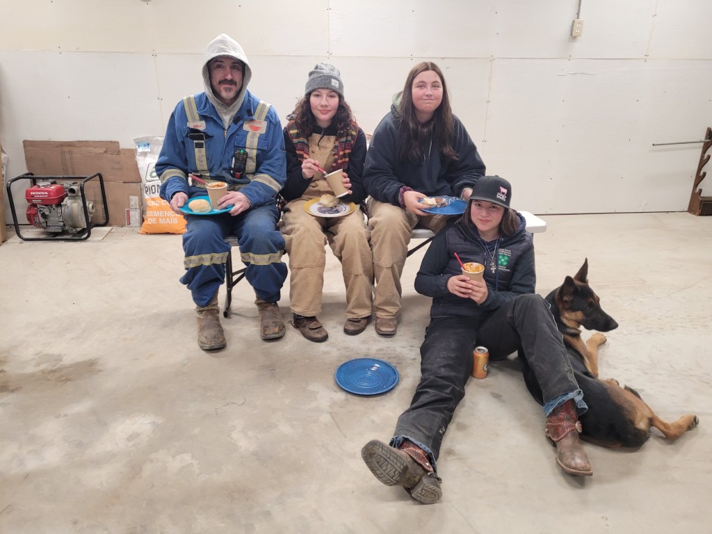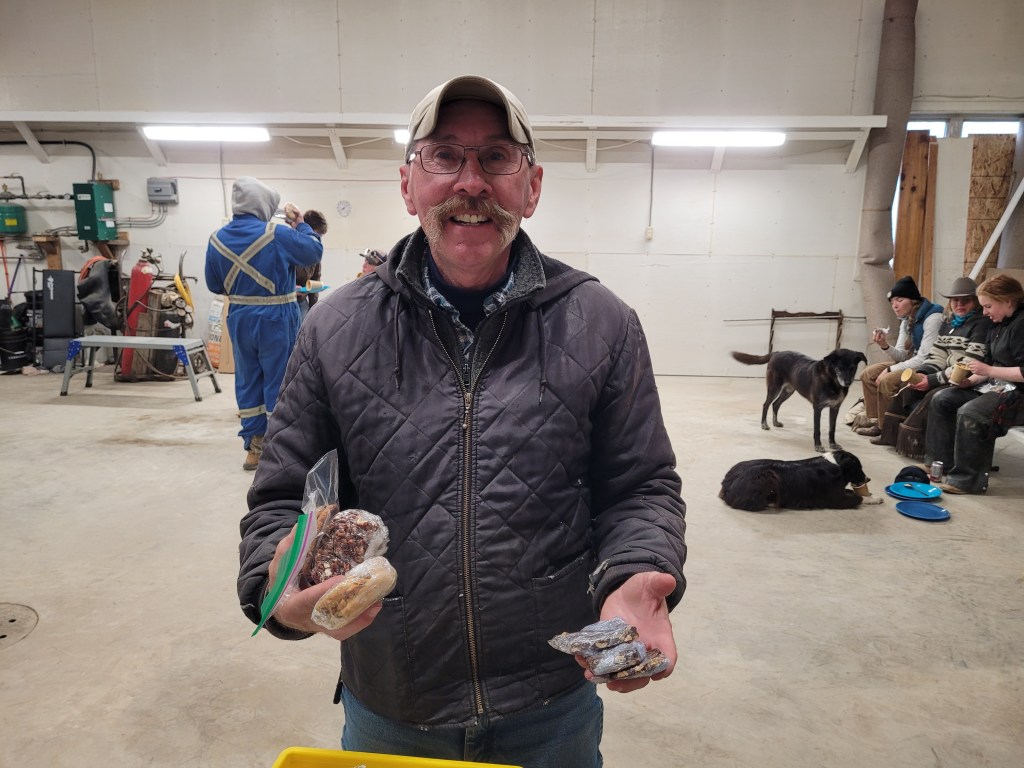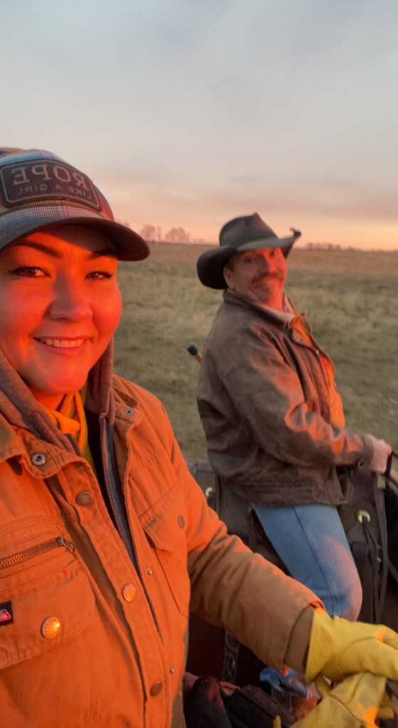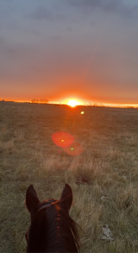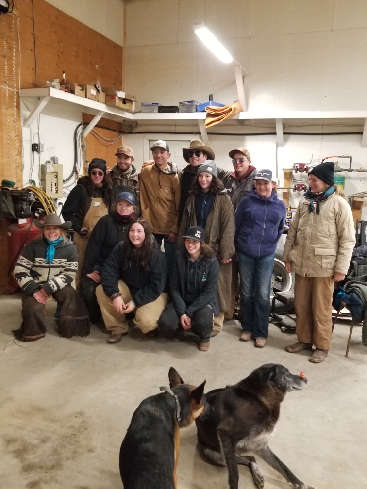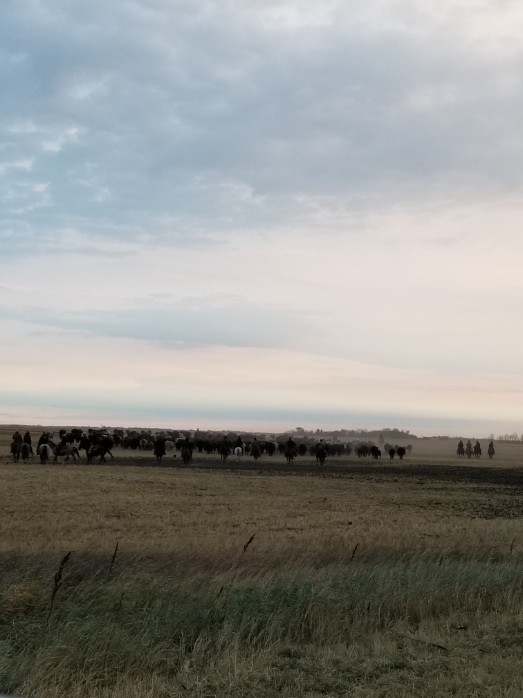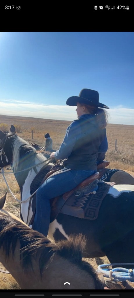 It was a cloudy day but started with a warm glow of a beautiful sunrise. Jen took this selfie.The crew left the yard at 6:05am which meant they were in the saddle already by the time the sun cracked the horizon. Jen caught this moment, sunrise glowing on Cinder’s head.Gina sent me this picture early this morning.The cows are in the distance, the crew is gathering, Jen grabbed this moment of mustering.Tenley’s perspective during the mustering. Russ says at this moment Gina had advanced ahead to the herd. Her job was to sing to the cows, wake the cows up and tell the calves to get ready for their day and have a bit of a suck.Meanwhile, back at the ranch, I started a 6x batch of chili. This veg base got split into 3 crockpots and then beans, onions and cooked ground beef added. A little ways along the trail, they were able to cut cross country and Patrick caught this cool panoramic shot.Russell took this 20 second video early on. It gives a sense of the cows and a bit of Russell’s levity.Sharon had this view which grabs alot of action.When riders are new to the trail it is hard to do the whole distance. Sharon got a chance to visit with our newest rider, Brooklyn, when it was her turn for a truck break.With the crew done early we ready had to hustle at the house. Jill was my saving grace.Packing lists and sturdy baskets are essential.While Jill and I got lunch set up in McNeils shop some pictures got taken. This one features alot of our teen riders and a couple who are just a bit older than that.I got summoned from the food table for “the old guys” picture.Some of our lunch time customers. On the left side of this picture is Griffin Currie. Part way through the morning I got a text from Tenley simply saying “I nominate Griffin for cowboy of the day.” Later she told me, Griffin was the guy who headed into a swamp to make sure cows trying to get a drink got out without having trouble. I was told he had to be decisive, effective and patient and he was all that. Tenley said she and her horse could not have done it. Gina said she was warned away from it, a possibility of sinking being real. Griffin just did it.Jen grabbed this pic of my dog customers. Gary was thrilled by the dessert options. Due to some generous cooks four different kitchens were represented and Gary sampled them with delight. Back at the house after lunch I sat down with coffee and a puffed wheat cake, made by Olivia, who at the age of 10 appears to have mastered a fine puffed wheat cake, many of us know, this is not easy to do.