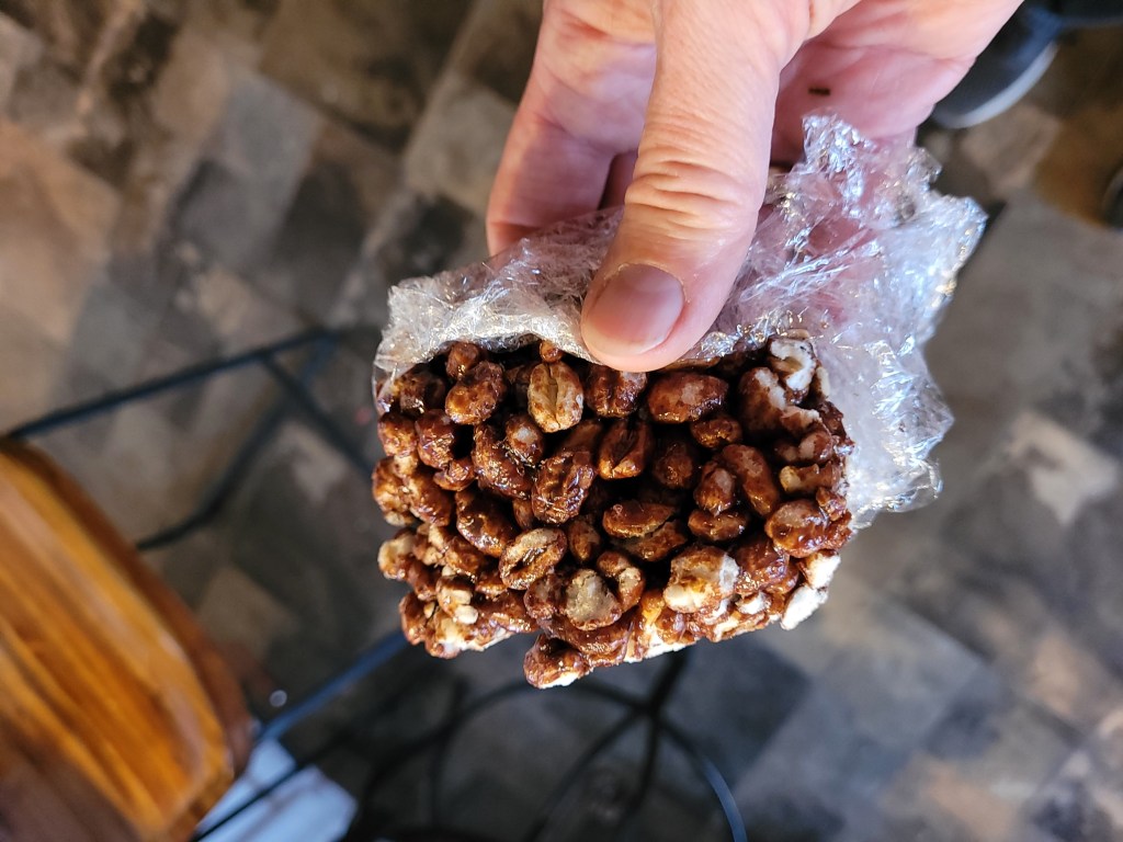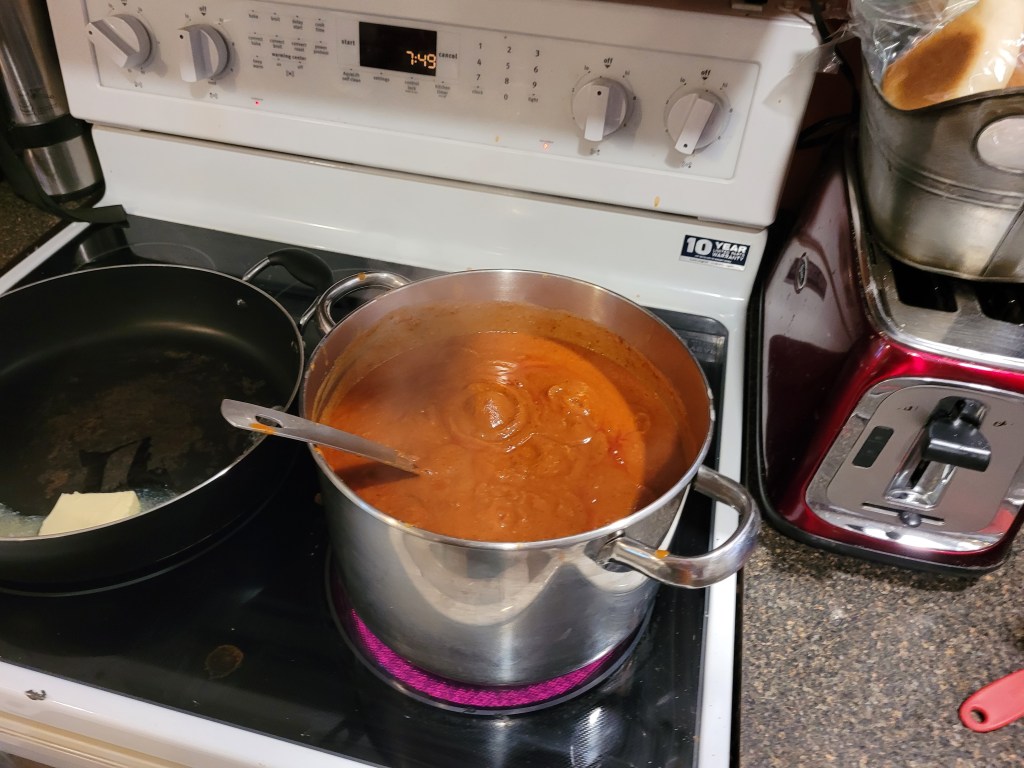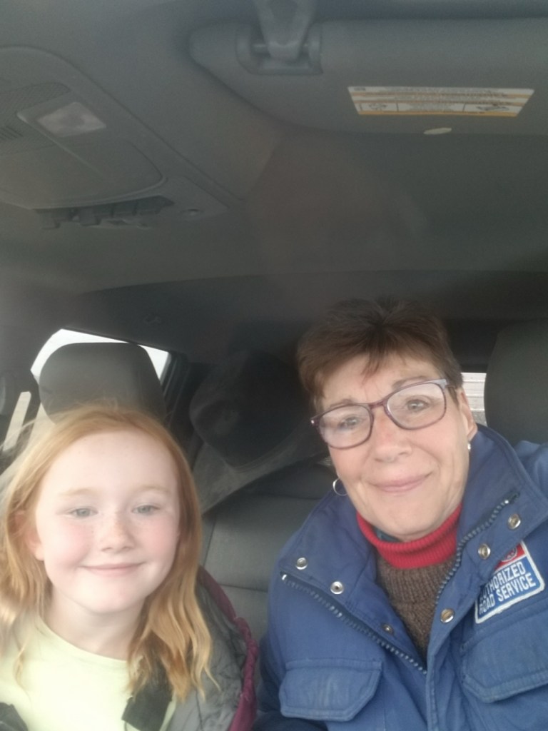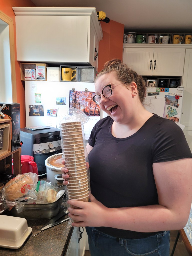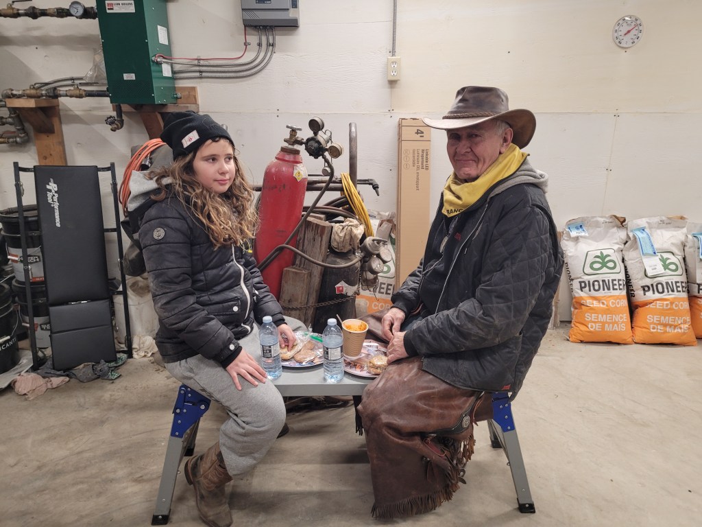 It was a cloudy day but started with a warm glow of a beautiful sunrise. Jen took this selfie.The crew left the yard at 6:05am which meant they were in the saddle already by the time the sun cracked the horizon. Jen caught this moment, sunrise glowing on Cinder’s head.Gina sent me this picture early this morning.The cows are in the distance, the crew is gathering, Jen grabbed this moment of mustering.Tenley’s perspective during the mustering. Russ says at this moment Gina had advanced ahead to the herd. Her job was to sing to the cows, wake the cows up and tell the calves to get ready for their day and have a bit of a suck.Meanwhile, back at the ranch, I started a 6x batch of chili. This veg base got split into 3 crockpots and then beans, onions and cooked ground beef added. A little ways along the trail, they were able to cut cross country and Patrick caught this cool panoramic shot.Russell took this 20 second video early on. It gives a sense of the cows and a bit of Russell’s levity.Sharon had this view which grabs alot of action.When riders are new to the trail it is hard to do the whole distance. Sharon got a chance to visit with our newest rider, Brooklyn, when it was her turn for a truck break.With the crew done early we ready had to hustle at the house. Jill was my saving grace.Packing lists and sturdy baskets are essential.While Jill and I got lunch set up in McNeils shop some pictures got taken. This one features alot of our teen riders and a couple who are just a bit older than that.I got summoned from the food table for “the old guys” picture.Some of our lunch time customers. On the left side of this picture is Griffin Currie. Part way through the morning I got a text from Tenley simply saying “I nominate Griffin for cowboy of the day.” Later she told me, Griffin was the guy who headed into a swamp to make sure cows trying to get a drink got out without having trouble. I was told he had to be decisive, effective and patient and he was all that. Tenley said she and her horse could not have done it. Gina said she was warned away from it, a possibility of sinking being real. Griffin just did it.Jen grabbed this pic of my dog customers. Gary was thrilled by the dessert options. Due to some generous cooks four different kitchens were represented and Gary sampled them with delight. Back at the house after lunch I sat down with coffee and a puffed wheat cake, made by Olivia, who at the age of 10 appears to have mastered a fine puffed wheat cake, many of us know, this is not easy to do.