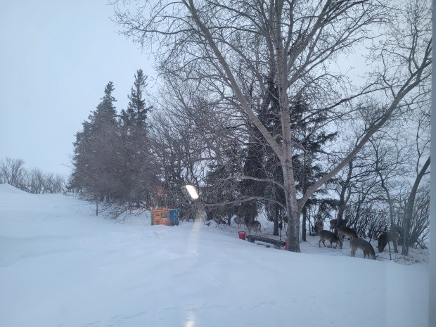 As the blizzard lessened a bit the deer were out and searching for food. There is even one inside that play structure. We have been feeding herds of deer this winter, Russ figures about 100 deer frequent our home quarter with another 100 up the road in our new hayfield.
