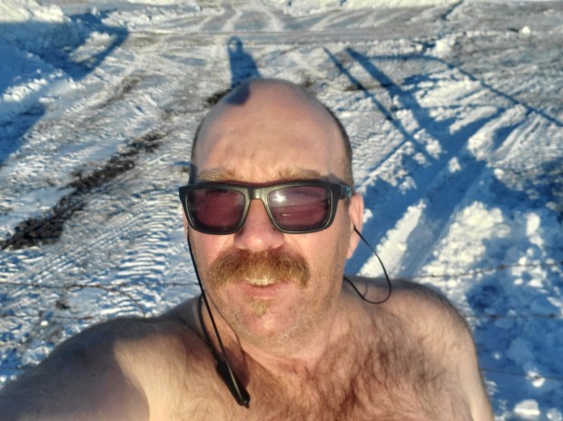 Later he sent me this selfie. What a stud! It was so warm in the skidsteer Russ stripped all his shirts off. He was out to close a gate at this moment. (He gave me permission to post this picture.)