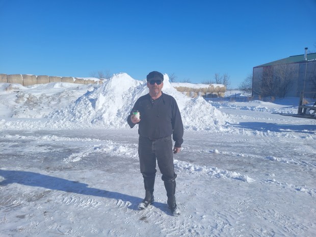 Russ called me to come for a quick visit and bring him a coffee. The weather was so good he was down to a shirt as he finished shoveling out the doorway of the little barn.