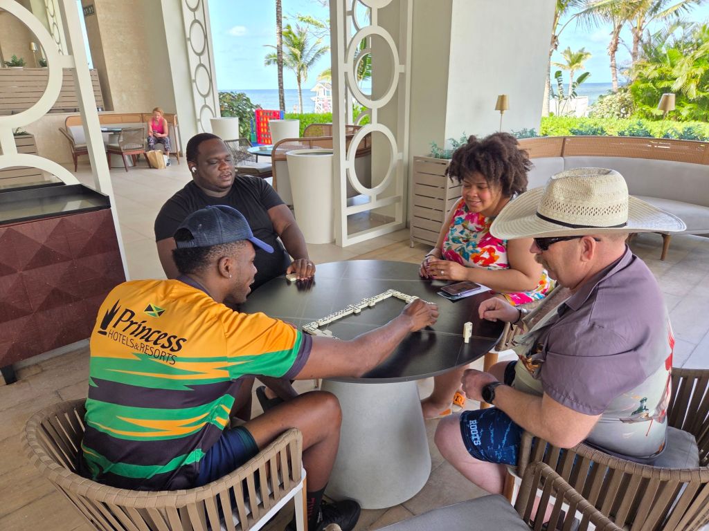 -I want to remember playing dominoes with Gracee, a lawyer from Texas, her husband Dane and Romaine, a resort staff person.  Russ and I were meant to be a team but it was only Russ who really wanted to play.   Gracee called us Pop and Mumma and folded us right into the action, Dane was cutthroat and won.  Russ was proud to bring home the bronze medal for Canada.