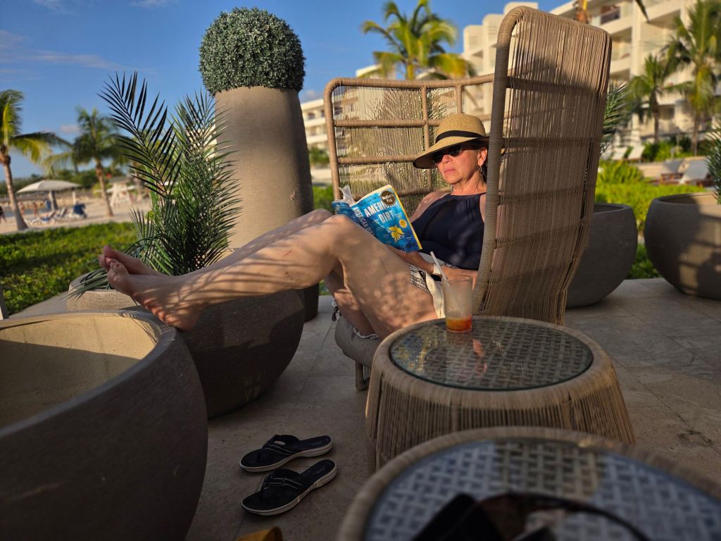 -Russ and I had time to be pals in the good old sense of the word.  It was alot like childhood…..no worries and having a playmate always ready to scheme with,  “what do we want to do next?”  I think I loved reading our books together the best and then our time soaking up sun in the pool.  I really loved that we both seemed to enjoy lingering by the sea or pool after others called it a day.  That end of day calm and anticipation of a great meal was powerful for me.