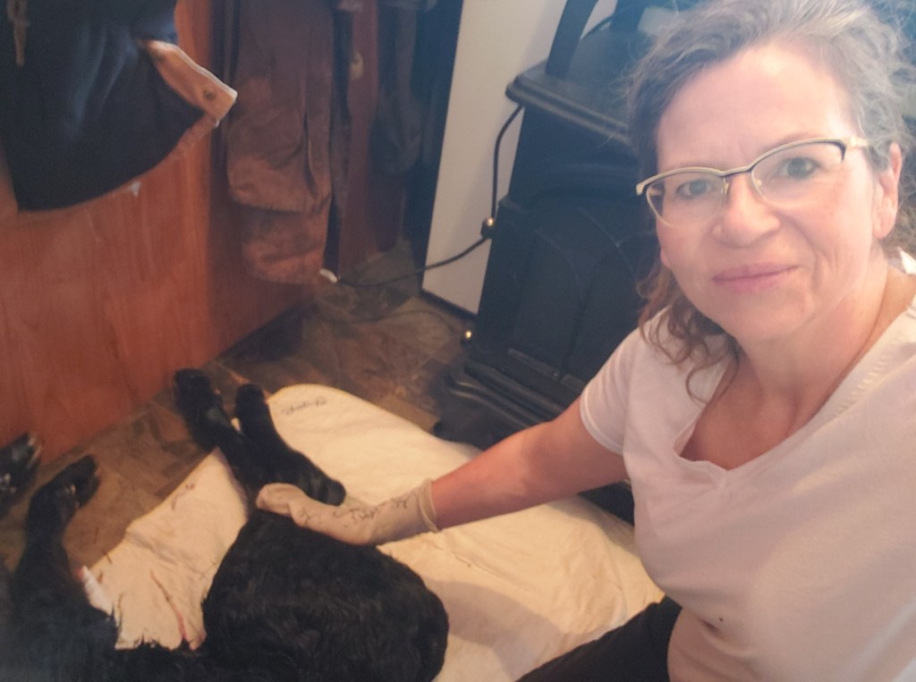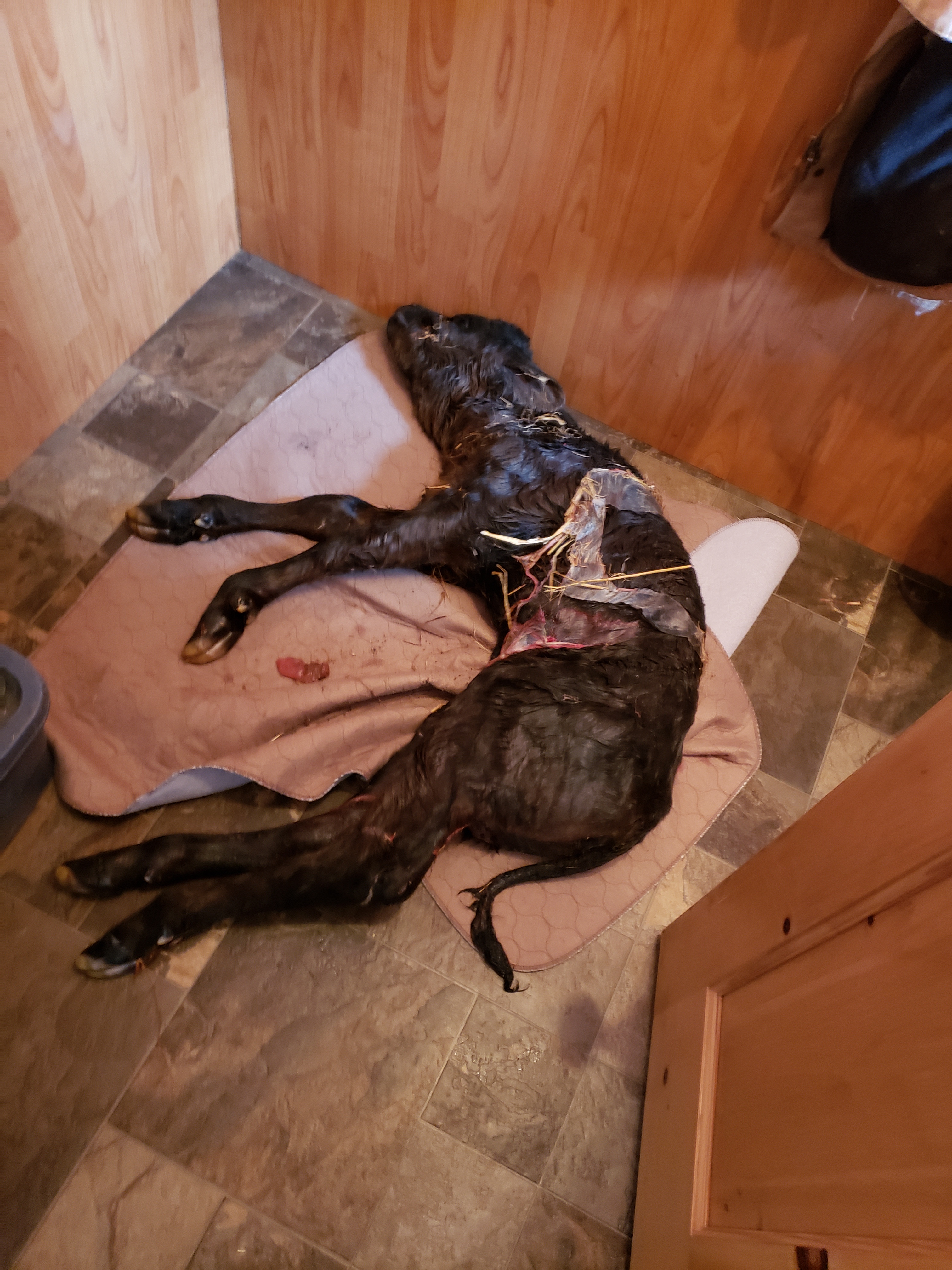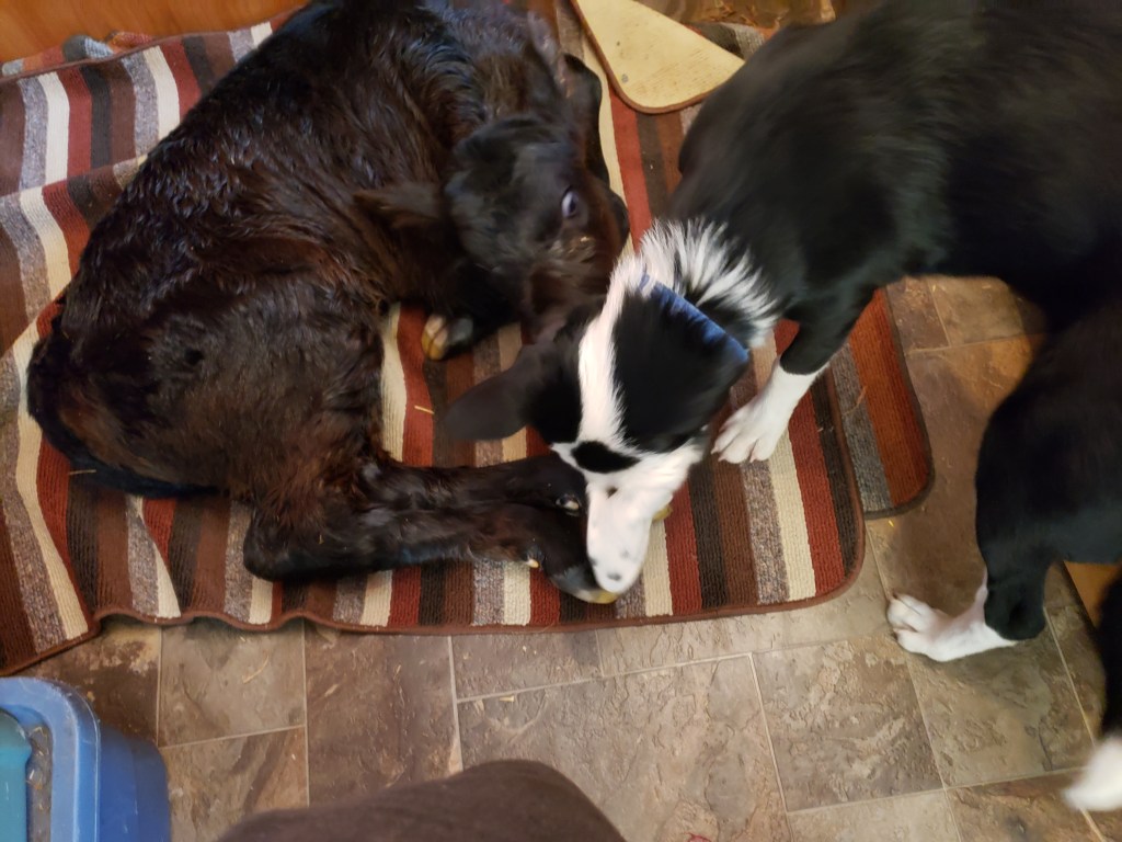 Coffee helped Russ bring this beautiful abandoned twin calf home from the pasture.The calf we have since named Clipper. She was my joy today(read between the lines… .it was not my best day). At first she didn’t want to take a bottle. Russ told me to nudge her sucking instinct by giving her my finger. She remained unconvinced at 9am, at that point she was about 3 hours old.To help her circulation and muscle tone I did lots of work on her, when I saw the residue on my hands I was a bit perplexed. That’s amniotic fluid I am pretty sure.I decided early on in life that there is no need to avoid getting dirty as long as warm water and soap is not far away. Look Ma! Clean hands again 😊.By 11am when I went back Clipper decided that bottle is a good thing. Russ worked his butt off today and pulled Yearn’s calf just as the sun was setting. Coming in to get a bottle for M.J. he took this picture of our house.We got new stools at our counter. They have no arms. It seems that makes it easier for a pet to get a spot at the counter. This site tonight tickled my fancy……oh Coffee dog! A very late supper for Russ.