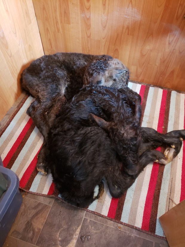 Hello from the Bar MW Ranch where after three days of snow I think the sun might just shine today. We are thankful for it all. Yesterday was another busy day of Russ, Ron and Morgan working hard to keep calves alive. I called Ron around 8:30 to tell him we had no water and ask him to check the well house for troubles. He told me he was trying to save a calf but he would get right to it. I updated Russ with the situation. Russ got to the well house before Ron did and reported back that “some idiot had unplugged the heater…….and that idiot was me.” We had water again in short order, after a line thawed. Shortly after this my house guest for the morning arrived, the calf Ron was saving, a big beautiful red calf, her Mom is “Katie.” Russ carried it in and asked me to please play some specific music for this calf. So I cued up Ian Tyson “The Navajo Rug” song, thanks to YouTube, and the calf got to hear Ian singing about its Mom “Katie.” Here is Katie Jr. at the point she was handed off to me. Our little dog room heats up fast and makes a great warm up spot. Coffee our puppy is doing absolutely wonderfully with sharing her corner of the house.