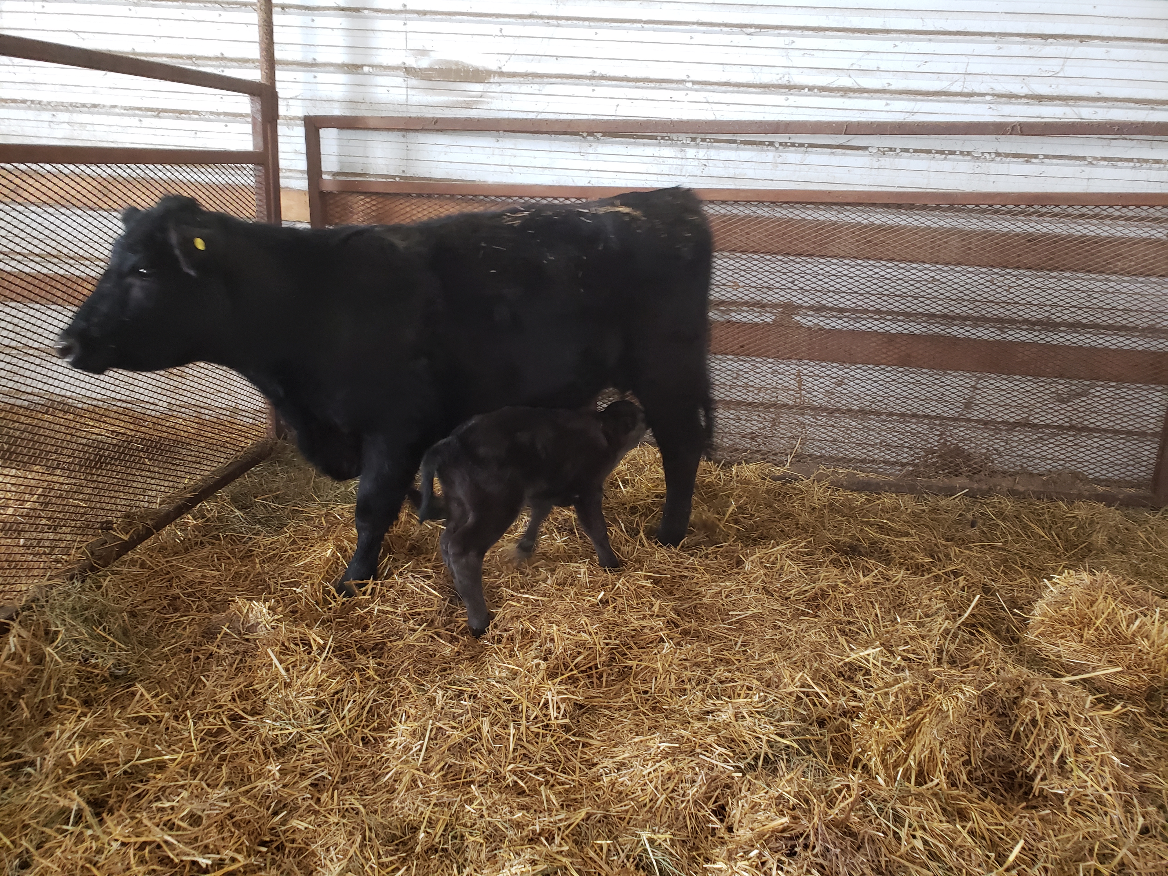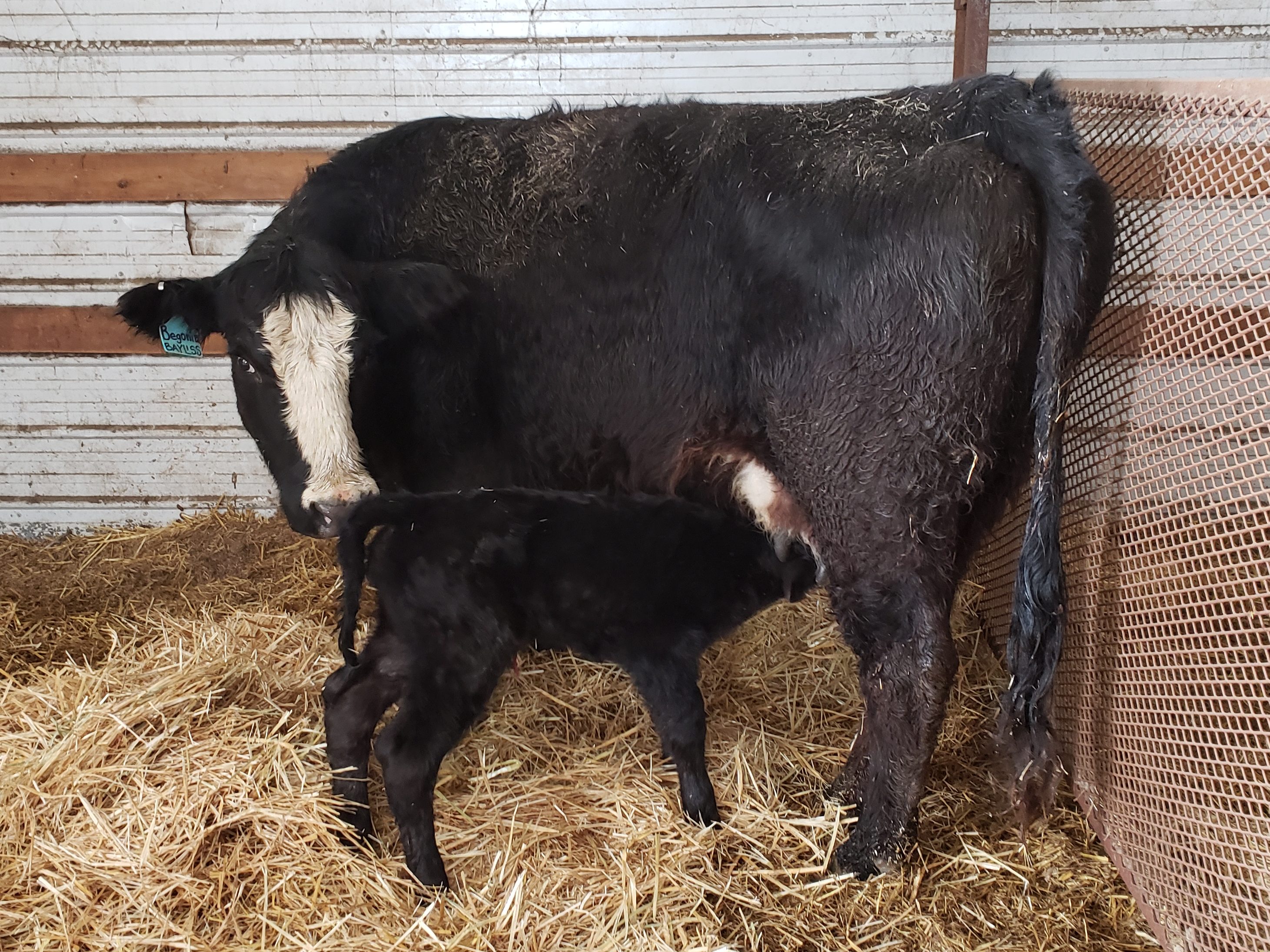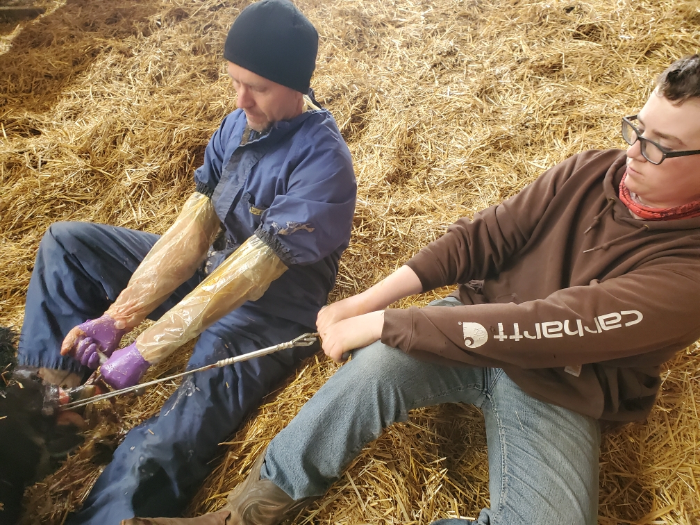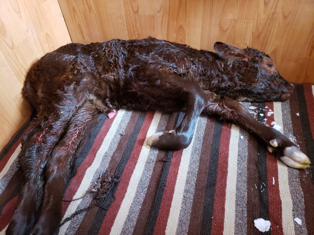 Russ reported in while checking the cows “Buttercup” was not doing so well, seemed to be in distress. Morgan was still his helper at this point and was the one to get her lined up to get in the trailer and come home. Russ did an internal assessment and thought we needed the vet. Marcel came in a flash. I got a call from Morgan, “come to the pole shed! We are having twins!” By the time I got there Marcel had pulled the 2nd calf and Buttercup was at this stage. She is licking them off, getting them drier and and that motion is working on their circulation in the process.