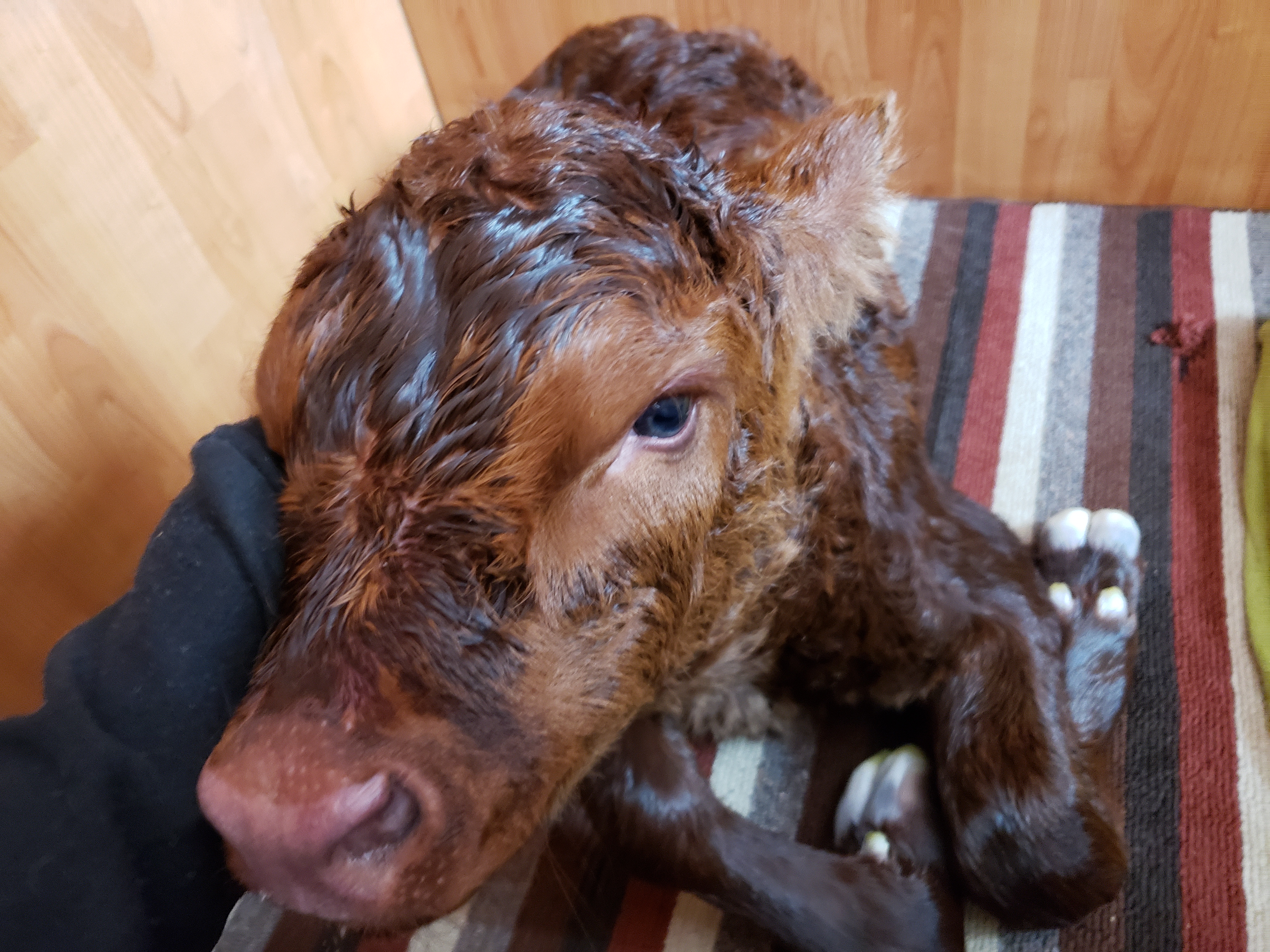 Back at the house I needed to help this calf get dry. It is absolutely amazing how long they hold moisture in their legs. I rubbed and rubbed and just could not get them dry. The room was hot as hades. Anyways….Gina called, she was walking to school, so I put her on speakerphone and she got to hear the calf moo a little bit and we did an interprovincial session with this calf.