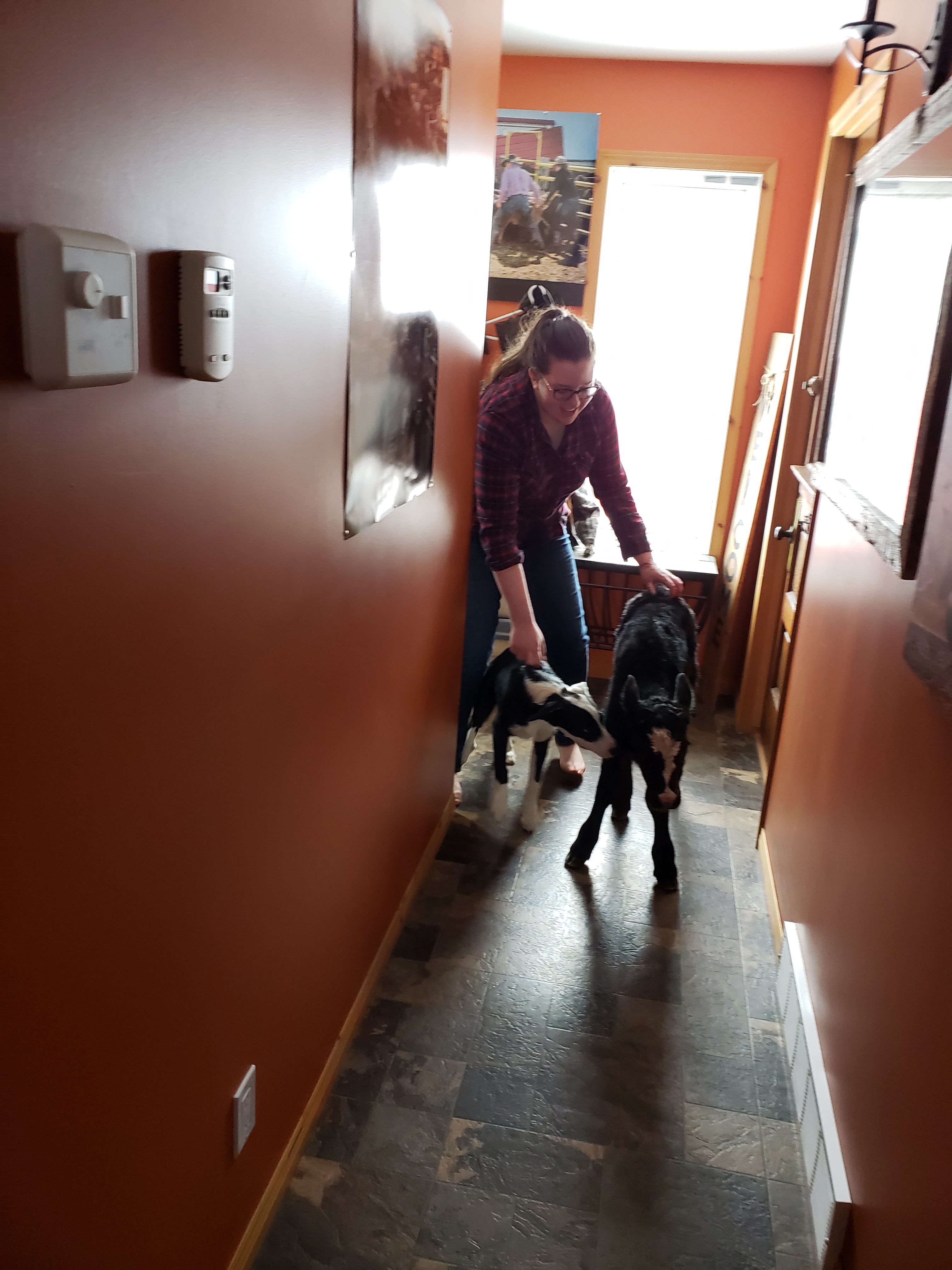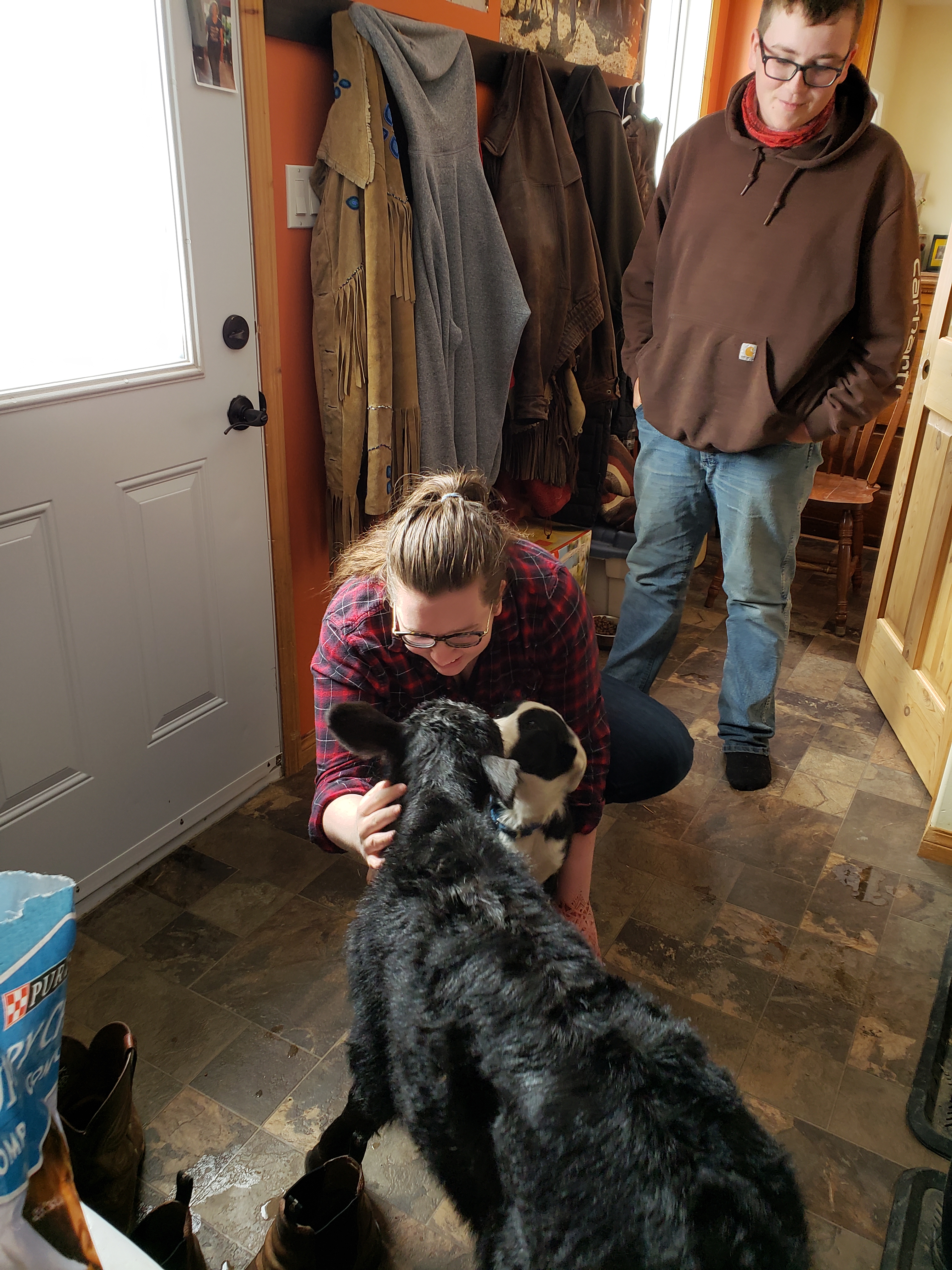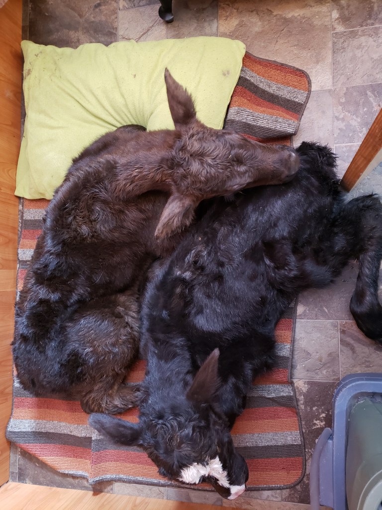 After my own routine and my blogging was complete I had a call from Russ, he had two calves that were doing quite well they just needed a warm up. “Get the dog room ready!”A little while later Morgan checked on them. He called to me, “Mom! One is standing! Mom! Two are standing!” I could only envision that two calves moving about in this small room was going to be trouble, especially with a plugged in heater in the mix. So I rushed in and together we enjoyed these quiet and beautiful calves. Morgan called Russ to tell him the calves were ready for pick up. Russ said he had six straw bales he was dealing with and then he would be right in. Morgan suggested we let them out into the rest of the house. I thought he was crazy. But we did keep the door open and let Coffee dog have a chance to see what was happening in her bedroom.Coffee dog was super impressed with her new friends.When it was clear to me that the calves were not steady enough to be galloping around the house we let them do what they felt led to do. This is Begonia’s calf, she ventured out into the porch. Jill zoomed up from her desk when I sent her a text “two calves are standing, its fun in the dog room.” It was in these moments she said “I absolutely love this!” We were in a wide open meadow of space at this point in the day.Begonia Jr. is so cute and a little more adventurous than her room-mate whose Mom is “Cop Car”. Someday soon I can say more about the weird names we have for our cows.Jill was very on duty in reining in Coffee’s love for interaction. I thought that Coffee was telling herself, “Wow, the quality of the toys in this house has really gone up!”