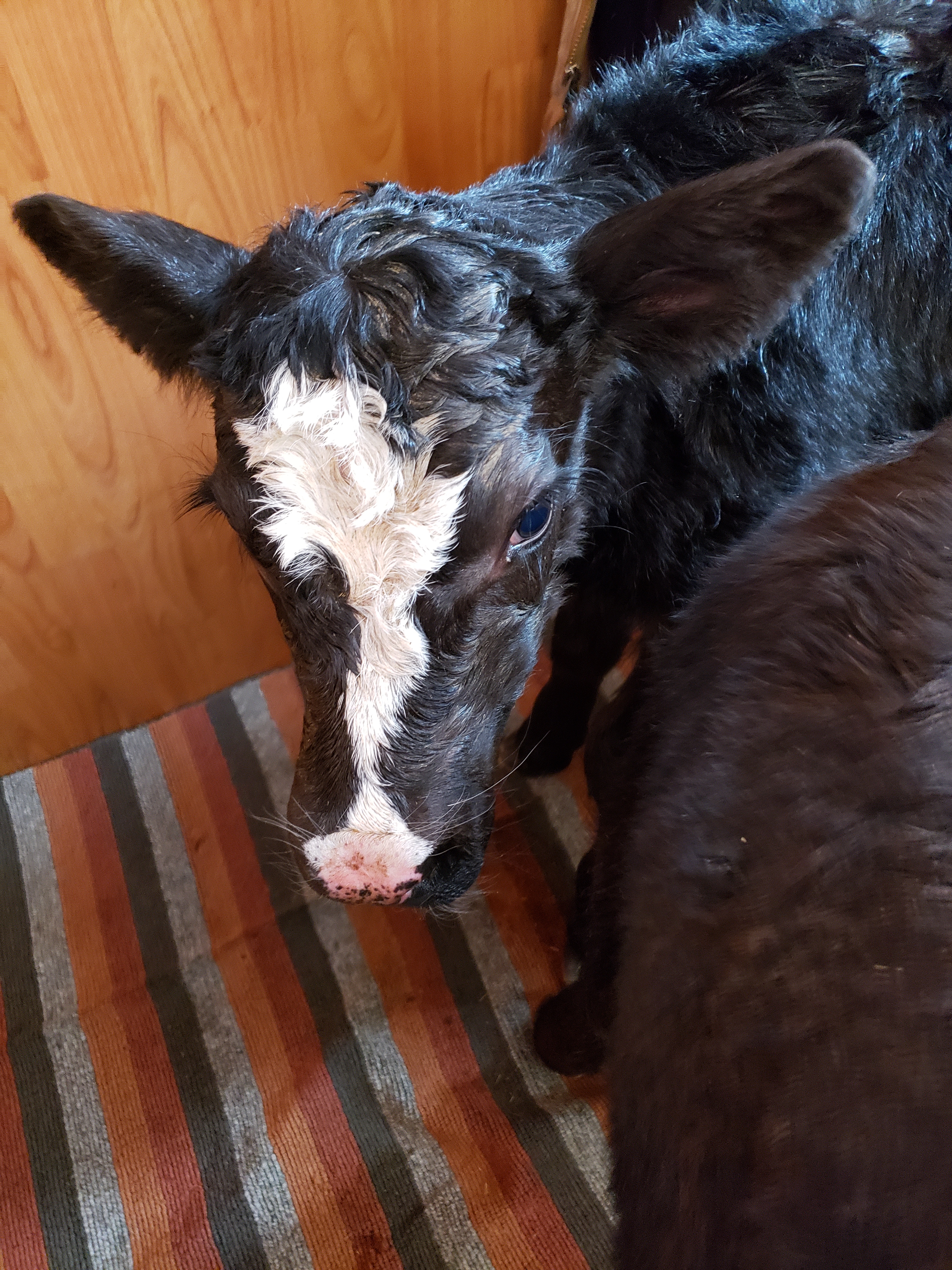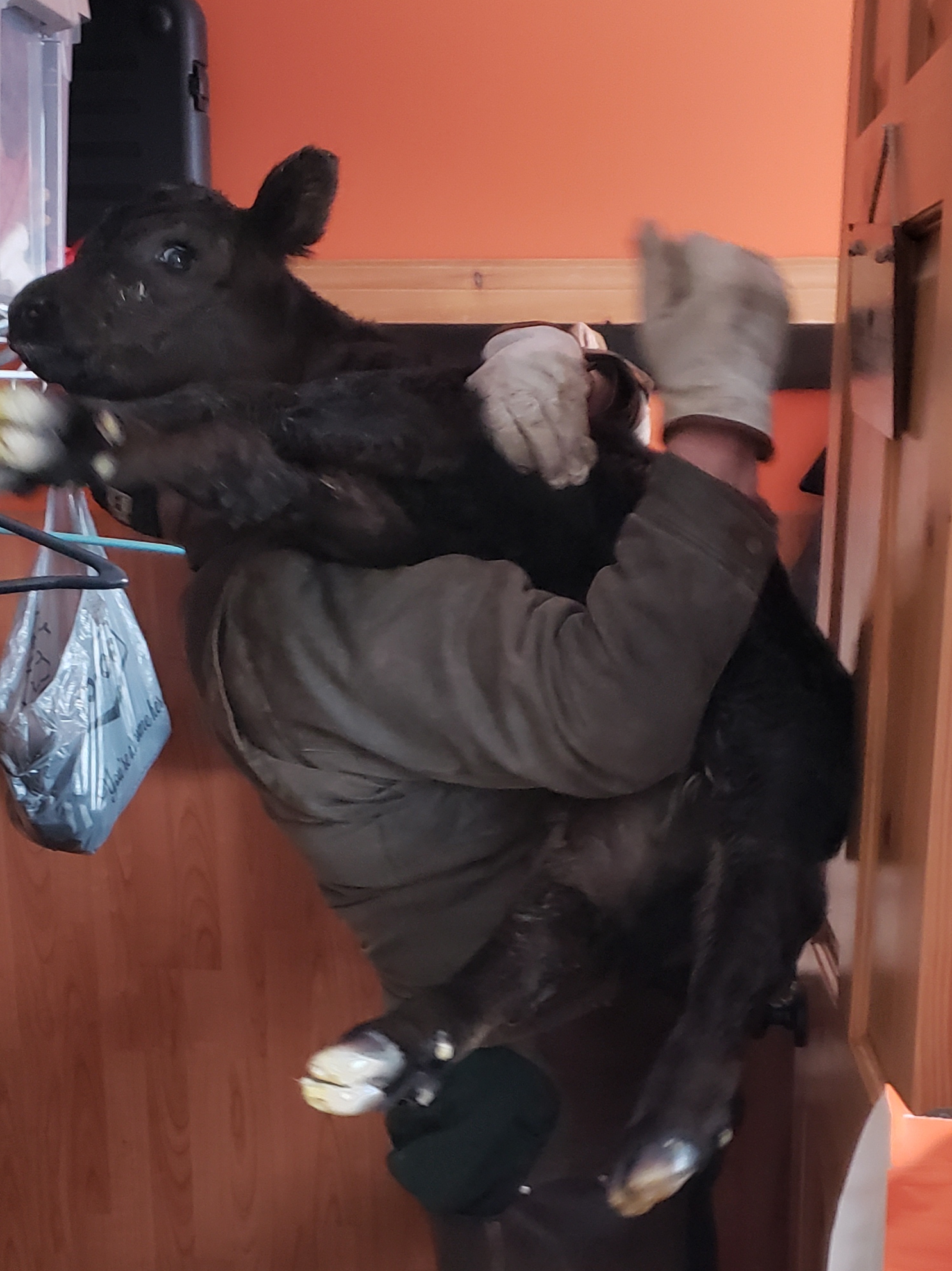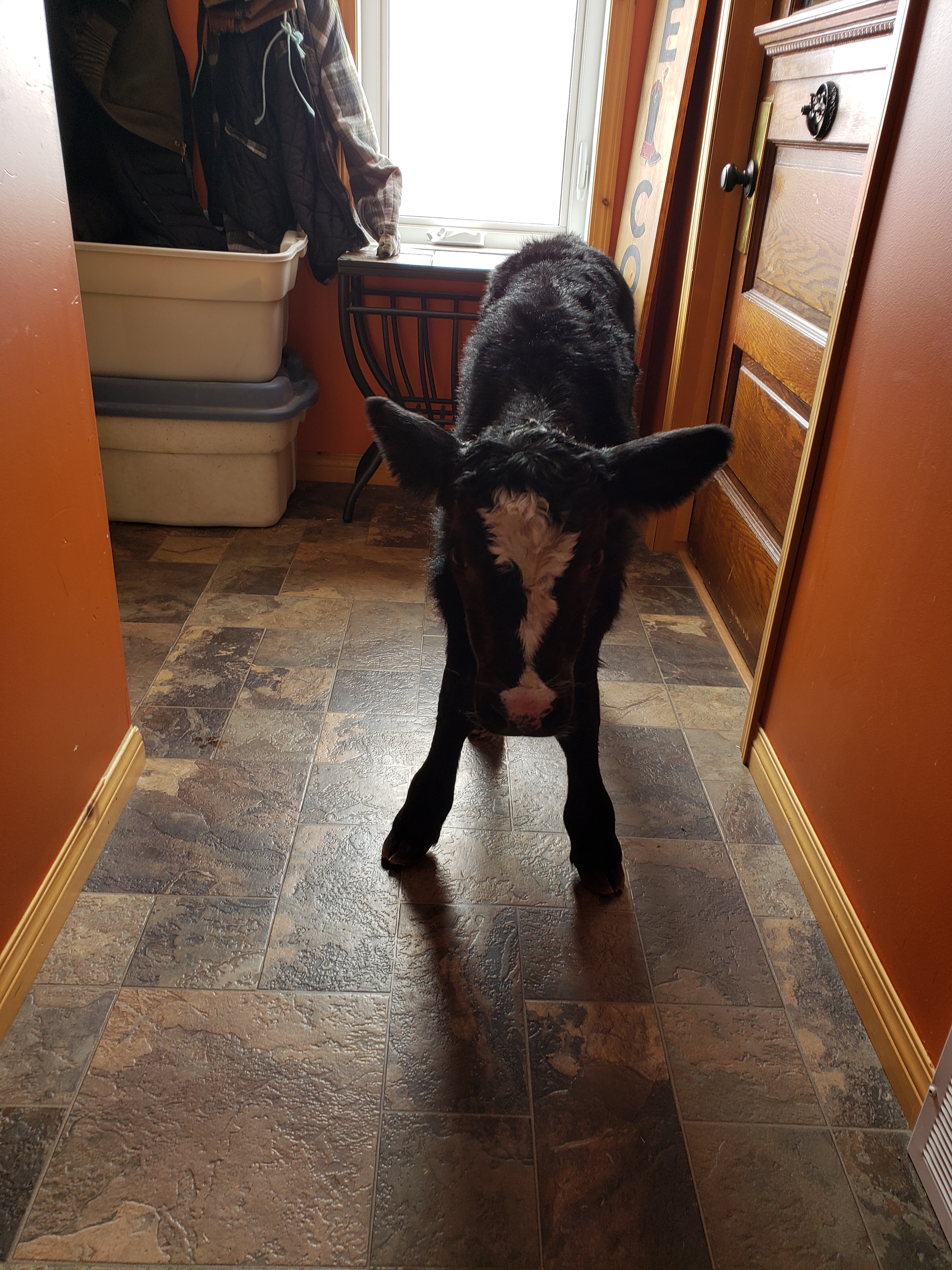 After my own routine and my blogging was complete I had a call from Russ, he had two calves that were doing quite well they just needed a warm up. “Get the dog room ready!”A little while later Morgan checked on them. He called to me, “Mom! One is standing! Mom! Two are standing!” I could only envision that two calves moving about in this small room was going to be trouble, especially with a plugged in heater in the mix. So I rushed in and together we enjoyed these quiet and beautiful calves. Morgan called Russ to tell him the calves were ready for pick up. Russ said he had six straw bales he was dealing with and then he would be right in. Morgan suggested we let them out into the rest of the house. I thought he was crazy. But we did keep the door open and let Coffee dog have a chance to see what was happening in her bedroom.Coffee dog was super impressed with her new friends.When it was clear to me that the calves were not steady enough to be galloping around the house we let them do what they felt led to do. This is Begonia’s calf, she ventured out into the porch. Jill zoomed up from her desk when I sent her a text “two calves are standing, its fun in the dog room.” It was in these moments she said “I absolutely love this!” We were in a wide open meadow of space at this point in the day.Begonia Jr. is so cute and a little more adventurous than her room-mate whose Mom is “Cop Car”. Someday soon I can say more about the weird names we have for our cows.Jill was very on duty in reining in Coffee’s love for interaction. I thought that Coffee was telling herself, “Wow, the quality of the toys in this house has really gone up!”