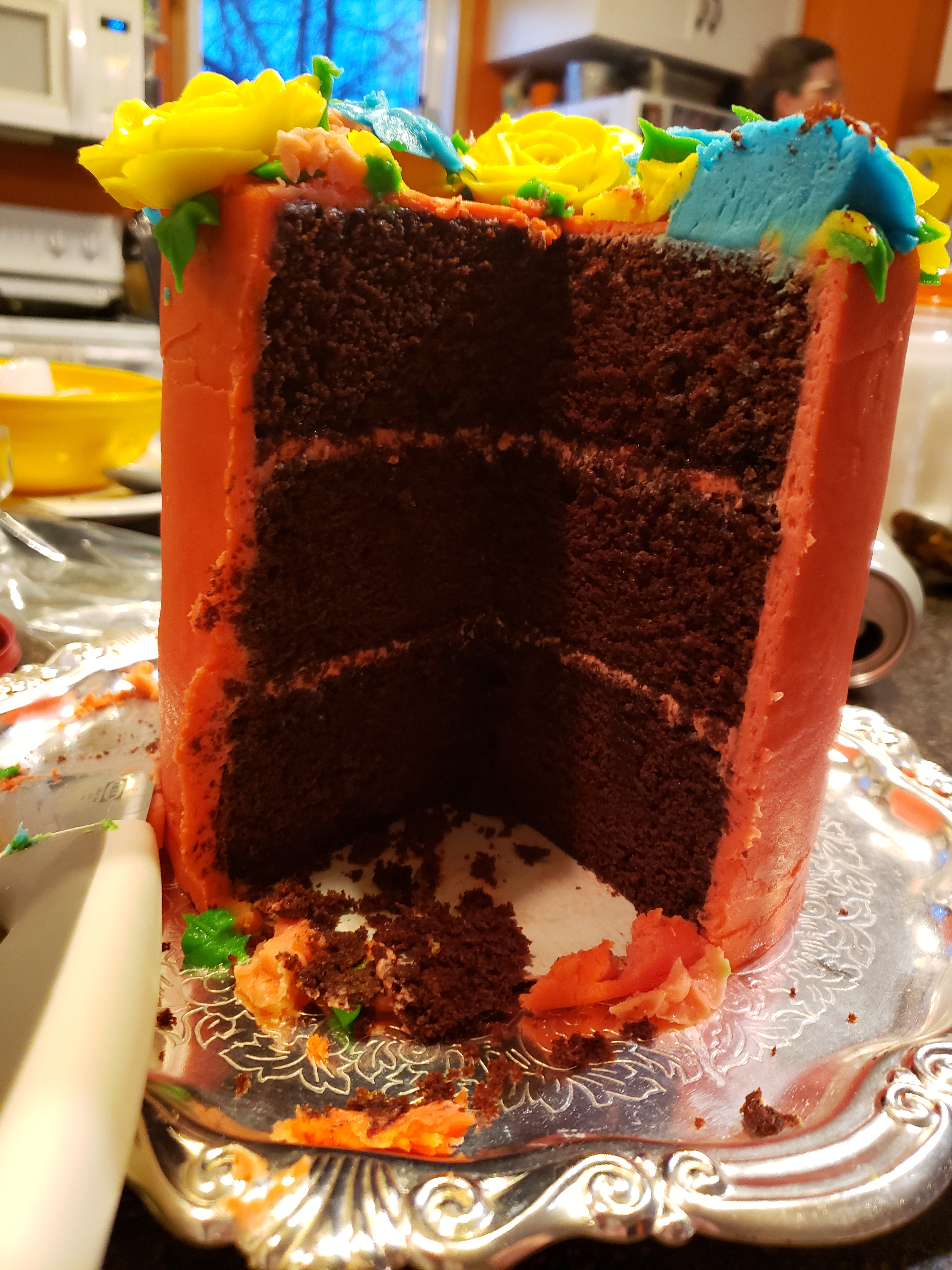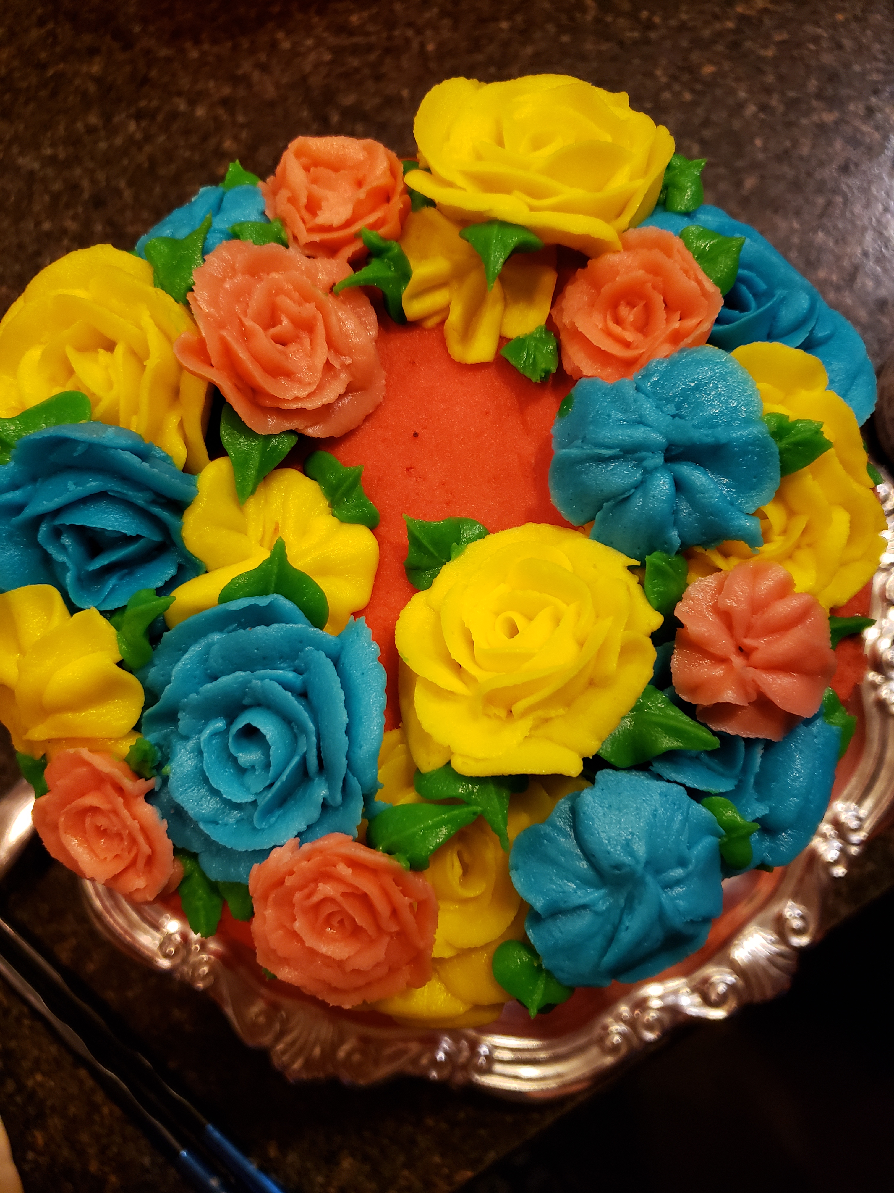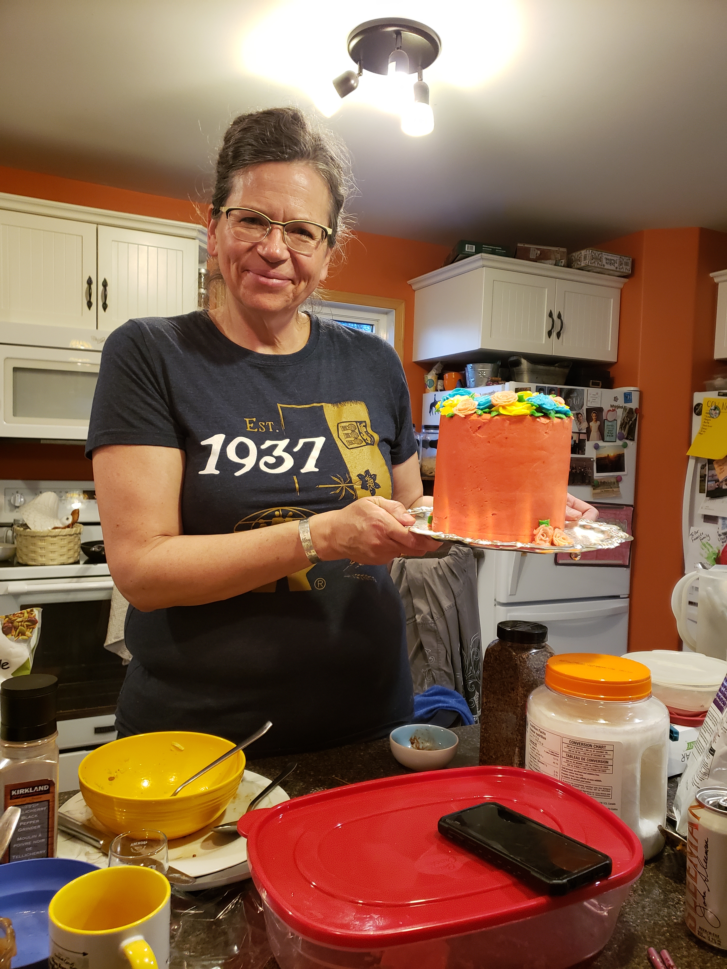 Russell and Morgan had found this rabbit injured at one of the hay feeders. They decided to bring it home and see what could be done for it. Russ said, “even if it dies its better than it dying cold in the mud with predators all around.” They decided to name it Diane, after the rock song “Jack and Diane”, we call almost every bunny we see on the road Jack, it is time to have a Diane.We had a fiesta of leftovers for supper and then Jill served us this beautiful cake she made in honour of her Nana. The colours were chosen based on the blue and coral we so often saw Mom choose for her clothing.The hope for my blog is to be real, like as real as I can bear to be. So welcome to my horrendously messy kitchen and my very weird hair. I am not up to snuff these days. I wanted to use this picture though because our credit union ag rep gave me this t shirt when Mom was sick. The credit union was established in 1937, that is when my Mom was born. Weird fact…..a woman is born with all the eggs she will ever have and use in her lifetime. So that means that the egg that became me was established in 1937 too. Cool.Another low carb part of the week. Can you hear my eyes rolling? Delicious.