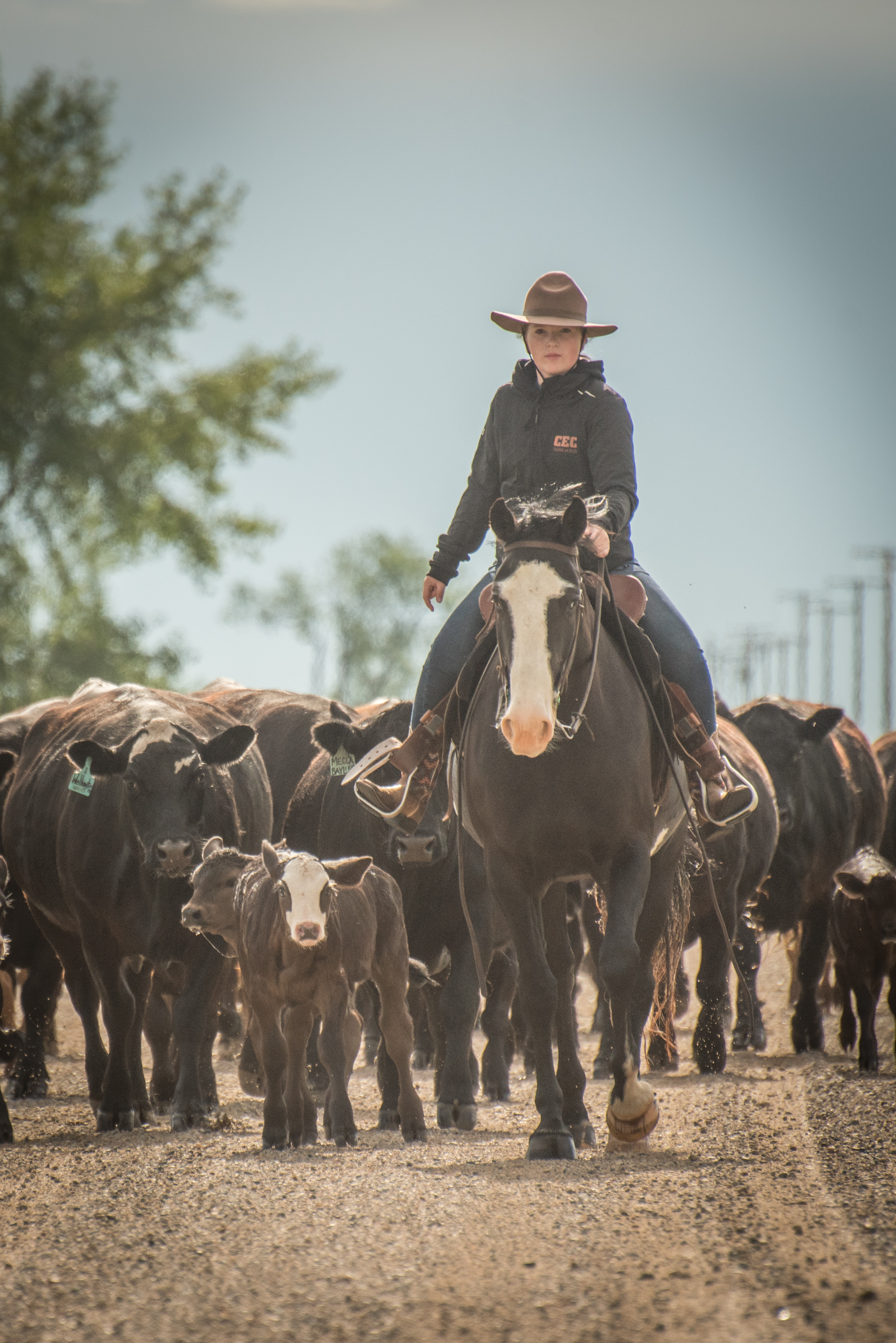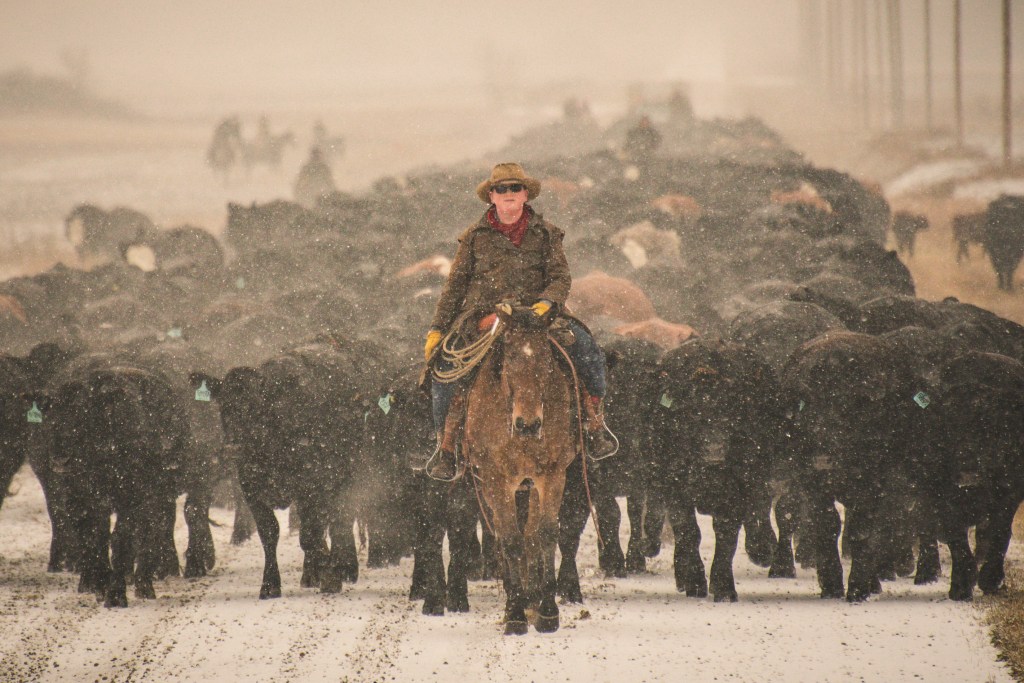 Gina helping to bring a herd of cow calf pairs down the road in June 2020. (A Liz Griffin Photography Image)