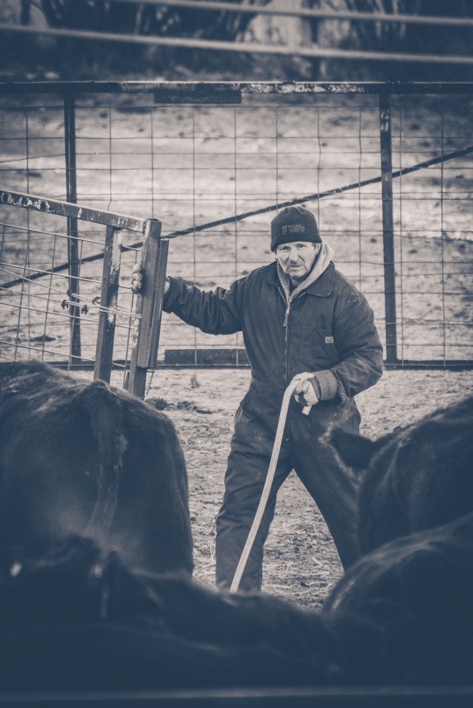 Ron on a work day in the corral, he quite expertly runs gates as we sort the animals. (A Liz Griffin Photography image).Ron (on foot) has done some necessary task in this moment to see a group of cowboys and cowgirls get headed down the road to move part of our herd. (A Liz Griffin Photography Image)