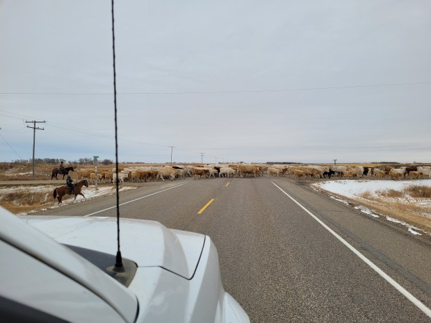 Second…..just a fun thing, Russell and I voted today. We have land in two RMs holding municipal elections, we ventured east and west to cast our ballot. On the way home from Alameda we came across a cattle drive. It was our neighbors bringing a herd home and we arrived at the exact moment they were to cross the highway. Even after all my exposure to cattle on the move I was excited to see this. I took a few pictures. The Patons raise Charolais cattle so the appearance of their cattle drives is quite different than ours. I enjoyed seeing their herd.
