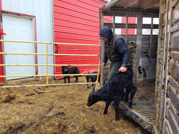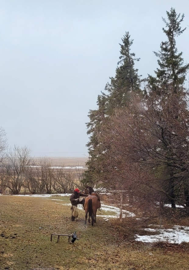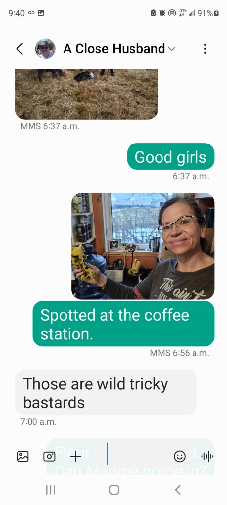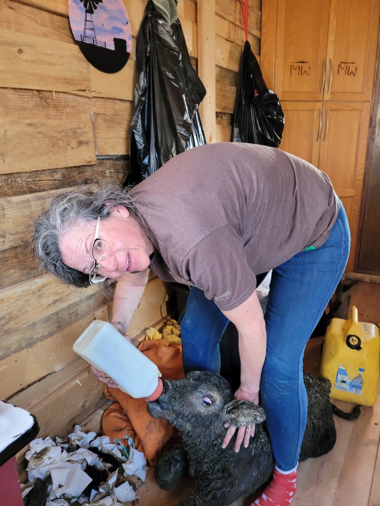 The day before I had gone to Oxbow for two urgent purchases that had me on edge. I needed garden hose, our water line to one cow watering bowl had frozen in the cold and powerless night, we needed to run a hose to a trough to get water to some of our herd. I was anxious about what I would do if there was none available. I also absolutely had to get fuel in our slip tank. Our on site fuel tanks were not usable with out power to pump them. We needed fuel to run our tractors to feed our cows. I have never used a bulk fuel station before and the possible complications of that had me on edge. So as I headed to Oxbow I found myself pondering what I really needed and turning that into a prayer. That meant I was asking God to help me not lose my dignity. There are times when shame and overwhelm have led me to public tears that make no sense to anyone else, I really hate that. So I simply asked God to help me keep my dignity. As it turned out, there was hose in stock and when I got to the bulk fuel station there was Dwayne, a new friend who had joined us on the trail last fall. He helped me. My prayer was answered. Whew. Fast forward to Tuesday afternoon…. Thinking ahead to the evening plan, to be in town attending a Volleyball fundraiser with Morgan, I could not imagine how I would do it in the state I was in. I was setting myself up to lose my dignity. So I cancelled the coffee date and cuddled up in the sun on the bed in the cottage for a nap. I was about fifteen minutes into that nap when Russ called. He had a calf for me and it was going to need alot of work. He and Morgan had found it mired in the mud at the edge of the new dugout, only its nose and mouth sticking out. It was a feat to suck it out of that mud.