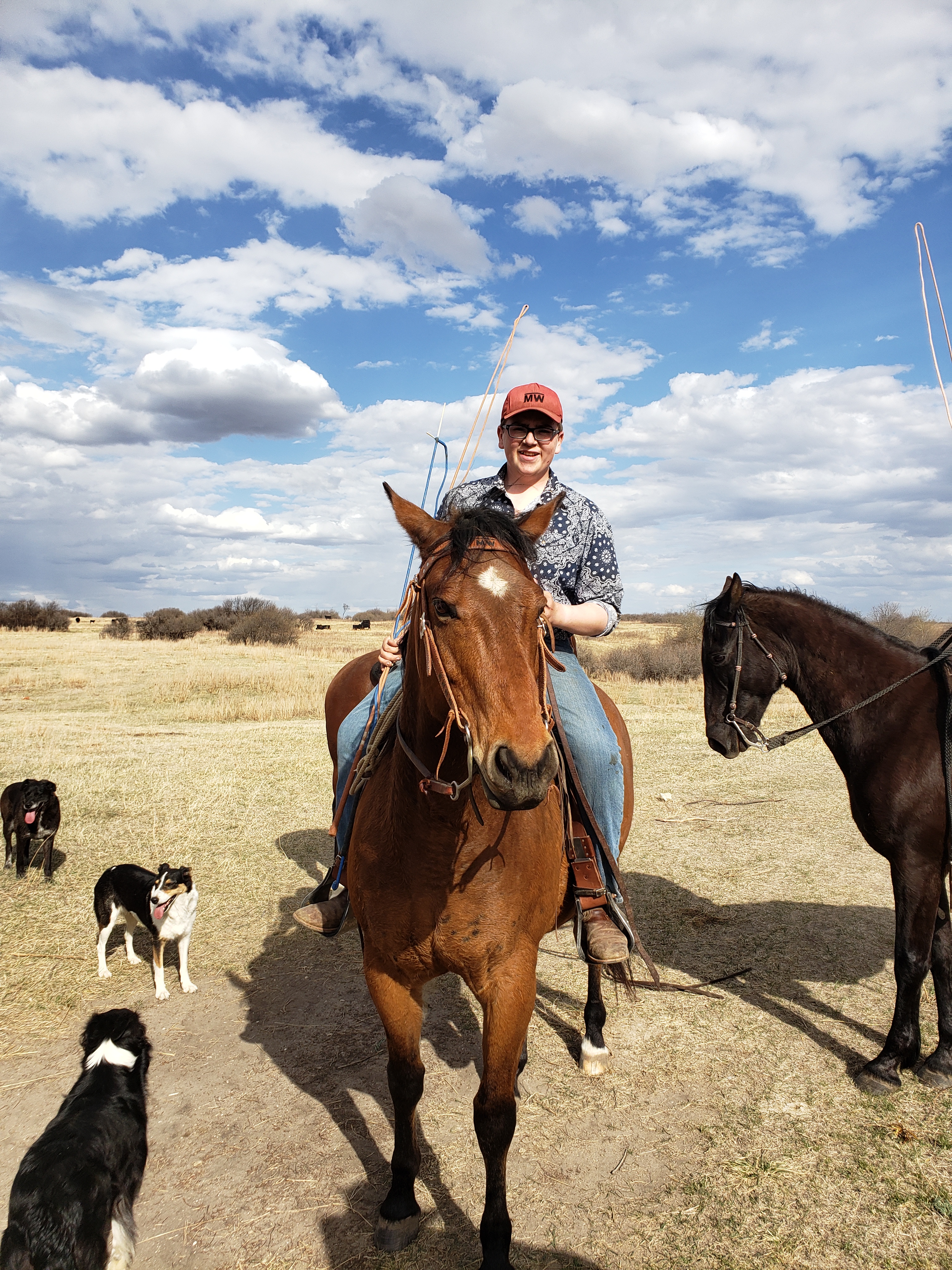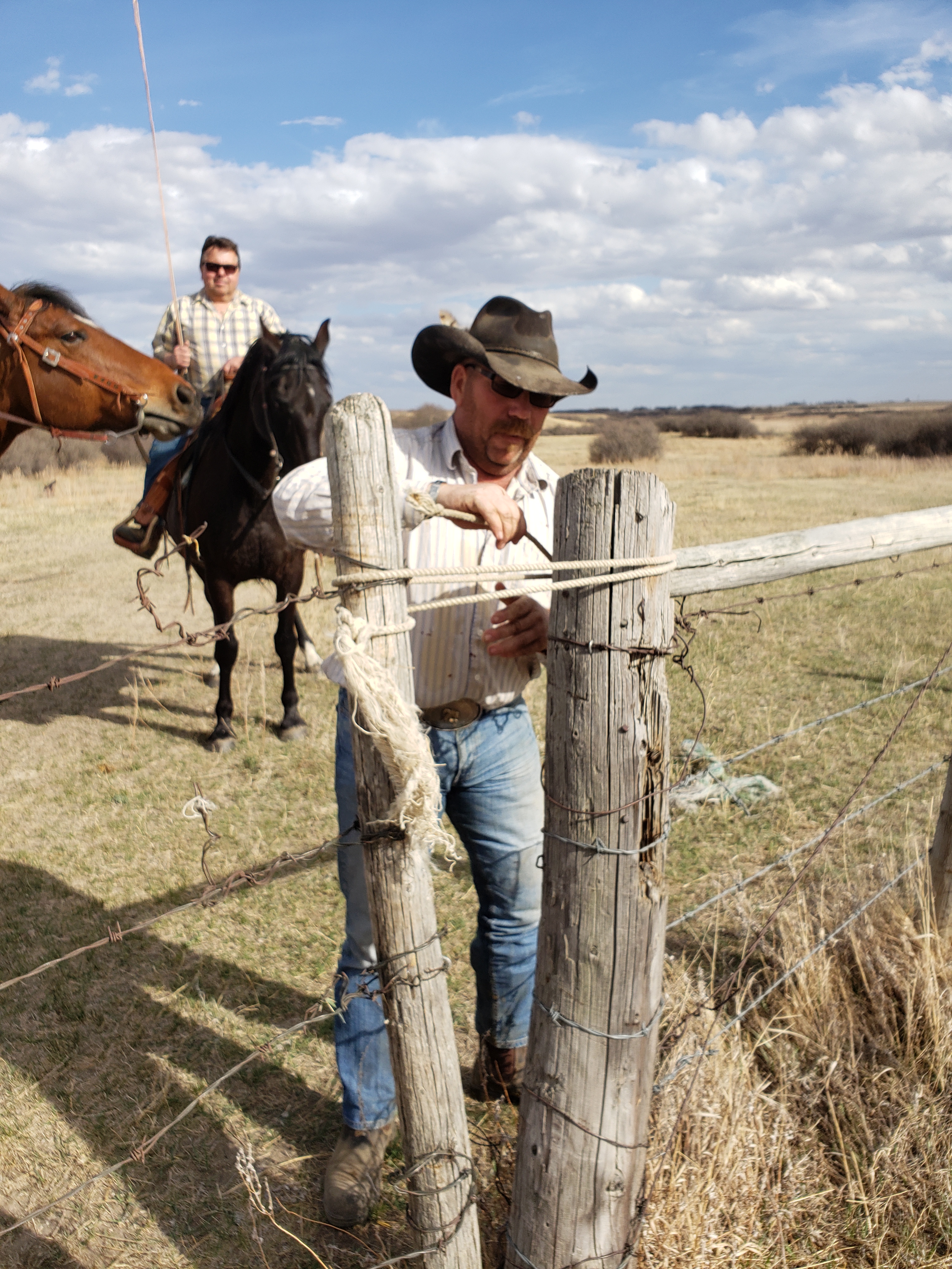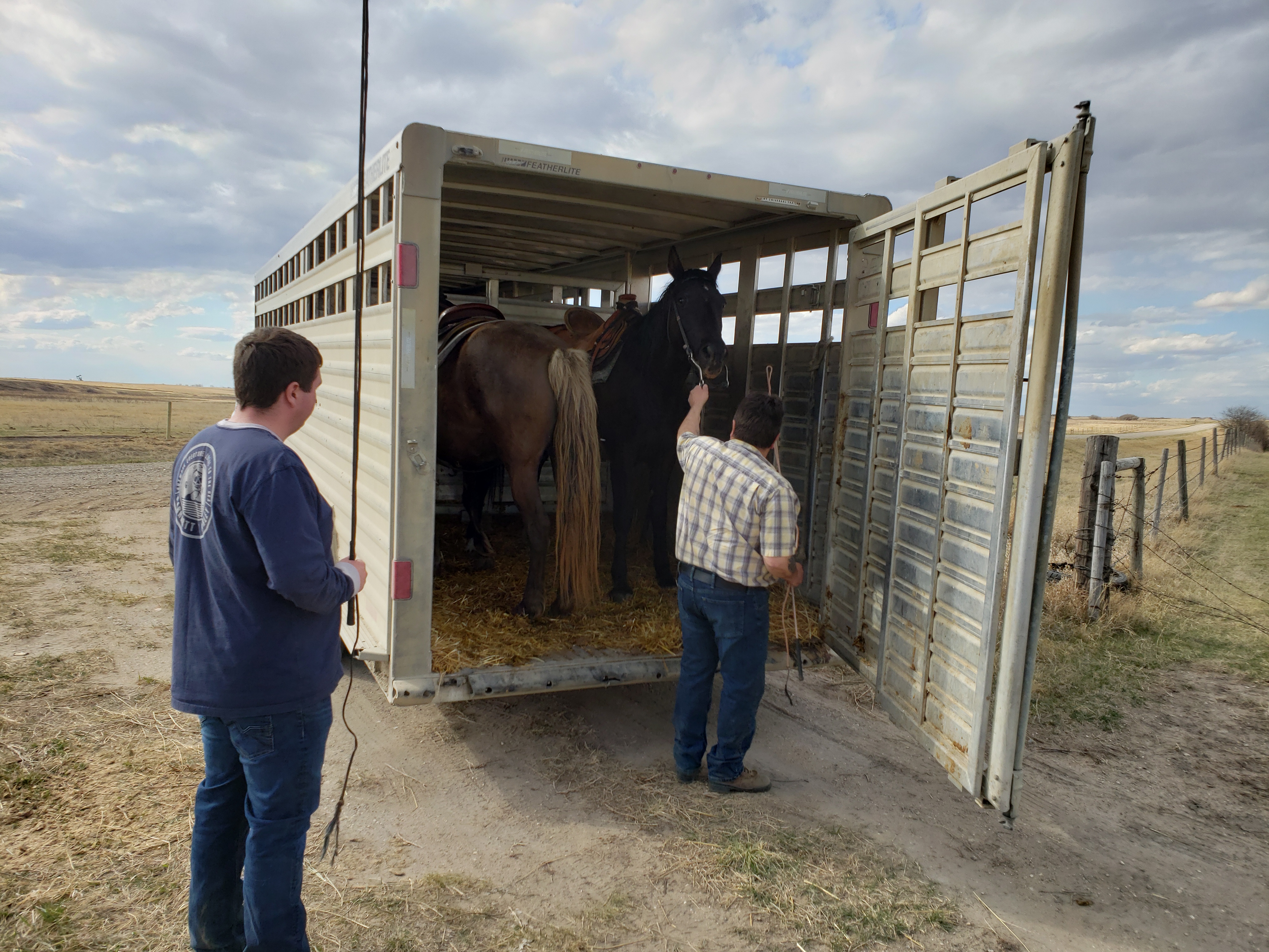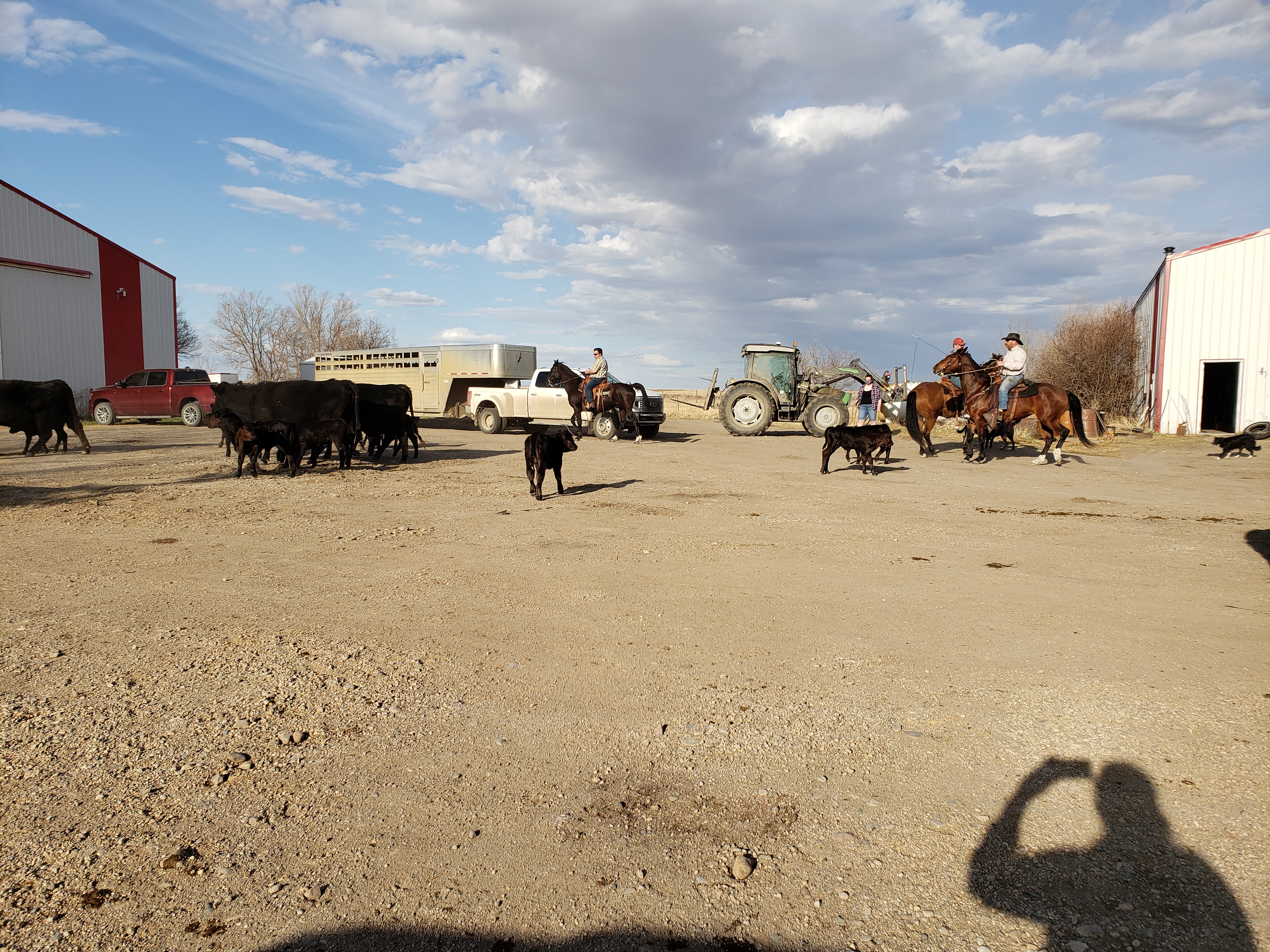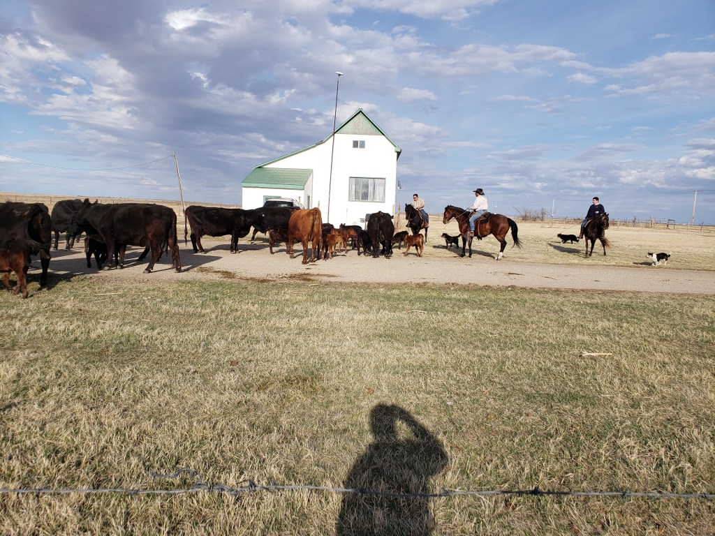 I took this photo while we were working at the chute. Morgan and Russell had shared a really scary moment with a cow outside the shed. When they came back in afterward they were laughing hard. Apparently after the danger had passed Morgan said to Russell, “do you want to trade underwear?”This is our cousin Dawson. He gave each animal an injectable dose of Vitamin A&D. He is fantastic help. Russ running the hydraulics to control the gates.Later on I joined the guys when they headed to the pasture. I got some pictures. Then I took the truck and trailer home, they came back with 80 pairs. Cousin Laurie saddling up.Laurie is ready to roll.Getting horses out of the trailer.Dawson is ready. Gates, tying and untying, a constant part of ranching.Russ and Bingo ready to roll.Morgan with the dogs. Knightwing in the back, Bingo in the middle, Maddie up front. Knightwing is meant to simply be our guard dog. However she has a desire to be working with Russ and has been improving as a cattle dog. This day she earned the “dog of the day” award. The trip home started off well for this herd but got frustrating. By this moment when the herd finally decided to turn off the road and into the yard we knew frustration. Animal behaviour is tough. Frustration was a theme yesterday, arising in casual conversation at lunch(which we ate in the garage), in connections I made in my own brain about my own behaviour, the experience of very vivid frustration for the whole crew together and then in a phone call with Gina in the evening she talked about it. I think it will be the subject of a future blog.Getting everyone into the corral took time.Here you can see Jill. She came out of quarantine to help in these moments and had been checking the cow and heifer herds all day for calving troubles. Its 6:59am now, on Sunday and she is out doing the morning check. Dawson shared this adorable photo of the barn cats with me.