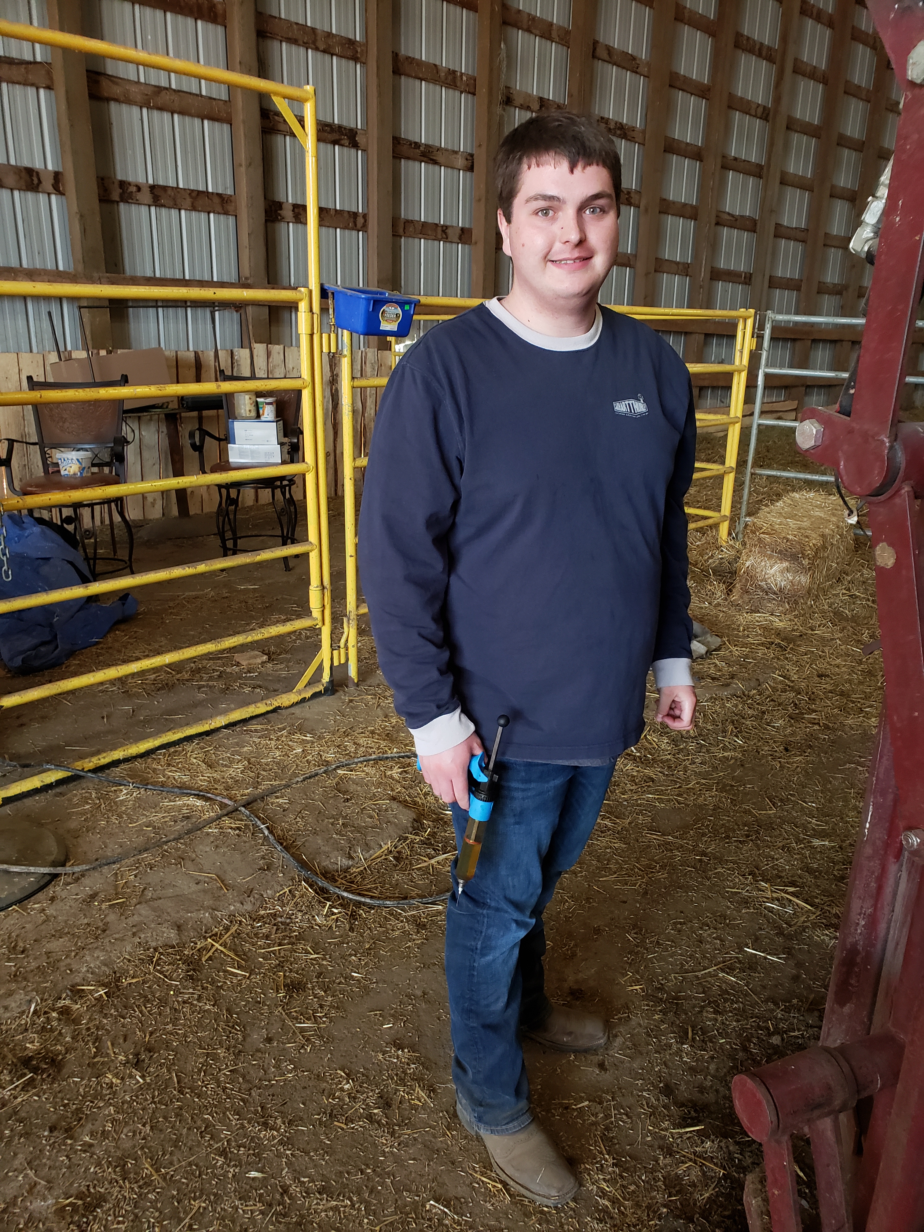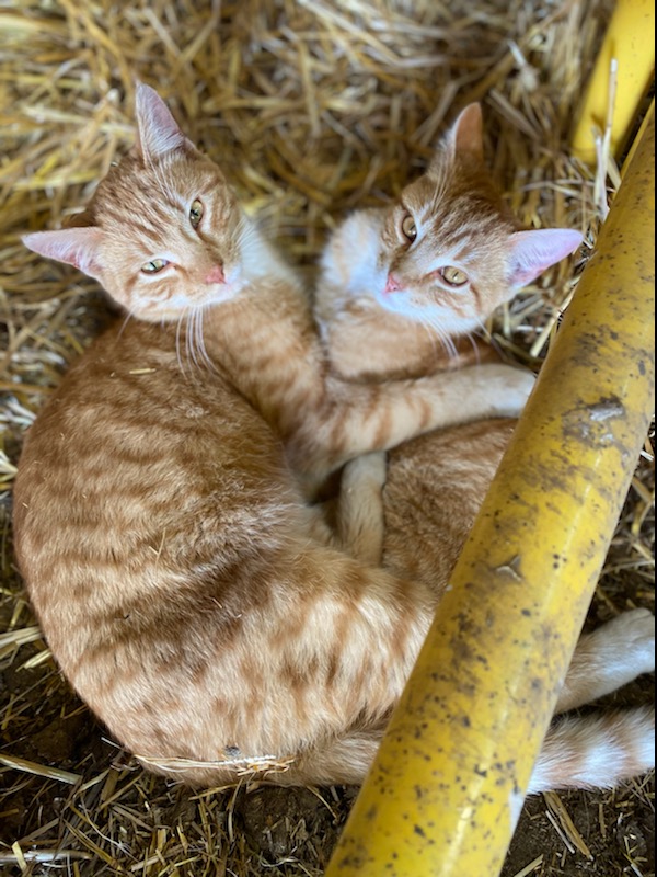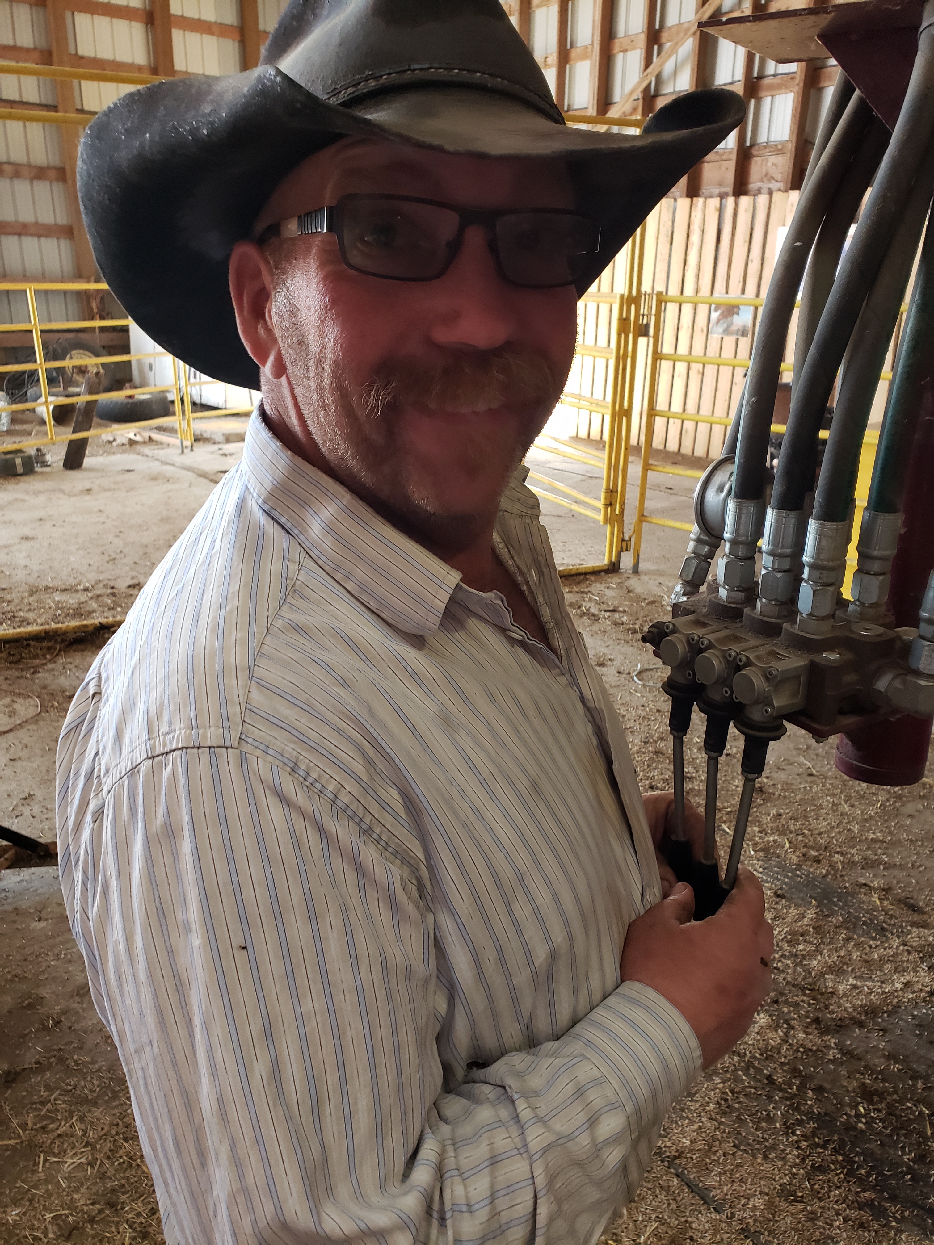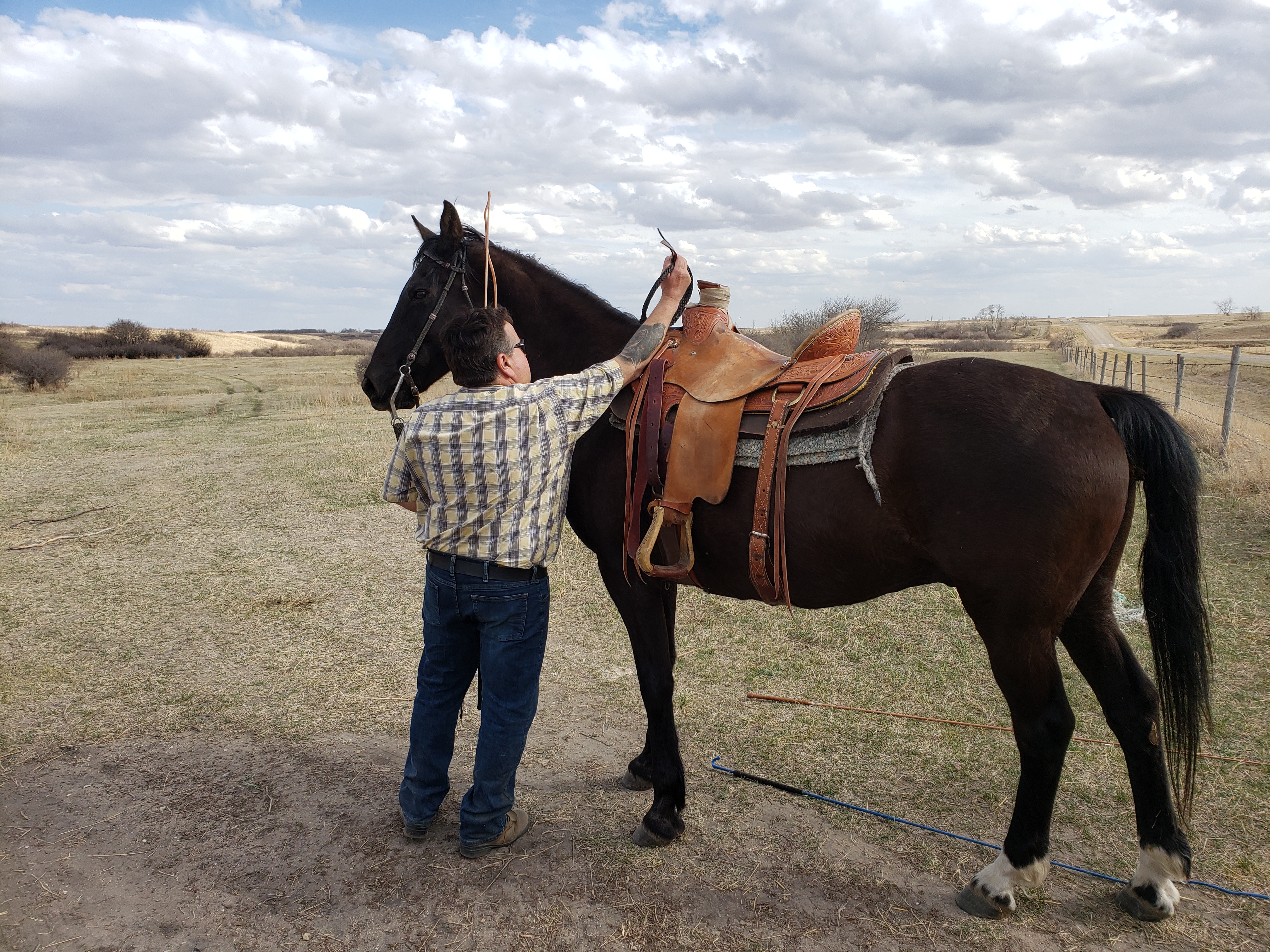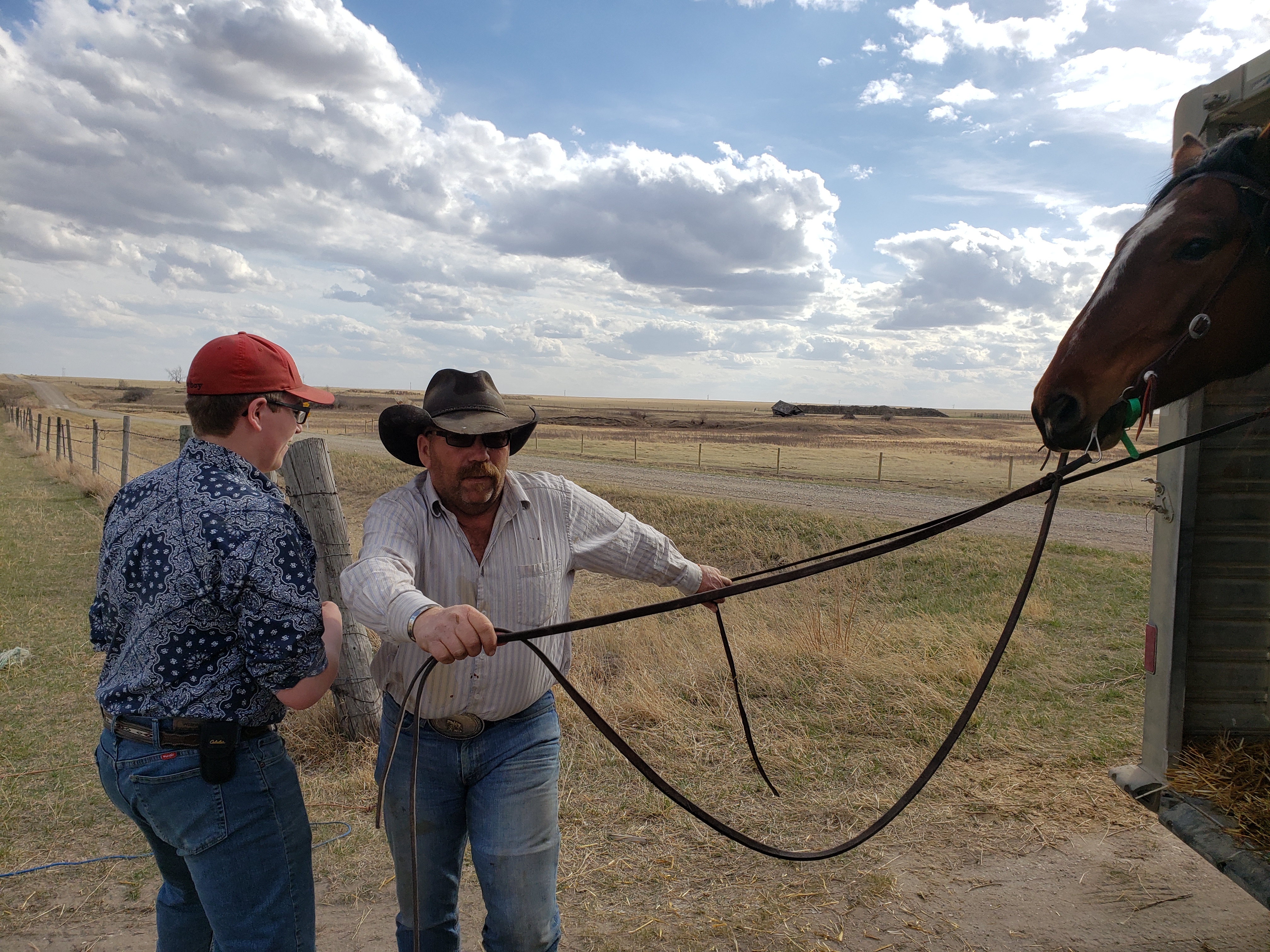 I took this photo while we were working at the chute. Morgan and Russell had shared a really scary moment with a cow outside the shed. When they came back in afterward they were laughing hard. Apparently after the danger had passed Morgan said to Russell, “do you want to trade underwear?”This is our cousin Dawson. He gave each animal an injectable dose of Vitamin A&D. He is fantastic help. Russ running the hydraulics to control the gates.Later on I joined the guys when they headed to the pasture. I got some pictures. Then I took the truck and trailer home, they came back with 80 pairs. Cousin Laurie saddling up.Laurie is ready to roll.Getting horses out of the trailer.Dawson is ready. Gates, tying and untying, a constant part of ranching.Russ and Bingo ready to roll.Morgan with the dogs. Knightwing in the back, Bingo in the middle, Maddie up front. Knightwing is meant to simply be our guard dog. However she has a desire to be working with Russ and has been improving as a cattle dog. This day she earned the “dog of the day” award. The trip home started off well for this herd but got frustrating. By this moment when the herd finally decided to turn off the road and into the yard we knew frustration. Animal behaviour is tough. Frustration was a theme yesterday, arising in casual conversation at lunch(which we ate in the garage), in connections I made in my own brain about my own behaviour, the experience of very vivid frustration for the whole crew together and then in a phone call with Gina in the evening she talked about it. I think it will be the subject of a future blog.Getting everyone into the corral took time.Here you can see Jill. She came out of quarantine to help in these moments and had been checking the cow and heifer herds all day for calving troubles. Its 6:59am now, on Sunday and she is out doing the morning check. Dawson shared this adorable photo of the barn cats with me.