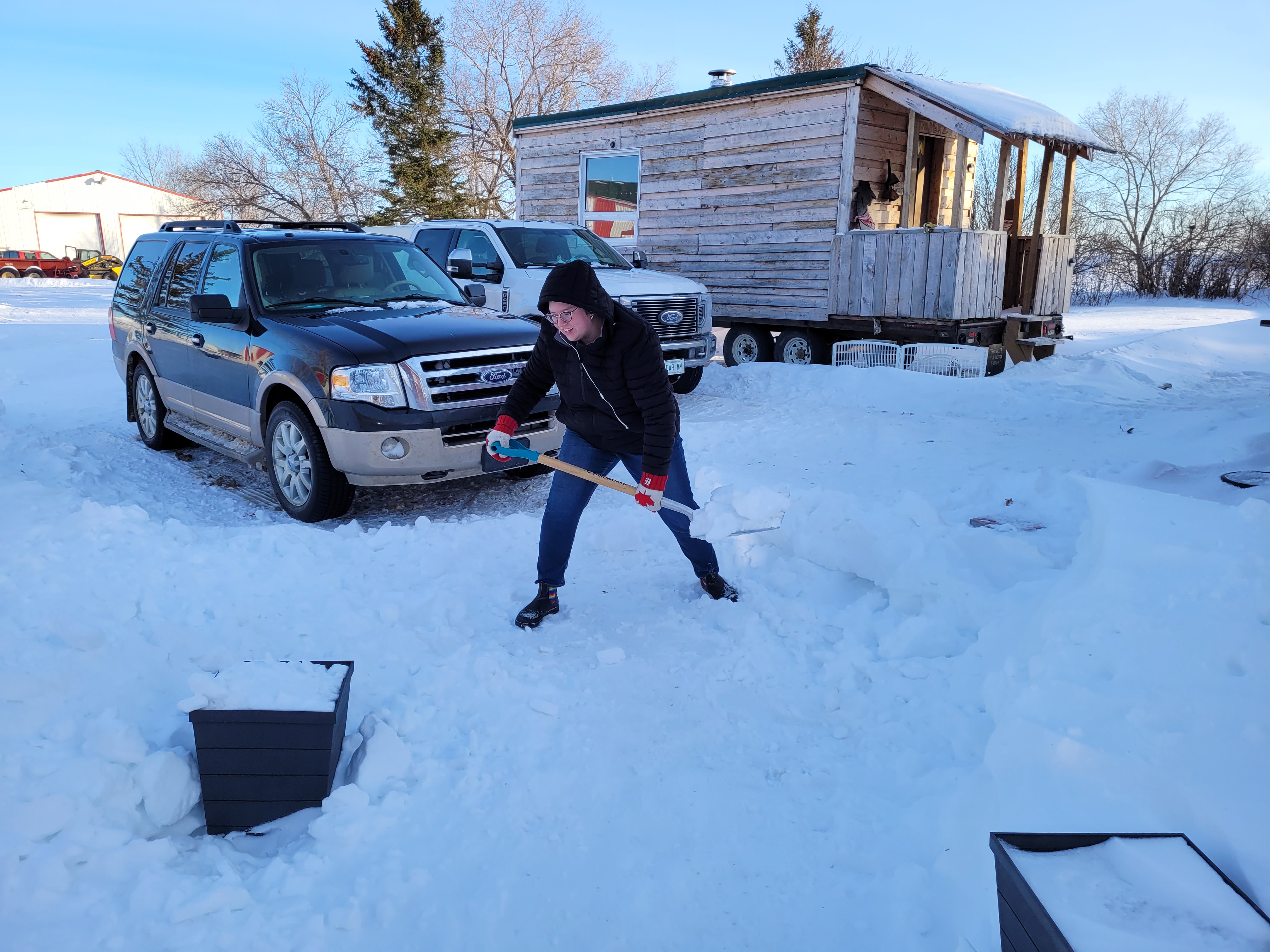 Meanwhile, back at the ranch, our kids, Clare and Ron were the crew handling calving and the weather had turned snowy overnight. Here is Gina dressed for the conditions.
