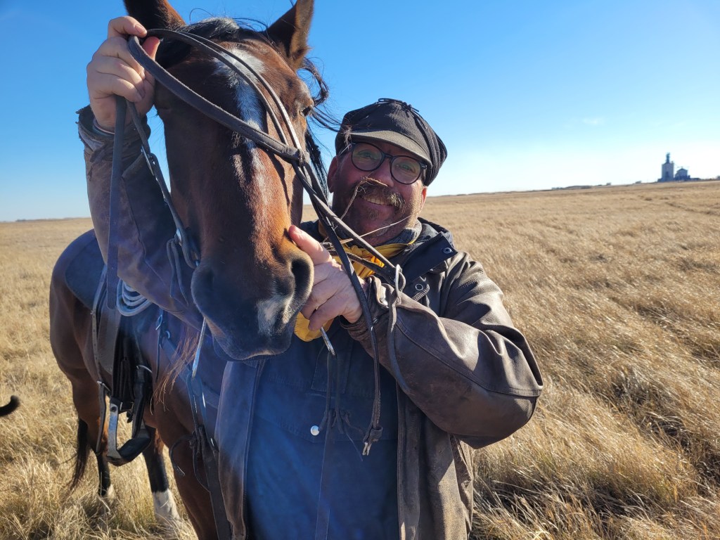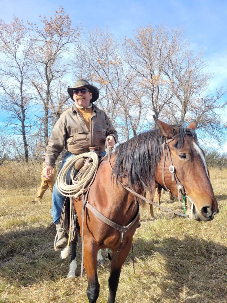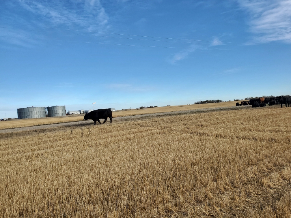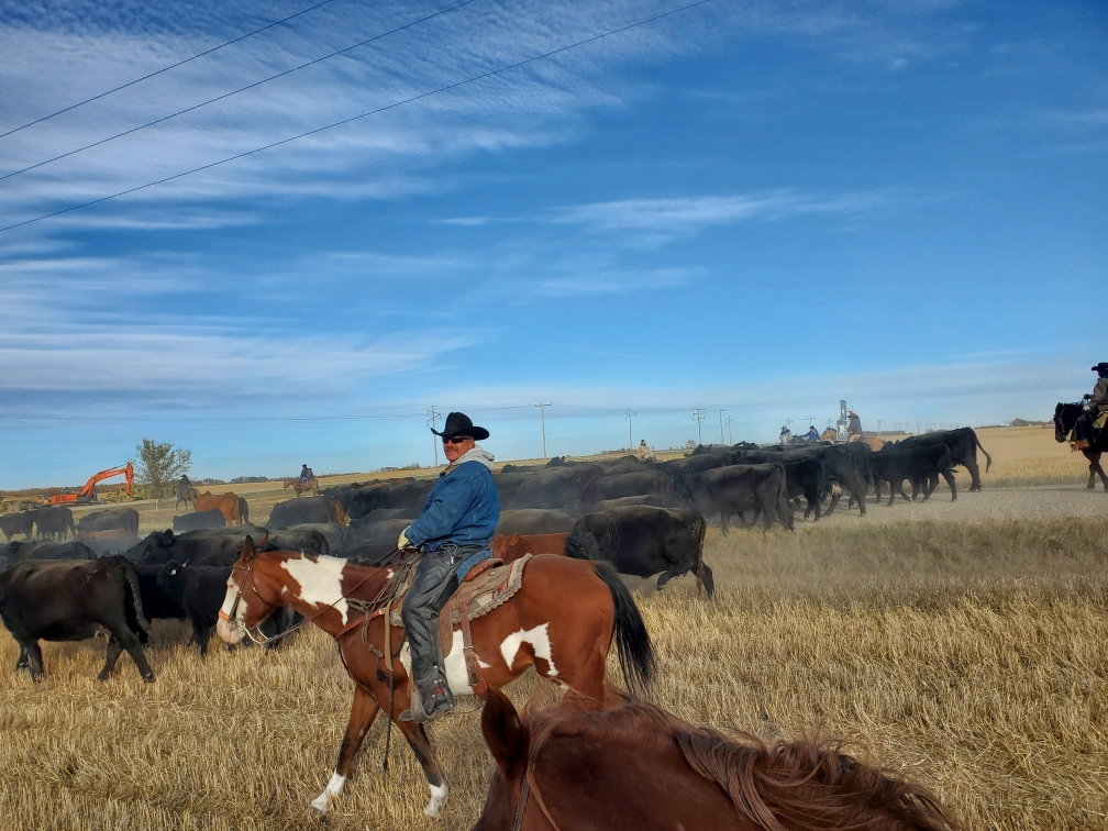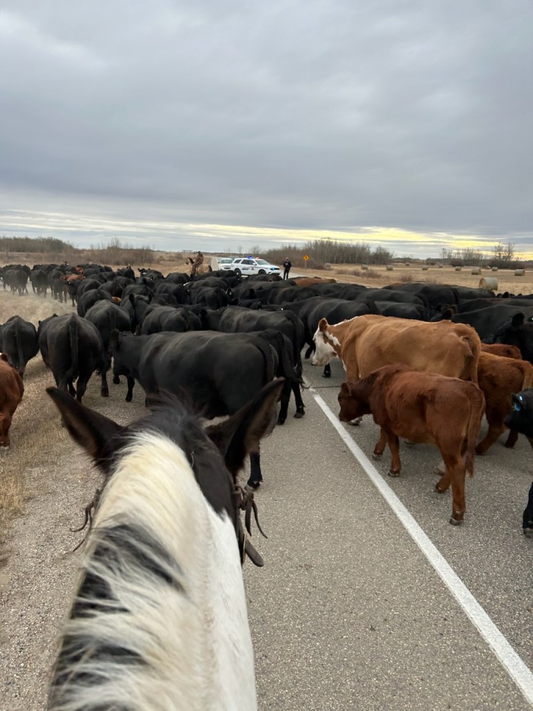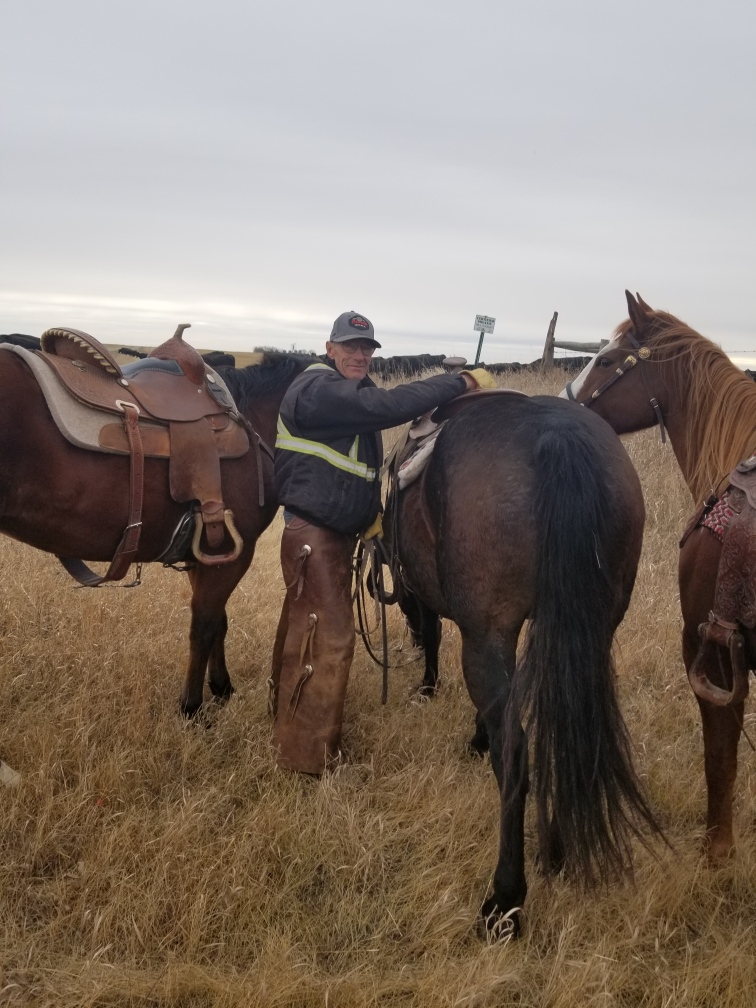 Around supper time, while moving pairs one of our grumpy cows charged and hit Russell’s horse and she hit it hard. This made Sundance buck and despite Russell’s best effort, staying on his horse so long and traveling such a distance that the grumpy cow was no longer a threat when Russ hit the ground, well, he hit the ground, and his glasses broke his fall, and broke, and cut him and the impact fractured his eye socket. Before the following picture was taken at 10:40 at night we had been to the Oxbow ER, Dr. Botha had stitched Russ up and ordered an immediate CT scan at Estevan to ensure there was no blain breed. He had also hooked us up with a specialist in Regina to assess vision issues. We had brought a farm truck to Oxbow, thinking we were only going for stitches, but when it became apparent we needed to go on, with my Bronco in the shop getting struts replaced, and not confident at all that the old farm truck would get us all the way to Regina I borrowed a vehicle from my friend Sandy in Oxbow. What a gift to have generous and supportive friends. We got the CT scan done and were in Regina by 1:30am.