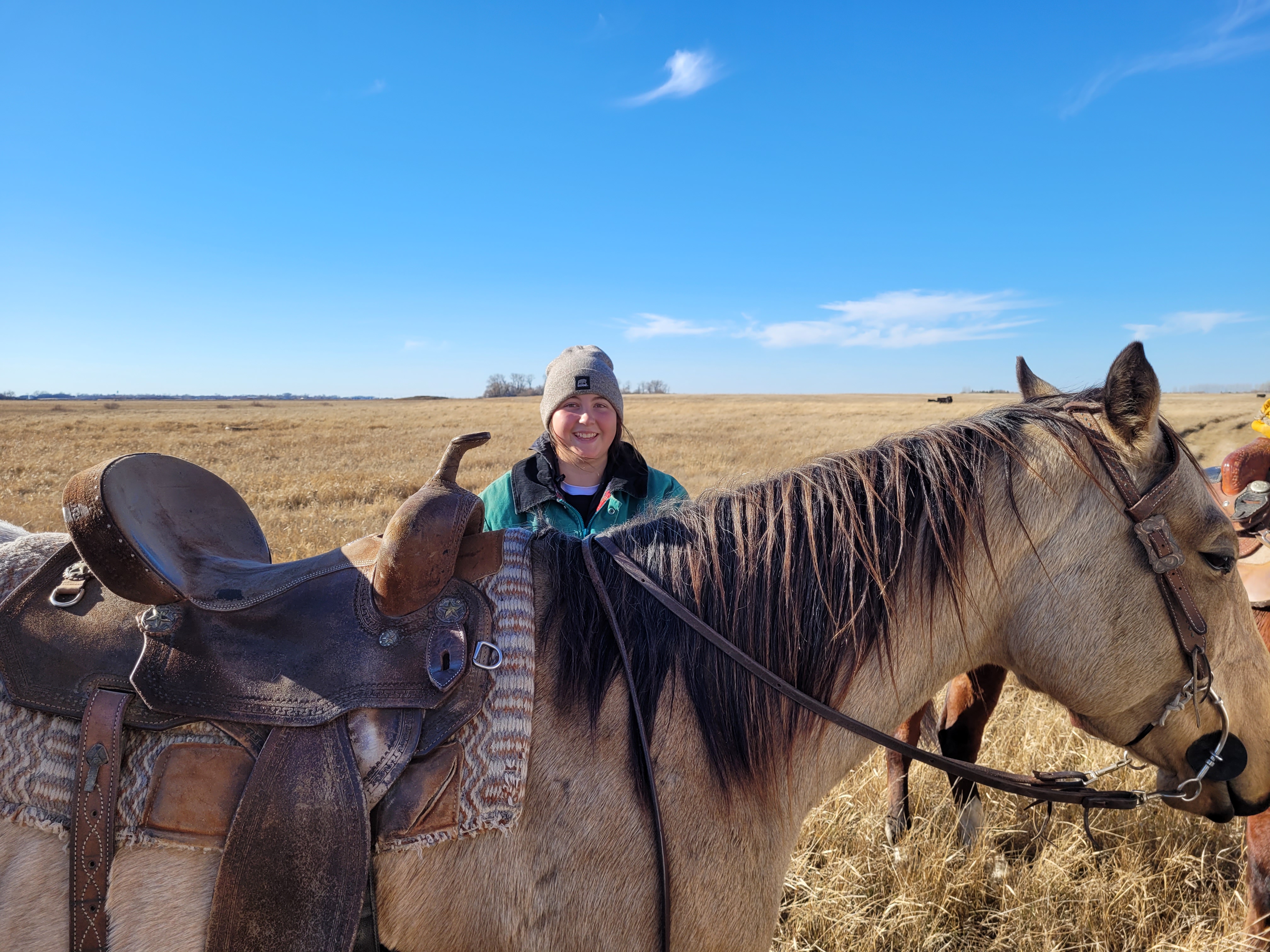 And introducing…….Clare Olver. After having our friend Anja with us for the last two calving seasons we realized how valuable extra help is with the work of the season. Clare was with us last summer for three weeks as we dealt with summer work, that led to Russ knowing she would be a good match for the work he needed help with this spring. Clare is quite amazing, she has the flexibility, stamina and humor to live the days we live, she has quickly become accustomed to working from a horse every day and she has won over the hearts of all the friends we have introduced her to.