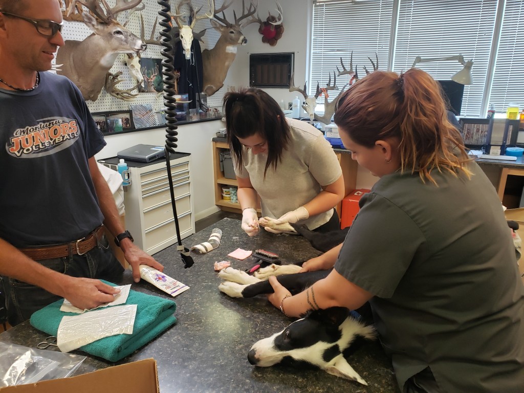 Another thing positive……….Coffee dog is doing great with her broken leg and getting great care from the vets. This week she needed some extra TLC at her splint check. Jenna had her just about purring.