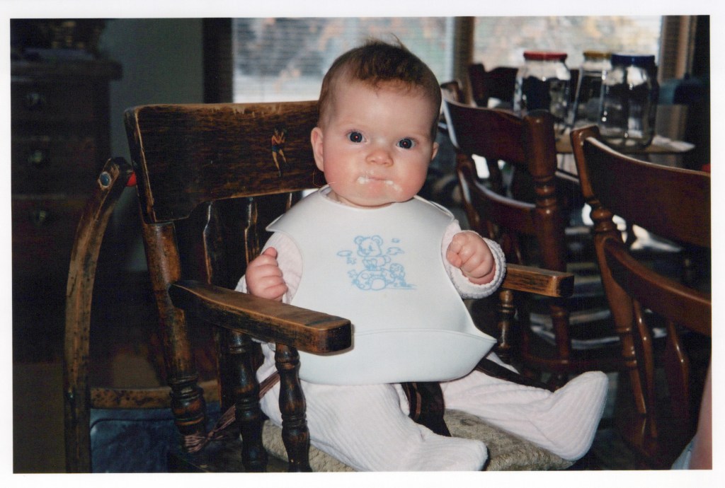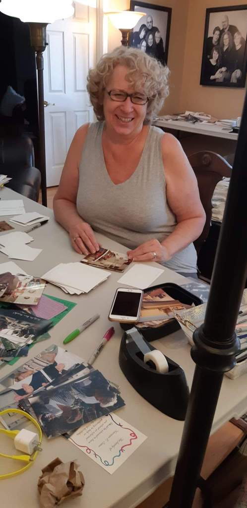 This is my Grandma Kyle. Since I wanted to write about humor I looked for pictures reflecting joy or laughter. This one was a real find. (My brother Bob in the background.)Here is Gina and I in the summer of 2002I saw this picture before it was scanned and couldn’t stop thinking about it. I looked for it in the files and was glad to find it. Jan catalogued well. That is Kathy Kyle feeling safe and loved in her Dad’s lap.This is captioned on the back as the first hour my twin sisters were home from the hospital. I turned two the next day. Look where I got to sit. On Mom’s lap. She always got it, what people needed to feel seen.I have seen this picture many times over the years but not with a growing teen boy in my house before. Tonight I looked at it and said, holy smokes, my son looks like my brother. I had never seen it before. Bob is 23 in this picture, a university graduate.You probably will not understand the significance of this picture unless you read a previous facebook or blog post, not sure which but here is “Gina in Buster’s highchair.”Linda at her work station.Me working on my piles. They started to feel overwhelming after a while.I have a picture of my Dad holding me on this day but had never seen this one before. My Grandpa Tubb was a photographer, he came over to take pictures of me the day I came home from the hospital. There were several beauties that were taken this day. It would be his last official shoot. Great hospitality was extended to us working women by my brother in law Stuart. We really appreciated it.Jan was what I would call “courageous”. The mental power she used to accomplish her task might have finished me off. She said she had it good because she only processed the keeper pictures. I’m not convinced. It looked hard to me.Margie at her work station, evidence of her mischievous and playful self is in this picture. She left some lingering humor for Linda to find after we all left.