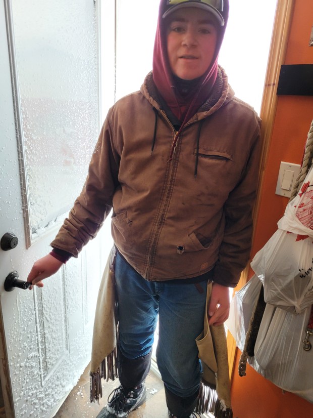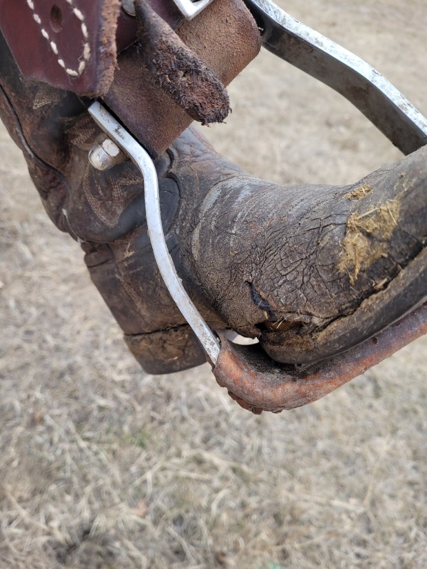 Russ and I headed to Brandon this week to pick up springs for our jeep. Russ is getting ready for calving season. The routines of that make his jeep one of his best friends. Also, he has been asking Jill and I to help him make his chaps more workable. They were made with solid leather to the bottom and with age were getting increasingly stiff and messing with his boots. We took heavy scissors and those chaps with us on our parts run to Brandon, I used much of my passenger time making the bottoms into fringe, which will work much better for Russ. I got a blister from my efforts. Is that not love? Meanwhile he drove terrible ice covered roads most of the way home, he kept us out of the ditch but barely. It was one of those warm and windy days where loose snow catches and freezes on the highway and we weren’t expecting it. Russ was thrilled with the chaps renovation.