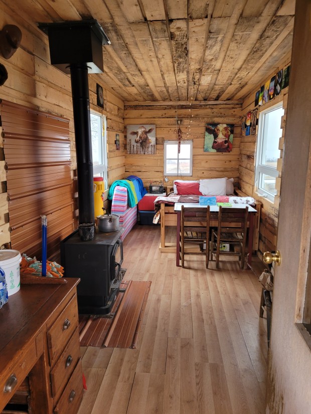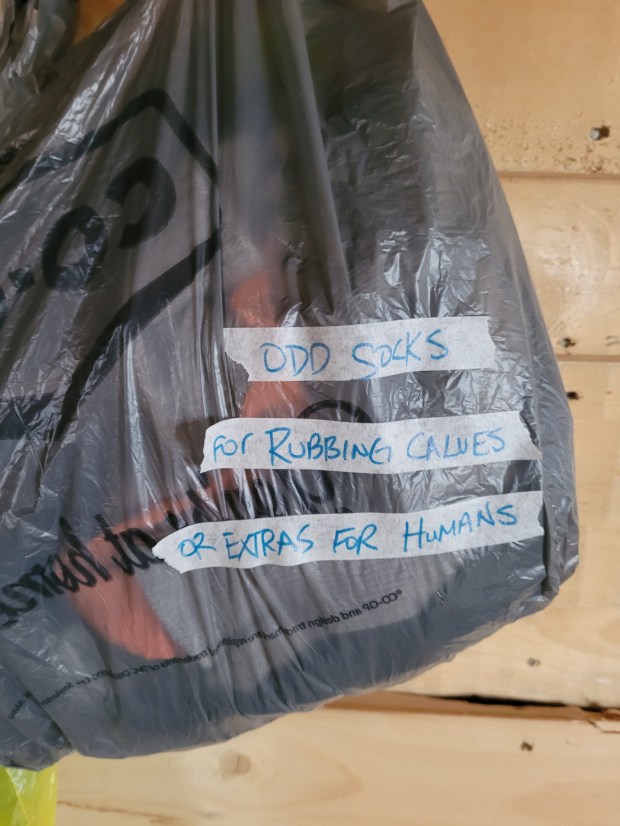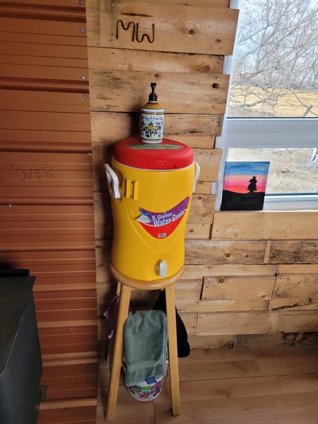 Just a goofy one to start off. I guess Russ is saving his warm boots for when things get really bad, but he pulled up to me on his horse when I saw him late in the afternoon yesterday and said, “do you think we should start a ‘go fund me’ so I can get new boots? I thought “maybe no!” to that question.Our day started off very normally in some ways, getting to the chores of the day, Russ suggested we eat brunch in town while there to get vet supplies for the days ahead. We lingered long at the restaurant when friends came in for their lunch and joined us. It was nice to live some very normal moments. A box waiting for me at the post office included the children’s book Russ is holding. I had just read it to him while we drove home, we both loved it, it was funny and creative. Plan to hear it read to you at a fall cow chase supper if you are part of the crew.While at the restaurant we sat with a notebook and brainstormed every item we could need at the cottage. When our friends joined us they added a couple items to the list. It was pretty comprehensive. My main worry was water, because I needed containers for the house and cottage. Once home I stumbled on this container that I have never used on the trail and was tempted to give away. I forgot I had it. I was so proud of myself for the wash station I could create. This is wash water on tap, with face cloths and hand towels on the rungs and wash pails under neath the stool. The stool came from my home in Saskatoon, I think of it as my Dad’s stool, he spent much time perched on it chatting with Mom in the kitchen in later years. I use it for music gigs. It comforts me to have this used for another great purpose.Firewood in place in the cowboy cottage.The cottage as I left it, prepped for use. What would they call this on MASH? This was taken at 5:30 yesterday. As I came out of the cottage Russ and Morgan were arriving to round up the herd and tuck them into the calving yard, a corner of the calving pasture that has shelter on three sides and is right beside the cowboy cottage.Morgan getting his tack in place and while the horse was antsy, Morgan was calm as a cucumber. He is not upset about his days in grade 9 being cut short by the school closure announced earlier this day.After supper Morgan and I whipped back to the cottage because I had forgotten to take Russell’s changes of clothes with me earlier. The snow had started two hours earlier but had not yet accumulated to much at this point.I awoke at 7:05 today when Russ phoned. He had checked the heifers in the shed here and no calves had been born overnight. He told me he had a chat with them, they are to hold on til next Wednesday when it is finally seasonally warm. Lets see if they listen. Heifers are new Mom’s, they can have trouble with birthing as its their first time. We have 57, three have calved, we have many to go. Russ was with the rest of the herd and found this calf, it had been licked off, maybe by its Mom but then abandoned and it was cold and wet. So as I sit here and write, I have done a few minutes sitting with my hands over its tail and ears hoping to Morg came in this morning to get his chaps.The view here an hour and a half ago. The drifts in front of the cars have accumulated quite a bit since then. The wind is clearing the roads so far so we have been able to travel back and forth to the pasture so far today.