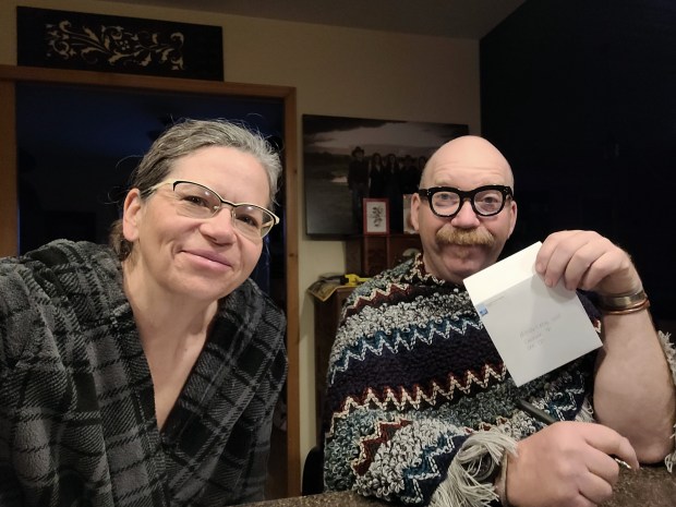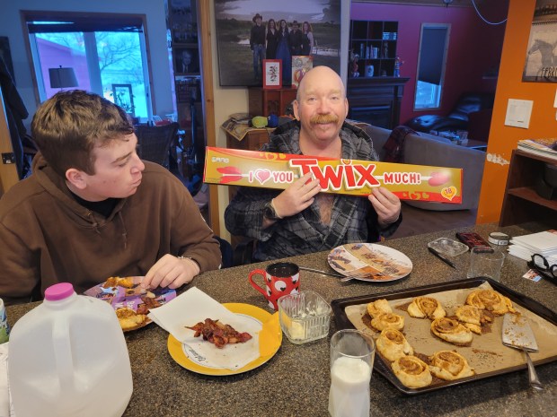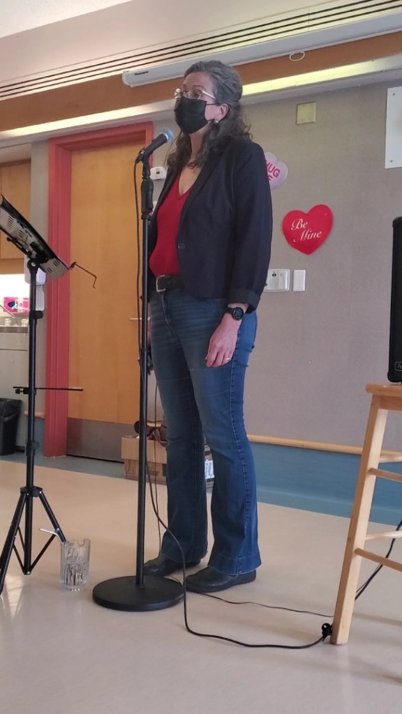We had to work at getting the cards ready in batches. We were under time pressure if we were to have them in mailboxes by the 14th. This was an early morning work bee. I got up first and borrowed Russell’s robe. When he got up and wanted something warm to sit in he grabbed what he could see, my poncho. I love this quirky picture of him, he has an Elton John vibe going on with those fancy reading glasses he is wearing and a draping and fringy garment. He gave me permission to share this photo. It is our tradition to eat cinnamon buns and bacon for breakfast on Valentines Day. In years past we set the table with a few special touches. With just the three of us home it was breakfast on the counter instead. Thanks to a January 4th trip to Minot, where the Valentines candy displays were up and full of such fun things, I had this twix bar set in my closet just waiting for this day! The kids and Ron and a few of our people in town got treats too.Russell took this picture of me in the afternoon on Valentines Day. I was entertaining at one of our local nursing homes. It was really a fun time for me. I love singing, the songs were well received, old friends were there and it felt right.